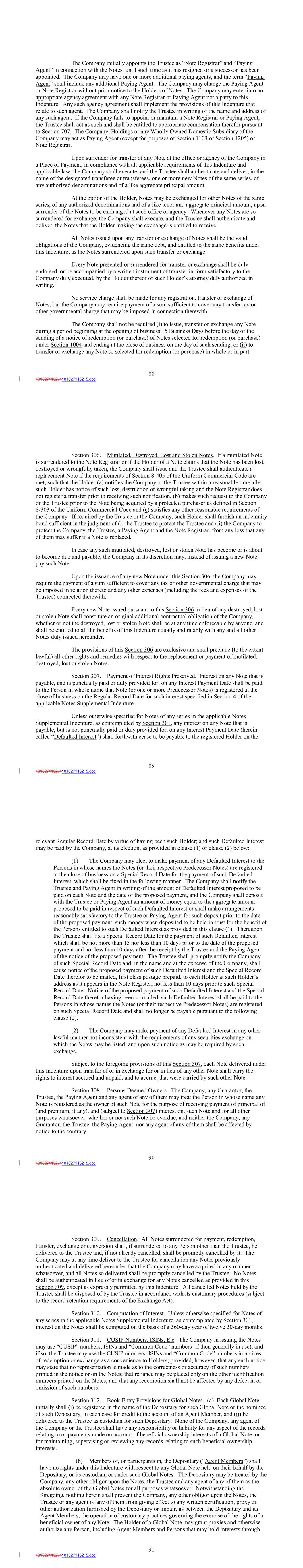 The Company initially appoints the Trustee as “Note Registrar” and “Paying Agent” in connection with the Notes, until such time as it has resigned or a successor has been appointed. The Company may have one or more additional paying agents, and the term “Paying Agent” shall include any additional Paying Agent. The Company may change the Paying Agent or Note Registrar without prior notice to the Holders of Notes. The Company may enter into an appropriate agency agreement with any Note Registrar or Paying Agent not a party to this Indenture. Any such agency agreement shall implement the provisions of this Indenture that relate to such agent. The Company shall notify the Trustee in writing of the name and address of any such agent. If the Company fails to appoint or maintain a Note Registrar or Paying Agent, the Trustee shall act as such and shall be entitled to appropriate compensation therefor pursuant to Section 707. The Company, Holdings or any Wholly Owned Domestic Subsidiary of the Company may act as Paying Agent (except for purposes of Section 1103 or Section 1205) or Note Registrar. Upon surrender for transfer of any Note at the office or agency of the Company in a Place of Payment, in compliance with all applicable requirements of this Indenture and applicable law, the Company shall execute, and the Trustee shall authenticate and deliver, in the name of the designated transferee or transferees, one or more new Notes of the same series, of any authorized denominations and of a like aggregate principal amount. At the option of the Holder, Notes may be exchanged for other Notes of the same series, of any authorized denominations and of a like tenor and aggregate principal amount, upon surrender of the Notes to be exchanged at such office or agency. Whenever any Notes are so surrendered for exchange, the Company shall execute, and the Trustee shall authenticate and deliver, the Notes that the Holder making the exchange is entitled to receive. All Notes issued upon any transfer or exchange of Notes shall be the valid obligations of the Company, evidencing the same debt, and entitled to the same benefits under this Indenture, as the Notes surrendered upon such transfer or exchange. Every Note presented or surrendered for transfer or exchange shall be duly endorsed, or be accompanied by a written instrument of transfer in form satisfactory to the Company duly executed, by the Holder thereof or such Holder’s attorney duly authorized in writing. No service charge shall be made for any registration, transfer or exchange of Notes, but the Company may require payment of a sum sufficient to cover any transfer tax or other governmental charge that may be imposed in connection therewith. The Company shall not be required (i) to issue, transfer or exchange any Note during a period beginning at the opening of business 15 Business Days before the day of the sending of a notice of redemption (or purchase) of Notes selected for redemption (or purchase) under Section 1004 and ending at the close of business on the day of such sending, or (ii) to transfer or exchange any Note so selected for redemption (or purchase) in whole or in part. 88 1010271152v11010271152_5.doc Section 306. Mutilated, Destroyed, Lost and Stolen Notes. If a mutilated Note is surrendered to the Note Registrar or if the Holder of a Note claims that the Note has been lost, destroyed or wrongfully taken, the Company shall issue and the Trustee shall authenticate a replacement Note if the requirements of Section 8-405 of the Uniform Commercial Code are met, such that the Holder (a) notifies the Company or the Trustee within a reasonable time after such Holder has notice of such loss, destruction or wrongful taking and the Note Registrar does not register a transfer prior to receiving such notification, (b) makes such request to the Company or the Trustee prior to the Note being acquired by a protected purchaser as defined in Section 8-303 of the Uniform Commercial Code and (c) satisfies any other reasonable requirements of the Company. If required by the Trustee or the Company, such Holder shall furnish an indemnity bond sufficient in the judgment of (i) the Trustee to protect the Trustee and (ii) the Company to protect the Company, the Trustee, a Paying Agent and the Note Registrar, from any loss that any of them may suffer if a Note is replaced. In case any such mutilated, destroyed, lost or stolen Note has become or is about to become due and payable, the Company in its discretion may, instead of issuing a new Note, pay such Note. Upon the issuance of any new Note under this Section 306, the Company may require the payment of a sum sufficient to cover any tax or other governmental charge that may be imposed in relation thereto and any other expenses (including the fees and expenses of the Trustee) connected therewith. Every new Note issued pursuant to this Section 306 in lieu of any destroyed, lost or stolen Note shall constitute an original additional contractual obligation of the Company, whether or not the destroyed, lost or stolen Note shall be at any time enforceable by anyone, and shall be entitled to all the benefits of this Indenture equally and ratably with any and all other Notes duly issued hereunder. The provisions of this Section 306 are exclusive and shall preclude (to the extent lawful) all other rights and remedies with respect to the replacement or payment of mutilated, destroyed, lost or stolen Notes. Section 307. Payment of Interest Rights Preserved. Interest on any Note that is payable, and is punctually paid or duly provided for, on any Interest Payment Date shall be paid to the Person in whose name that Note (or one or more Predecessor Notes) is registered at the close of business on the Regular Record Date for such interest specified in Section 4 of the applicable Notes Supplemental Indenture. Unless otherwise specified for Notes of any series in the applicable Notes Supplemental Indenture, as co
