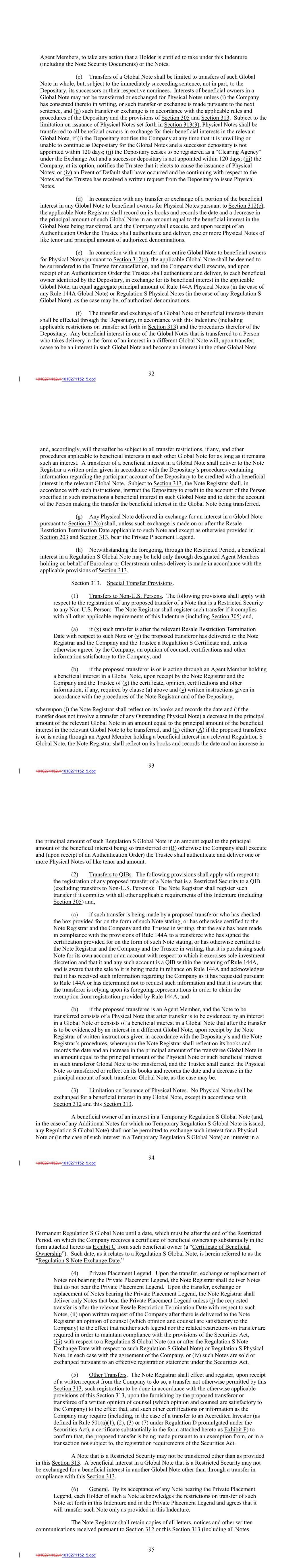 Agent Members, to take any action that a Holder is entitled to take under this Indenture (including the Note Security Documents) or the Notes. (c) Transfers of a Global Note shall be limited to transfers of such Global Note in whole, but, subject to the immediately succeeding sentence, not in part, to the Depositary, its successors or their respective nominees. Interests of beneficial owners in a Global Note may not be transferred or exchanged for Physical Notes unless (i) the Company has consented thereto in writing, or such transfer or exchange is made pursuant to the next sentence, and (ii) such transfer or exchange is in accordance with the applicable rules and procedures of the Depositary and the provisions of Section 305 and Section 313. Subject to the limitation on issuance of Physical Notes set forth in Section 313(3), Physical Notes shall be transferred to all beneficial owners in exchange for their beneficial interests in the relevant Global Note, if (i) the Depositary notifies the Company at any time that it is unwilling or unable to continue as Depositary for the Global Notes and a successor depositary is not appointed within 120 days; (ii) the Depositary ceases to be registered as a “Clearing Agency” under the Exchange Act and a successor depositary is not appointed within 120 days; (iii) the Company, at its option, notifies the Trustee that it elects to cause the issuance of Physical Notes; or (iv) an Event of Default shall have occurred and be continuing with respect to the Notes and the Trustee has received a written request from the Depositary to issue Physical Notes. (d) In connection with any transfer or exchange of a portion of the beneficial interest in any Global Note to beneficial owners for Physical Notes pursuant to Section 312(c), the applicable Note Registrar shall record on its books and records the date and a decrease in the principal amount of such Global Note in an amount equal to the beneficial interest in the Global Note being transferred, and the Company shall execute, and upon receipt of an Authentication Order the Trustee shall authenticate and deliver, one or more Physical Notes of like tenor and principal amount of authorized denominations. (e) In connection with a transfer of an entire Global Note to beneficial owners for Physical Notes pursuant to Section 312(c), the applicable Global Note shall be deemed to be surrendered to the Trustee for cancellation, and the Company shall execute, and upon receipt of an Authentication Order the Trustee shall authenticate and deliver, to each beneficial owner identified by the Depositary, in exchange for its beneficial interest in the applicable Global Note, an equal aggregate principal amount of Rule 144A Physical Notes (in the case of any Rule 144A Global Note) or Regulation S Physical Notes (in the case of any Regulation S Global Note), as the case may be, of authorized denominations. (f) The transfer and exchange of a Global Note or beneficial interests therein shall be effected through the Depositary, in accordance with this Indenture (including applicable restrictions on transfer set forth in Section 313) and the procedures therefor of the Depositary. Any beneficial interest in one of the Global Notes that is transferred to a Person who takes delivery in the form of an interest in a different Global Note will, upon transfer, cease to be an interest in such Global Note and become an interest in the other Global Note 92 1010271152v11010271152_5.doc and, accordingly, will thereafter be subject to all transfer restrictions, if any, and other procedures applicable to beneficial interests in such other Global Note for as long as it remains such an interest. A transferor of a beneficial interest in a Global Note shall deliver to the Note Registrar a written order given in accordance with the Depositary’s procedures containing information regarding the participant account of the Depositary to be credited with a beneficial interest in the relevant Global Note. Subject to Section 313, the Note Registrar shall, in accordance with such instructions, instruct the Depositary to credit to the account of the Person specified in such instructions a beneficial interest in such Global Note and to debit the account of the Person making the transfer the beneficial interest in the Global Note being transferred. (g) Any Physical Note delivered in exchange for an interest in a Global Note pursuant to Section 312(c) shall, unless such exchange is made on or after the Resale Restriction Termination Date applicable to such Note and except as otherwise provided in Section 203 and Section 313, bear the Private Placement Legend. (h) Notwithstanding the foregoing, through the Restricted Period, a beneficial interest in a Regulation S Global Note may be held only through designated Agent Members holding on behalf of Euroclear or Clearstream unless delivery is made in accordance with the applicable provisions of Section 313. Section 313. Special Transfer Provisions. (1) Transfers to Non-U.S. Persons. The following provisions shall apply with respect to the registration of any proposed transfer of a Note that is a Restricted Security to any Non-U.S. Person: The Note Registrar shall register such transfer if it complies with all other applicable requirements of this Indenture (including Section 305) and, (a) if (x) such transfer is after the relevant Resale Restriction Termination Date with respect to such Note or (y) the proposed transferor has delivered to the Note Registrar and the Company and the Trustee a Regulation S Certificate and, unless otherwise agreed by the Company, an opinion of counsel, certifications and other information satisfactory to the Company, and (b) if the proposed transferor is or is acting through an Agent Member holding a beneficial interest in a Global Note, upon receipt by the Note Registrar and the Company and the Trustee of (x) the certificate, opinion, certifications and other information, if any, req