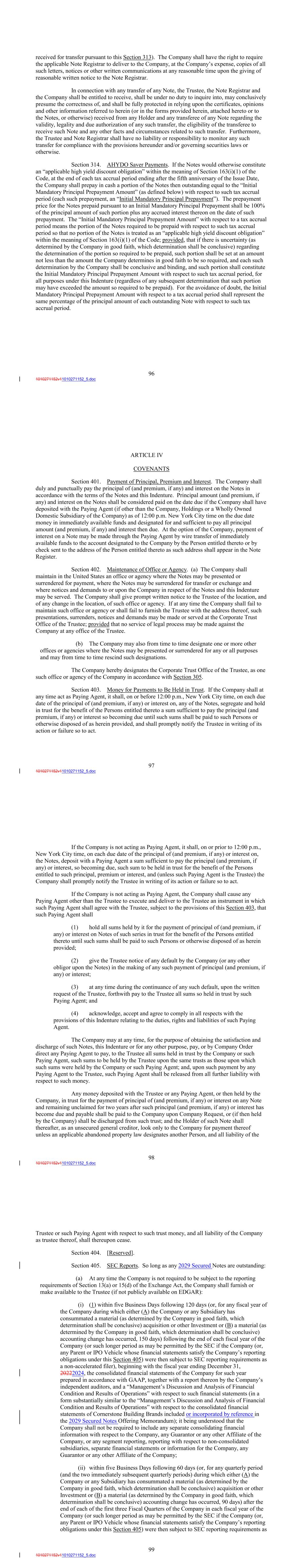 received for transfer pursuant to this Section 313). The Company shall have the right to require the applicable Note Registrar to deliver to the Company, at the Company’s expense, copies of all such letters, notices or other written communications at any reasonable time upon the giving of reasonable written notice to the Note Registrar. In connection with any transfer of any Note, the Trustee, the Note Registrar and the Company shall be entitled to receive, shall be under no duty to inquire into, may conclusively presume the correctness of, and shall be fully protected in relying upon the certificates, opinions and other information referred to herein (or in the forms provided herein, attached hereto or to the Notes, or otherwise) received from any Holder and any transferee of any Note regarding the validity, legality and due authorization of any such transfer, the eligibility of the transferee to receive such Note and any other facts and circumstances related to such transfer. Furthermore, the Trustee and Note Registrar shall have no liability or responsibility to monitor any such transfer for compliance with the provisions hereunder and/or governing securities laws or otherwise. Section 314. AHYDO Saver Payments. If the Notes would otherwise constitute an “applicable high yield discount obligation” within the meaning of Section 163(i)(1) of the Code, at the end of each tax accrual period ending after the fifth anniversary of the Issue Date, the Company shall prepay in cash a portion of the Notes then outstanding equal to the “Initial Mandatory Principal Prepayment Amount” (as defined below) with respect to such tax accrual period (each such prepayment, an “Initial Mandatory Principal Prepayment”). The prepayment price for the Notes prepaid pursuant to an Initial Mandatory Principal Prepayment shall be 100% of the principal amount of such portion plus any accrued interest thereon on the date of such prepayment. The “Initial Mandatory Principal Prepayment Amount” with respect to a tax accrual period means the portion of the Notes required to be prepaid with respect to such tax accrual period so that no portion of the Notes is treated as an “applicable high yield discount obligation” within the meaning of Section 163(i)(1) of the Code; provided, that if there is uncertainty (as determined by the Company in good faith, which determination shall be conclusive) regarding the determination of the portion so required to be prepaid, such portion shall be set at an amount not less than the amount the Company determines in good faith to be so required, and each such determination by the Company shall be conclusive and binding, and such portion shall constitute the Initial Mandatory Principal Prepayment Amount with respect to such tax accrual period, for all purposes under this Indenture (regardless of any subsequent determination that such portion may have exceeded the amount so required to be prepaid). For the avoidance of doubt, the Initial Mandatory Principal Prepayment Amount with respect to a tax accrual period shall represent the same percentage of the principal amount of each outstanding Note with respect to such tax accrual period. 96 1010271152v11010271152_5.doc ARTICLE IV COVENANTS Section 401. Payment of Principal, Premium and Interest. The Company shall duly and punctually pay the principal of (and premium, if any) and interest on the Notes in accordance with the terms of the Notes and this Indenture. Principal amount (and premium, if any) and interest on the Notes shall be considered paid on the date due if the Company shall have deposited with the Paying Agent (if other than the Company, Holdings or a Wholly Owned Domestic Subsidiary of the Company) as of 12:00 p.m. New York City time on the due date money in immediately available funds and designated for and sufficient to pay all principal amount (and premium, if any) and interest then due. At the option of the Company, payment of interest on a Note may be made through the Paying Agent by wire transfer of immediately available funds to the account designated to the Company by the Person entitled thereto or by check sent to the address of the Person entitled thereto as such address shall appear in the Note Register. Section 402. Maintenance of Office or Agency. (a) The Company shall maintain in the United States an office or agency where the Notes may be presented or surrendered for payment, where the Notes may be surrendered for transfer or exchange and where notices and demands to or upon the Company in respect of the Notes and this Indenture may be served. The Company shall give prompt written notice to the Trustee of the location, and of any change in the location, of such office or agency. If at any time the Company shall fail to maintain such office or agency or shall fail to furnish the Trustee with the address thereof, such presentations, surrenders, notices and demands may be made or served at the Corporate Trust Office of the Trustee; provided that no service of legal process may be made against the Company at any office of the Trustee. (b) The Company may also from time to time designate one or more other offices or agencies where the Notes may be presented or surrendered for any or all purposes and may from time to time rescind such designations. The Company hereby designates the Corporate Trust Office of the Trustee, as one such office or agency of the Company in accordance with Section 305. Section 403. Money for Payments to Be Held in Trust. If the Company shall at any time act as Paying Agent, it shall, on or before 12:00 p.m., New York City time, on each due date of the principal of (and premium, if any) or interest on, any of the Notes, segregate and hold in trust for the benefit of the Persons entitled thereto a sum sufficient to pay the principal (and premium, if any) or interest so becoming due until such sums shall be paid to such Persons or otherwise disposed of as herein provided, and sh