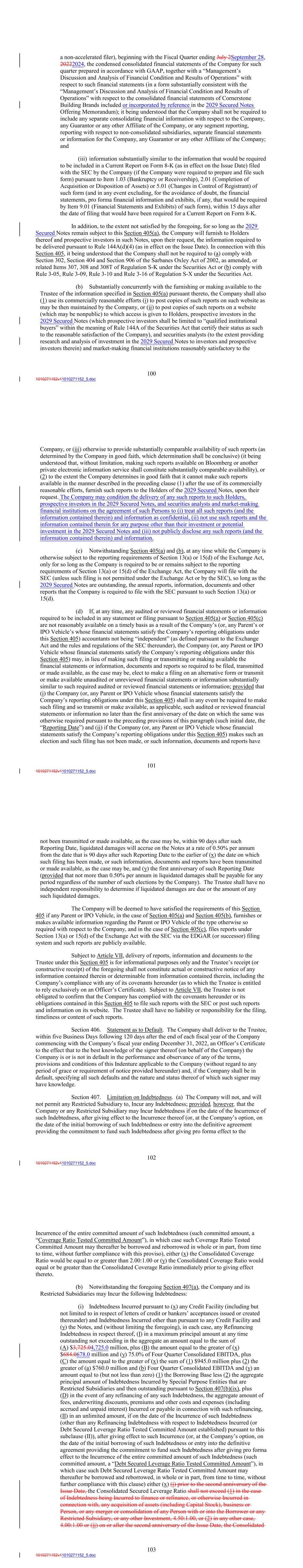 a non-accelerated filer), beginning with the Fiscal Quarter ending July 2September 28, 20222024, the condensed consolidated financial statements of the Company for such quarter prepared in accordance with GAAP, together with a “Management’s Discussion and Analysis of Financial Condition and Results of Operations” with respect to such financial statements (in a form substantially consistent with the “Management’s Discussion and Analysis of Financial Condition and Results of Operations” with respect to the consolidated financial statements of Cornerstone Building Brands included or incorporated by reference in the 2029 Secured Notes Offering Memorandum); it being understood that the Company shall not be required to include any separate consolidating financial information with respect to the Company, any Guarantor or any other Affiliate of the Company, or any segment reporting, reporting with respect to non-consolidated subsidiaries, separate financial statements or information for the Company, any Guarantor or any other Affiliate of the Company; and (iii) information substantially similar to the information that would be required to be included in a Current Report on Form 8-K (as in effect on the Issue Date) filed with the SEC by the Company (if the Company were required to prepare and file such form) pursuant to Item 1.03 (Bankruptcy or Receivership), 2.01 (Completion of Acquisition or Disposition of Assets) or 5.01 (Changes in Control of Registrant) of such form (and in any event excluding, for the avoidance of doubt, the financial statements, pro forma financial information and exhibits, if any, that would be required by Item 9.01 (Financial Statements and Exhibits) of such form), within 15 days after the date of filing that would have been required for a Current Report on Form 8-K. In addition, to the extent not satisfied by the foregoing, for so long as the 2029 Secured Notes remain subject to this Section 405(a), the Company will furnish to Holders thereof and prospective investors in such Notes, upon their request, the information required to be delivered pursuant to Rule 144A(d)(4) (as in effect on the Issue Date). In connection with this Section 405, it being understood that the Company shall not be required to (a) comply with Section 302, Section 404 and Section 906 of the Sarbanes Oxley Act of 2002, as amended, or related Items 307, 308 and 308T of Regulation S-K under the Securities Act or (b) comply with Rule 3-05, Rule 3-09, Rule 3-10 and Rule 3-16 of Regulation S-X under the Securities Act. (b) Substantially concurrently with the furnishing or making available to the Trustee of the information specified in Section 405(a) pursuant thereto, the Company shall also (1) use its commercially reasonable efforts (i) to post copies of such reports on such website as may be then maintained by the Company, or (ii) to post copies of such reports on a website (which may be nonpublic) to which access is given to Holders, prospective investors in the 2029 Secured Notes (which prospective investors shall be limited to “qualified institutional buyers” within the meaning of Rule 144A of the Securities Act that certify their status as such to the reasonable satisfaction of the Company), and securities analysts (to the extent providing research and analysis of investment in the 2029 Secured Notes to investors and prospective investors therein) and market-making financial institutions reasonably satisfactory to the 100 1010271152v11010271152_5.doc Company, or (iii) otherwise to provide substantially comparable availability of such reports (as determined by the Company in good faith, which determination shall be conclusive) (it being understood that, without limitation, making such reports available on Bloomberg or another private electronic information service shall constitute substantially comparable availability), or (2) to the extent the Company determines in good faith that it cannot make such reports available in the manner described in the preceding clause (1) after the use of its commercially reasonable efforts, furnish such reports to the Holders of the 2029 Secured Notes, upon their request. The Company may condition the delivery of any such reports to such Holders, prospective investors in the 2029 Secured Notes, and securities analysts and market-making financial institutions on the agreement of such Persons to (i) treat all such reports (and the information contained therein) and information as confidential, (ii) not use such reports and the information contained therein for any purpose other than their investment or potential investment in the 2029 Secured Notes and (iii) not publicly disclose any such reports (and the information contained therein) and information. (c) Notwithstanding Section 405(a) and (b), at any time while the Company is otherwise subject to the reporting requirements of Section 13(a) or 15(d) of the Exchange Act, only for so long as the Company is required to be or remains subject to the reporting requirements of Section 13(a) or 15(d) of the Exchange Act, the Company will file with the SEC (unless such filing is not permitted under the Exchange Act or by the SEC), so long as the 2029 Secured Notes are outstanding, the annual reports, information, documents and other reports that the Company is required to file with the SEC pursuant to such Section 13(a) or 15(d). (d) If, at any time, any audited or reviewed financial statements or information required to be included in any statement or filing pursuant to Section 405(a) or Section 405(c) are not reasonably available on a timely basis as a result of the Company’s (or, any Parent’s or IPO Vehicle’s whose financial statements satisfy the Company’s reporting obligations under this Section 405) accountants not being “independent” (as defined pursuant to the Exchange Act and the rules and regulations of the SEC thereunder), the Company (or, any Parent or IPO Vehicle whose financial stateme
