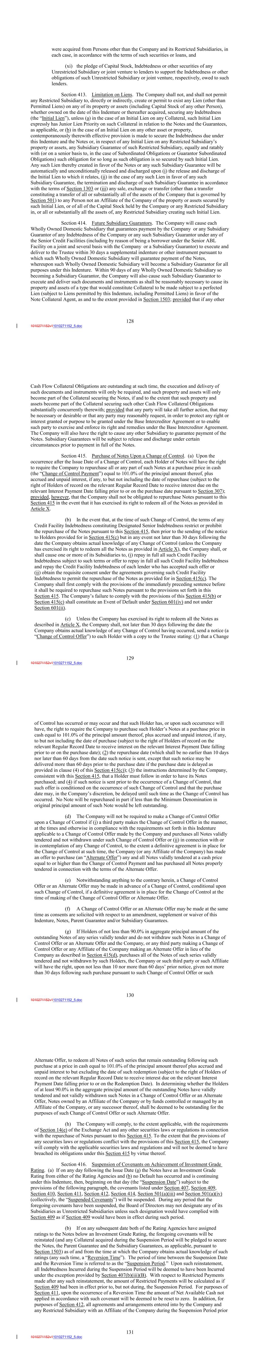 were acquired from Persons other than the Company and its Restricted Subsidiaries, in each case, in accordance with the terms of such securities or loans, and (xi) the pledge of Capital Stock, Indebtedness or other securities of any Unrestricted Subsidiary or joint venture to lenders to support the Indebtedness or other obligations of such Unrestricted Subsidiary or joint venture, respectively, owed to such lenders. Section 413. Limitation on Liens. The Company shall not, and shall not permit any Restricted Subsidiary to, directly or indirectly, create or permit to exist any Lien (other than Permitted Liens) on any of its property or assets (including Capital Stock of any other Person), whether owned on the date of this Indenture or thereafter acquired, securing any Indebtedness (the “Initial Lien”), unless (a) in the case of an Initial Lien on any Collateral, such Initial Lien expressly has Junior Lien Priority on such Collateral in relation to the Notes and the Guarantees, as applicable, or (b) in the case of an Initial Lien on any other asset or property, contemporaneously therewith effective provision is made to secure the Indebtedness due under this Indenture and the Notes or, in respect of any Initial Lien on any Restricted Subsidiary’s property or assets, any Subsidiary Guarantee of such Restricted Subsidiary, equally and ratably with (or on a senior basis to, in the case of Subordinated Obligations or Guarantor Subordinated Obligations) such obligation for so long as such obligation is so secured by such Initial Lien. Any such Lien thereby created in favor of the Notes or any such Subsidiary Guarantee will be automatically and unconditionally released and discharged upon (i) the release and discharge of the Initial Lien to which it relates, (ii) in the case of any such Lien in favor of any such Subsidiary Guarantee, the termination and discharge of such Subsidiary Guarantee in accordance with the terms of Section 1303 or (iii) any sale, exchange or transfer (other than a transfer constituting a transfer of all or substantially all of the assets of the Company that is governed by Section 501) to any Person not an Affiliate of the Company of the property or assets secured by such Initial Lien, or of all of the Capital Stock held by the Company or any Restricted Subsidiary in, or all or substantially all the assets of, any Restricted Subsidiary creating such Initial Lien. Section 414. Future Subsidiary Guarantors. The Company will cause each Wholly Owned Domestic Subsidiary that guarantees payment by the Company or any Subsidiary Guarantor of any Indebtedness of the Company or any such Subsidiary Guarantor under any of the Senior Credit Facilities (including by reason of being a borrower under the Senior ABL Facility on a joint and several basis with the Company or a Subsidiary Guarantor) to execute and deliver to the Trustee within 30 days a supplemental indenture or other instrument pursuant to which such Wholly Owned Domestic Subsidiary will guarantee payment of the Notes, whereupon such Wholly Owned Domestic Subsidiary will become a Subsidiary Guarantor for all purposes under this Indenture. Within 90 days of any Wholly Owned Domestic Subsidiary so becoming a Subsidiary Guarantor, the Company will also cause such Subsidiary Guarantor to execute and deliver such documents and instruments as shall be reasonably necessary to cause its property and assets of a type that would constitute Collateral to be made subject to a perfected Lien (subject to Liens permitted by this Indenture, including Permitted Liens) in favor of the Note Collateral Agent, as and to the extent provided in Section 1503; provided that if any other 128 1010271152v11010271152_5.doc Cash Flow Collateral Obligations are outstanding at such time, the execution and delivery of such documents and instruments will only be required, and such property and assets will only become part of the Collateral securing the Notes, if and to the extent that such property and assets become part of the Collateral securing such other Cash Flow Collateral Obligations substantially concurrently therewith; provided that any party will take all further action, that may be necessary or desirable or that any party may reasonably request, in order to protect any right or interest granted or purpose to be granted under the Base Intercreditor Agreement or to enable such party to exercise and enforce its right and remedies under the Base Intercreditor Agreement. The Company will also have the right to cause any other Subsidiary to guarantee payment of the Notes. Subsidiary Guarantees will be subject to release and discharge under certain circumstances prior to payment in full of the Notes. Section 415. Purchase of Notes Upon a Change of Control. (a) Upon the occurrence after the Issue Date of a Change of Control, each Holder of Notes will have the right to require the Company to repurchase all or any part of such Notes at a purchase price in cash (the “Change of Control Payment”) equal to 101.0% of the principal amount thereof, plus accrued and unpaid interest, if any, to but not including the date of repurchase (subject to the right of Holders of record on the relevant Regular Record Date to receive interest due on the relevant Interest Payment Date falling prior to or on the purchase date pursuant to Section 307); provided, however, that the Company shall not be obligated to repurchase Notes pursuant to this Section 415 in the event that it has exercised its right to redeem all of the Notes as provided in Article X. (b) In the event that, at the time of such Change of Control, the terms of any Credit Facility Indebtedness constituting Designated Senior Indebtedness restrict or prohibit the repurchase of the Notes pursuant to this Section 415, then prior to the sending of the notice to Holders provided for in Section 415(c) but in any event not later than 30 days following the date the Company obtains actual knowledge of any Change o