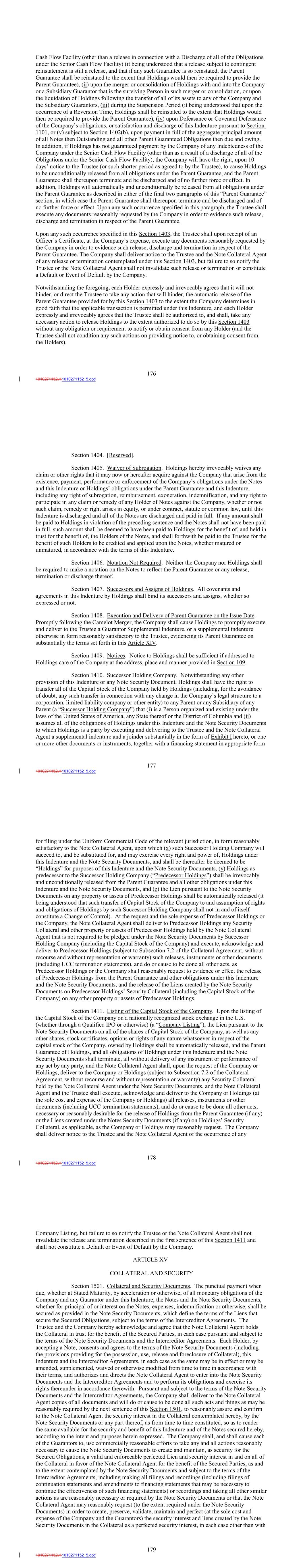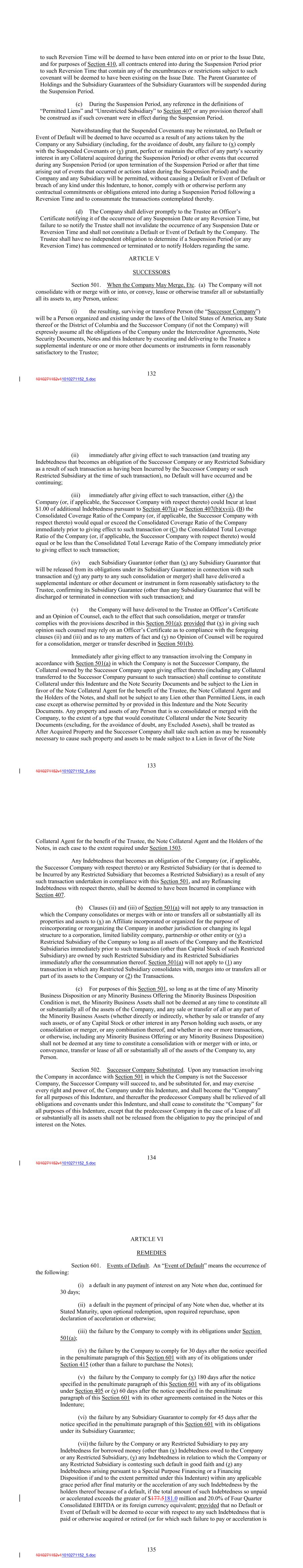to such Reversion Time will be deemed to have been entered into on or prior to the Issue Date, and for purposes of Section 410, all contracts entered into during the Suspension Period prior to such Reversion Time that contain any of the encumbrances or restrictions subject to such covenant will be deemed to have been existing on the Issue Date. The Parent Guarantee of Holdings and the Subsidiary Guarantees of the Subsidiary Guarantors will be suspended during the Suspension Period. (c) During the Suspension Period, any reference in the definitions of “Permitted Liens” and “Unrestricted Subsidiary” to Section 407 or any provision thereof shall be construed as if such covenant were in effect during the Suspension Period. Notwithstanding that the Suspended Covenants may be reinstated, no Default or Event of Default will be deemed to have occurred as a result of any actions taken by the Company or any Subsidiary (including, for the avoidance of doubt, any failure to (x) comply with the Suspended Covenants or (y) grant, perfect or maintain the effect of any party’s security interest in any Collateral acquired during the Suspension Period) or other events that occurred during any Suspension Period (or upon termination of the Suspension Period or after that time arising out of events that occurred or actions taken during the Suspension Period) and the Company and any Subsidiary will be permitted, without causing a Default or Event of Default or breach of any kind under this Indenture, to honor, comply with or otherwise perform any contractual commitments or obligations entered into during a Suspension Period following a Reversion Time and to consummate the transactions contemplated thereby. (d) The Company shall deliver promptly to the Trustee an Officer’s Certificate notifying it of the occurrence of any Suspension Date or any Reversion Time, but failure to so notify the Trustee shall not invalidate the occurrence of any Suspension Date or Reversion Time and shall not constitute a Default or Event of Default by the Company. The Trustee shall have no independent obligation to determine if a Suspension Period (or any Reversion Time) has commenced or terminated or to notify Holders regarding the same. ARTICLE V SUCCESSORS Section 501. When the Company May Merge, Etc. (a) The Company will not consolidate with or merge with or into, or convey, lease or otherwise transfer all or substantially all its assets to, any Person, unless: (i) the resulting, surviving or transferee Person (the “Successor Company”) will be a Person organized and existing under the laws of the United States of America, any State thereof or the District of Columbia and the Successor Company (if not the Company) will expressly assume all the obligations of the Company under the Intercreditor Agreements, Note Security Documents, Notes and this Indenture by executing and delivering to the Trustee a supplemental indenture or one or more other documents or instruments in form reasonably satisfactory to the Trustee; 132 1010271152v11010271152_5.doc (ii) immediately after giving effect to such transaction (and treating any Indebtedness that becomes an obligation of the Successor Company or any Restricted Subsidiary as a result of such transaction as having been Incurred by the Successor Company or such Restricted Subsidiary at the time of such transaction), no Default will have occurred and be continuing; (iii) immediately after giving effect to such transaction, either (A) the Company (or, if applicable, the Successor Company with respect thereto) could Incur at least $1.00 of additional Indebtedness pursuant to Section 407(a) or Section 407(b)(xvii), (B) the Consolidated Coverage Ratio of the Company (or, if applicable, the Successor Company with respect thereto) would equal or exceed the Consolidated Coverage Ratio of the Company immediately prior to giving effect to such transaction or (C) the Consolidated Total Leverage Ratio of the Company (or, if applicable, the Successor Company with respect thereto) would equal or be less than the Consolidated Total Leverage Ratio of the Company immediately prior to giving effect to such transaction; (iv) each Subsidiary Guarantor (other than (x) any Subsidiary Guarantor that will be released from its obligations under its Subsidiary Guarantee in connection with such transaction and (y) any party to any such consolidation or merger) shall have delivered a supplemental indenture or other document or instrument in form reasonably satisfactory to the Trustee, confirming its Subsidiary Guarantee (other than any Subsidiary Guarantee that will be discharged or terminated in connection with such transaction); and (v) the Company will have delivered to the Trustee an Officer’s Certificate and an Opinion of Counsel, each to the effect that such consolidation, merger or transfer complies with the provisions described in this Section 501(a); provided that (x) in giving such opinion such counsel may rely on an Officer’s Certificate as to compliance with the foregoing clauses (ii) and (iii) and as to any matters of fact and (y) no Opinion of Counsel will be required for a consolidation, merger or transfer described in Section 501(b). Immediately after giving effect to any transaction involving the Company in accordance with Section 501(a) in which the Company is not the Successor Company, the Collateral owned by the Successor Company upon giving effect thereto (including any Collateral transferred to the Successor Company pursuant to such transaction) shall continue to constitute Collateral under this Indenture and the Note Security Documents and be subject to the Lien in favor of the Note Collateral Agent for the benefit of the Trustee, the Note Collateral Agent and the Holders of the Notes, and shall not be subject to any Lien other than Permitted Liens, in each case except as otherwise permitted by or provided in this Indenture and the Note Security Documents. Any property and asset