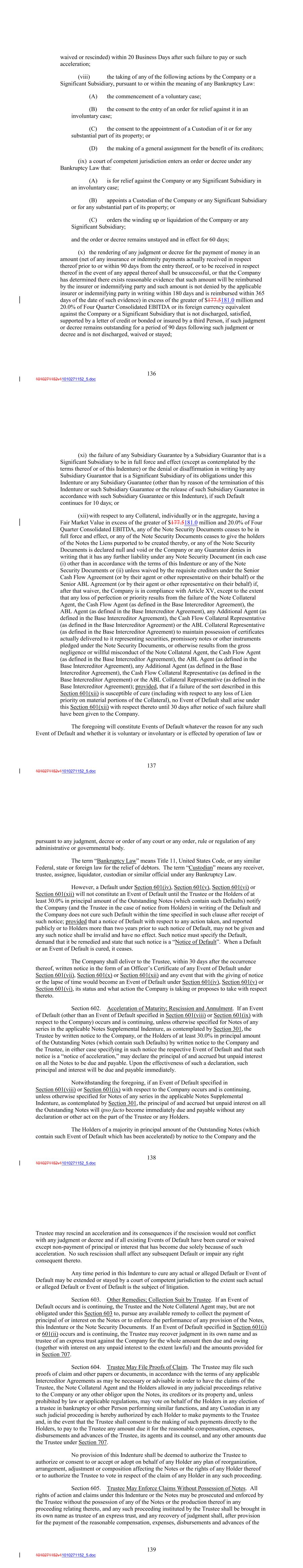 waived or rescinded) within 20 Business Days after such failure to pay or such acceleration; (viii) the taking of any of the following actions by the Company or a Significant Subsidiary, pursuant to or within the meaning of any Bankruptcy Law: (A) the commencement of a voluntary case; (B) the consent to the entry of an order for relief against it in an involuntary case; (C) the consent to the appointment of a Custodian of it or for any substantial part of its property; or (D) the making of a general assignment for the benefit of its creditors; (ix) a court of competent jurisdiction enters an order or decree under any Bankruptcy Law that: (A) is for relief against the Company or any Significant Subsidiary in an involuntary case; (B) appoints a Custodian of the Company or any Significant Subsidiary or for any substantial part of its property; or (C) orders the winding up or liquidation of the Company or any Significant Subsidiary; and the order or decree remains unstayed and in effect for 60 days; (x) the rendering of any judgment or decree for the payment of money in an amount (net of any insurance or indemnity payments actually received in respect thereof prior to or within 90 days from the entry thereof, or to be received in respect thereof in the event of any appeal thereof shall be unsuccessful, or that the Company has determined there exists reasonable evidence that such amount will be reimbursed by the insurer or indemnifying party and such amount is not denied by the applicable insurer or indemnifying party in writing within 180 days and is reimbursed within 365 days of the date of such evidence) in excess of the greater of $177.5181.0 million and 20.0% of Four Quarter Consolidated EBITDA or its foreign currency equivalent against the Company or a Significant Subsidiary that is not discharged, satisfied, supported by a letter of credit or bonded or insured by a third Person, if such judgment or decree remains outstanding for a period of 90 days following such judgment or decree and is not discharged, waived or stayed; 136 1010271152v11010271152_5.doc (xi) the failure of any Subsidiary Guarantee by a Subsidiary Guarantor that is a Significant Subsidiary to be in full force and effect (except as contemplated by the terms thereof or of this Indenture) or the denial or disaffirmation in writing by any Subsidiary Guarantor that is a Significant Subsidiary of its obligations under this Indenture or any Subsidiary Guarantee (other than by reason of the termination of this Indenture or such Subsidiary Guarantee or the release of such Subsidiary Guarantee in accordance with such Subsidiary Guarantee or this Indenture), if such Default continues for 10 days; or (xii) with respect to any Collateral, individually or in the aggregate, having a Fair Market Value in excess of the greater of $177.5181.0 million and 20.0% of Four Quarter Consolidated EBITDA, any of the Note Security Documents ceases to be in full force and effect, or any of the Note Security Documents ceases to give the holders of the Notes the Liens purported to be created thereby, or any of the Note Security Documents is declared null and void or the Company or any Guarantor denies in writing that it has any further liability under any Note Security Document (in each case (i) other than in accordance with the terms of this Indenture or any of the Note Security Documents or (ii) unless waived by the requisite creditors under the Senior Cash Flow Agreement (or by their agent or other representative on their behalf) or the Senior ABL Agreement (or by their agent or other representative on their behalf) if, after that waiver, the Company is in compliance with Article XV, except to the extent that any loss of perfection or priority results from the failure of the Note Collateral Agent, the Cash Flow Agent (as defined in the Base Intercreditor Agreement), the ABL Agent (as defined in the Base Intercreditor Agreement), any Additional Agent (as defined in the Base Intercreditor Agreement), the Cash Flow Collateral Representative (as defined in the Base Intercreditor Agreement) or the ABL Collateral Representative (as defined in the Base Intercreditor Agreement) to maintain possession of certificates actually delivered to it representing securities, promissory notes or other instruments pledged under the Note Security Documents, or otherwise results from the gross negligence or willful misconduct of the Note Collateral Agent, the Cash Flow Agent (as defined in the Base Intercreditor Agreement), the ABL Agent (as defined in the Base Intercreditor Agreement), any Additional Agent (as defined in the Base Intercreditor Agreement), the Cash Flow Collateral Representative (as defined in the Base Intercreditor Agreement) or the ABL Collateral Representative (as defined in the Base Intercreditor Agreement); provided, that if a failure of the sort described in this Section 601(xii) is susceptible of cure (including with respect to any loss of Lien priority on material portions of the Collateral), no Event of Default shall arise under this Section 601(xii) with respect thereto until 30 days after notice of such failure shall have been given to the Company. The foregoing will constitute Events of Default whatever the reason for any such Event of Default and whether it is voluntary or involuntary or is effected by operation of law or 137 1010271152v11010271152_5.doc pursuant to any judgment, decree or order of any court or any order, rule or regulation of any administrative or governmental body. The term “Bankruptcy Law” means Title 11, United States Code, or any similar Federal, state or foreign law for the relief of debtors. The term “Custodian” means any receiver, trustee, assignee, liquidator, custodian or similar official under any Bankruptcy Law. However, a Default under Section 601(iv), Section 601(v), Section 601(vi) or Section 601(xii) will not constitute an Event of Default until the Trustee or the Holders of at least 30.0% in princ