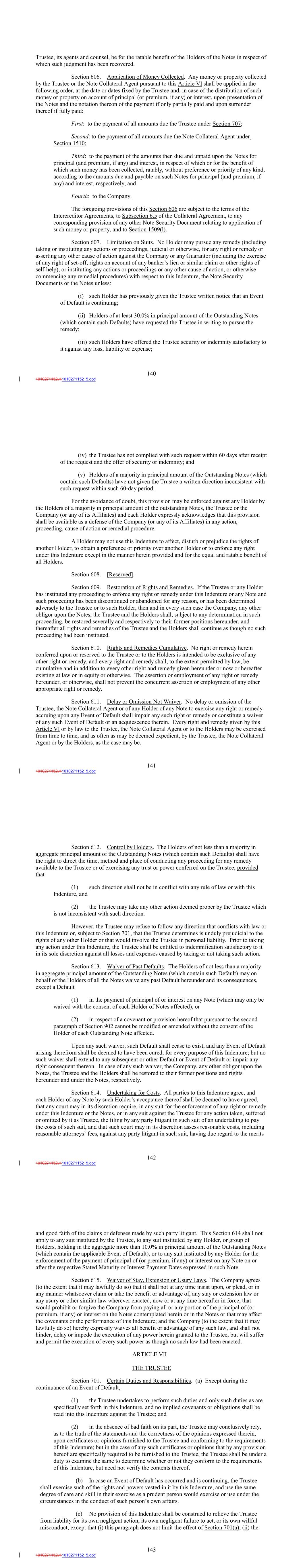 Trustee, its agents and counsel, be for the ratable benefit of the Holders of the Notes in respect of which such judgment has been recovered. Section 606. Application of Money Collected. Any money or property collected by the Trustee or the Note Collateral Agent pursuant to this Article VI shall be applied in the following order, at the date or dates fixed by the Trustee and, in case of the distribution of such money or property on account of principal (or premium, if any) or interest, upon presentation of the Notes and the notation thereon of the payment if only partially paid and upon surrender thereof if fully paid: First: to the payment of all amounts due the Trustee under Section 707; Second: to the payment of all amounts due the Note Collateral Agent under Section 1510; Third: to the payment of the amounts then due and unpaid upon the Notes for principal (and premium, if any) and interest, in respect of which or for the benefit of which such money has been collected, ratably, without preference or priority of any kind, according to the amounts due and payable on such Notes for principal (and premium, if any) and interest, respectively; and Fourth: to the Company. The foregoing provisions of this Section 606 are subject to the terms of the Intercreditor Agreements, to Subsection 6.5 of the Collateral Agreement, to any corresponding provision of any other Note Security Document relating to application of such money or property, and to Section 1509(l). Section 607. Limitation on Suits. No Holder may pursue any remedy (including taking or instituting any actions or proceedings, judicial or otherwise, for any right or remedy or asserting any other cause of action against the Company or any Guarantor (including the exercise of any right of set-off, rights on account of any banker’s lien or similar claim or other rights of self-help), or instituting any actions or proceedings or any other cause of action, or otherwise commencing any remedial procedures) with respect to this Indenture, the Note Security Documents or the Notes unless: (i) such Holder has previously given the Trustee written notice that an Event of Default is continuing; (ii) Holders of at least 30.0% in principal amount of the Outstanding Notes (which contain such Defaults) have requested the Trustee in writing to pursue the remedy; (iii) such Holders have offered the Trustee security or indemnity satisfactory to it against any loss, liability or expense; 140 1010271152v11010271152_5.doc (iv) the Trustee has not complied with such request within 60 days after receipt of the request and the offer of security or indemnity; and (v) Holders of a majority in principal amount of the Outstanding Notes (which contain such Defaults) have not given the Trustee a written direction inconsistent with such request within such 60-day period. For the avoidance of doubt, this provision may be enforced against any Holder by the Holders of a majority in principal amount of the outstanding Notes, the Trustee or the Company (or any of its Affiliates) and each Holder expressly acknowledges that this provision shall be available as a defense of the Company (or any of its Affiliates) in any action, proceeding, cause of action or remedial procedure. A Holder may not use this Indenture to affect, disturb or prejudice the rights of another Holder, to obtain a preference or priority over another Holder or to enforce any right under this Indenture except in the manner herein provided and for the equal and ratable benefit of all Holders. Section 608. [Reserved]. Section 609. Restoration of Rights and Remedies. If the Trustee or any Holder has instituted any proceeding to enforce any right or remedy under this Indenture or any Note and such proceeding has been discontinued or abandoned for any reason, or has been determined adversely to the Trustee or to such Holder, then and in every such case the Company, any other obligor upon the Notes, the Trustee and the Holders shall, subject to any determination in such proceeding, be restored severally and respectively to their former positions hereunder, and thereafter all rights and remedies of the Trustee and the Holders shall continue as though no such proceeding had been instituted. Section 610. Rights and Remedies Cumulative. No right or remedy herein conferred upon or reserved to the Trustee or to the Holders is intended to be exclusive of any other right or remedy, and every right and remedy shall, to the extent permitted by law, be cumulative and in addition to every other right and remedy given hereunder or now or hereafter existing at law or in equity or otherwise. The assertion or employment of any right or remedy hereunder, or otherwise, shall not prevent the concurrent assertion or employment of any other appropriate right or remedy. Section 611. Delay or Omission Not Waiver. No delay or omission of the Trustee, the Note Collateral Agent or of any Holder of any Note to exercise any right or remedy accruing upon any Event of Default shall impair any such right or remedy or constitute a waiver of any such Event of Default or an acquiescence therein. Every right and remedy given by this Article VI or by law to the Trustee, the Note Collateral Agent or to the Holders may be exercised from time to time, and as often as may be deemed expedient, by the Trustee, the Note Collateral Agent or by the Holders, as the case may be. 141 1010271152v11010271152_5.doc Section 612. Control by Holders. The Holders of not less than a majority in aggregate principal amount of the Outstanding Notes (which contain such Defaults) shall have the right to direct the time, method and place of conducting any proceeding for any remedy available to the Trustee or of exercising any trust or power conferred on the Trustee; provided that (1) such direction shall not be in conflict with any rule of law or with this Indenture, and (2) the Trustee may take any other action deemed proper by the Trustee which is not inconsistent with 