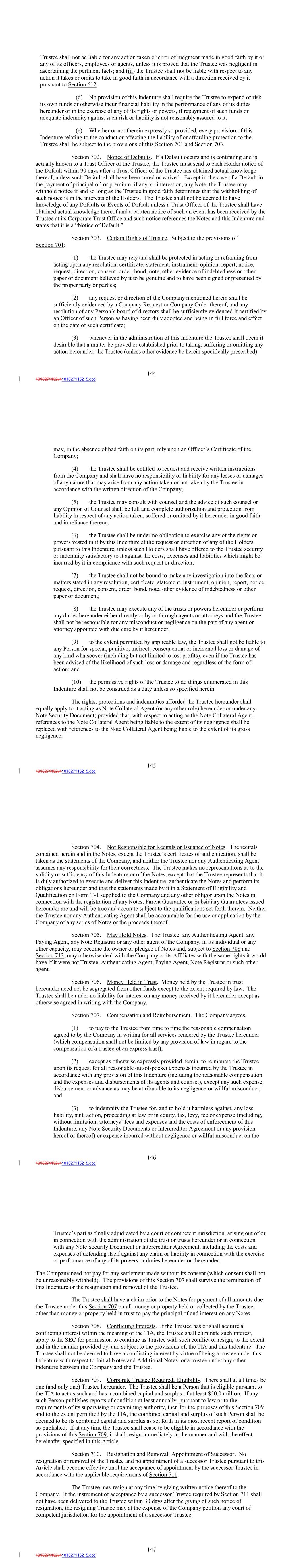 Trustee shall not be liable for any action taken or error of judgment made in good faith by it or any of its officers, employees or agents, unless it is proved that the Trustee was negligent in ascertaining the pertinent facts; and (iii) the Trustee shall not be liable with respect to any action it takes or omits to take in good faith in accordance with a direction received by it pursuant to Section 612. (d) No provision of this Indenture shall require the Trustee to expend or risk its own funds or otherwise incur financial liability in the performance of any of its duties hereunder or in the exercise of any of its rights or powers, if repayment of such funds or adequate indemnity against such risk or liability is not reasonably assured to it. (e) Whether or not therein expressly so provided, every provision of this Indenture relating to the conduct or affecting the liability of or affording protection to the Trustee shall be subject to the provisions of this Section 701 and Section 703. Section 702. Notice of Defaults. If a Default occurs and is continuing and is actually known to a Trust Officer of the Trustee, the Trustee must send to each Holder notice of the Default within 90 days after a Trust Officer of the Trustee has obtained actual knowledge thereof, unless such Default shall have been cured or waived. Except in the case of a Default in the payment of principal of, or premium, if any, or interest on, any Note, the Trustee may withhold notice if and so long as the Trustee in good faith determines that the withholding of such notice is in the interests of the Holders. The Trustee shall not be deemed to have knowledge of any Defaults or Events of Default unless a Trust Officer of the Trustee shall have obtained actual knowledge thereof and a written notice of such an event has been received by the Trustee at its Corporate Trust Office and such notice references the Notes and this Indenture and states that it is a “Notice of Default.” Section 703. Certain Rights of Trustee. Subject to the provisions of Section 701: (1) the Trustee may rely and shall be protected in acting or refraining from acting upon any resolution, certificate, statement, instrument, opinion, report, notice, request, direction, consent, order, bond, note, other evidence of indebtedness or other paper or document believed by it to be genuine and to have been signed or presented by the proper party or parties; (2) any request or direction of the Company mentioned herein shall be sufficiently evidenced by a Company Request or Company Order thereof, and any resolution of any Person’s board of directors shall be sufficiently evidenced if certified by an Officer of such Person as having been duly adopted and being in full force and effect on the date of such certificate; (3) whenever in the administration of this Indenture the Trustee shall deem it desirable that a matter be proved or established prior to taking, suffering or omitting any action hereunder, the Trustee (unless other evidence be herein specifically prescribed) 144 1010271152v11010271152_5.doc may, in the absence of bad faith on its part, rely upon an Officer’s Certificate of the Company; (4) the Trustee shall be entitled to request and receive written instructions from the Company and shall have no responsibility or liability for any losses or damages of any nature that may arise from any action taken or not taken by the Trustee in accordance with the written direction of the Company; (5) the Trustee may consult with counsel and the advice of such counsel or any Opinion of Counsel shall be full and complete authorization and protection from liability in respect of any action taken, suffered or omitted by it hereunder in good faith and in reliance thereon; (6) the Trustee shall be under no obligation to exercise any of the rights or powers vested in it by this Indenture at the request or direction of any of the Holders pursuant to this Indenture, unless such Holders shall have offered to the Trustee security or indemnity satisfactory to it against the costs, expenses and liabilities which might be incurred by it in compliance with such request or direction; (7) the Trustee shall not be bound to make any investigation into the facts or matters stated in any resolution, certificate, statement, instrument, opinion, report, notice, request, direction, consent, order, bond, note, other evidence of indebtedness or other paper or document; (8) the Trustee may execute any of the trusts or powers hereunder or perform any duties hereunder either directly or by or through agents or attorneys and the Trustee shall not be responsible for any misconduct or negligence on the part of any agent or attorney appointed with due care by it hereunder; (9) to the extent permitted by applicable law, the Trustee shall not be liable to any Person for special, punitive, indirect, consequential or incidental loss or damage of any kind whatsoever (including but not limited to lost profits), even if the Trustee has been advised of the likelihood of such loss or damage and regardless of the form of action; and (10) the permissive rights of the Trustee to do things enumerated in this Indenture shall not be construed as a duty unless so specified herein. The rights, protections and indemnities afforded the Trustee hereunder shall equally apply to it acting as Note Collateral Agent (or any other role) hereunder or under any Note Security Document; provided that, with respect to acting as the Note Collateral Agent, references to the Note Collateral Agent being liable to the extent of its negligence shall be replaced with references to the Note Collateral Agent being liable to the extent of its gross negligence. 145 1010271152v11010271152_5.doc Section 704. Not Responsible for Recitals or Issuance of Notes. The recitals contained herein and in the Notes, except the Trustee’s certificates of authentication, shall be taken as the statements of the Company, and neither the Trustee n