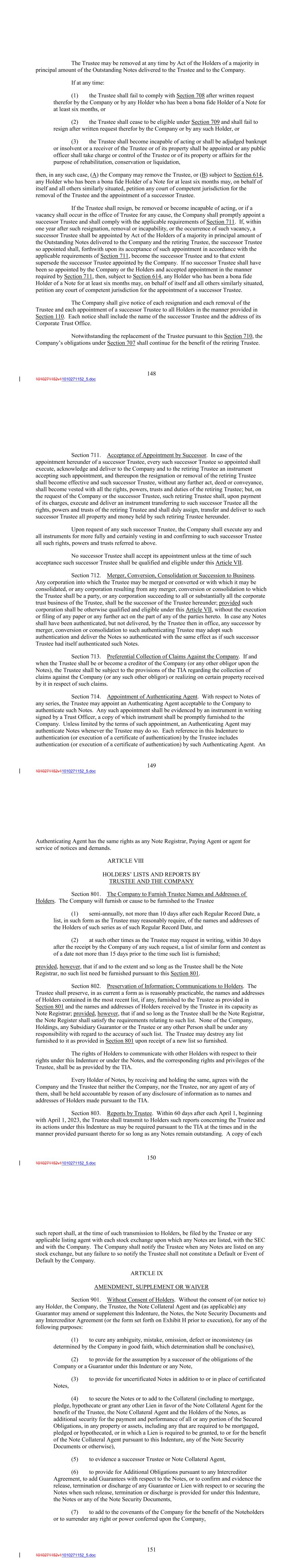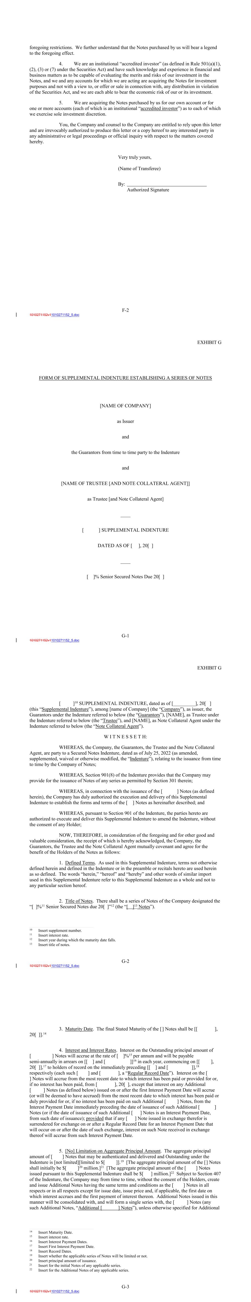 foregoing restrictions. We further understand that the Notes purchased by us will bear a legend to the foregoing effect. 4. We are an institutional “accredited investor” (as defined in Rule 501(a)(1), (2), (3) or (7) under the Securities Act) and have such knowledge and experience in financial and business matters as to be capable of evaluating the merits and risks of our investment in the Notes, and we and any accounts for which we are acting are acquiring the Notes for investment purposes and not with a view to, or offer or sale in connection with, any distribution in violation of the Securities Act, and we are each able to bear the economic risk of our or its investment. 5. We are acquiring the Notes purchased by us for our own account or for one or more accounts (each of which is an institutional “accredited investor”) as to each of which we exercise sole investment discretion. You, the Company and counsel to the Company are entitled to rely upon this letter and are irrevocably authorized to produce this letter or a copy hereof to any interested party in any administrative or legal proceedings or official inquiry with respect to the matters covered hereby. Very truly yours, (Name of Transferee) By: Authorized Signature F-2 1010271152v11010271152_5.doc EXHIBIT G FORM OF SUPPLEMENTAL INDENTURE ESTABLISHING A SERIES OF NOTES [NAME OF COMPANY] as Issuer and the Guarantors from time to time party to the Indenture and [NAME OF TRUSTEE [AND NOTE COLLATERAL AGENT]] as Trustee [and Note Collateral Agent] ____ [ ] SUPPLEMENTAL INDENTURE DATED AS OF [ ], 20[ ] ____ [ ]% Senior Secured Notes Due 20[ ] G-1 1010271152v11010271152_5.doc EXHIBIT G G-2 1010271152v11010271152_5.doc [ ]10 SUPPLEMENTAL INDENTURE, dated as of [_________], 20[ ] (this “Supplemental Indenture”), among [name of Company] (the “Company”), as issuer, the Guarantors under the Indenture referred to below (the “Guarantors”), [NAME], as Trustee under the Indenture referred to below (the “Trustee”), and [NAME], as Note Collateral Agent under the Indenture referred to below (the “Note Collateral Agent”). W I T N E S S E T H: WHEREAS, the Company, the Guarantors, the Trustee and the Note Collateral Agent, are party to a Secured Notes Indenture, dated as of July 25, 2022 (as amended, supplemented, waived or otherwise modified, the “Indenture”), relating to the issuance from time to time by the Company of Notes; WHEREAS, Section 901(8) of the Indenture provides that the Company may provide for the issuance of Notes of any series as permitted by Section 301 therein; WHEREAS, in connection with the issuance of the [ ] Notes (as defined herein), the Company has duly authorized the execution and delivery of this Supplemental Indenture to establish the forms and terms of the [ ] Notes as hereinafter described; and WHEREAS, pursuant to Section 901 of the Indenture, the parties hereto are authorized to execute and deliver this Supplemental Indenture to amend the Indenture, without the consent of any Holder; NOW, THEREFORE, in consideration of the foregoing and for other good and valuable consideration, the receipt of which is hereby acknowledged, the Company, the Guarantors, the Trustee and the Note Collateral Agent mutually covenant and agree for the benefit of the Holders of the Notes as follows: 1. Defined Terms. As used in this Supplemental Indenture, terms not otherwise defined herein and defined in the Indenture or in the preamble or recitals hereto are used herein as so defined. The words “herein,” “hereof” and “hereby” and other words of similar import used in this Supplemental Indenture refer to this Supplemental Indenture as a whole and not to any particular section hereof. 2. Title of Notes. There shall be a series of Notes of the Company designated the “[ ]%11 Senior Secured Notes due 20[ ]”12 (the “[ ]13 Notes”). 10 Insert supplement number. 11 Insert interest rate. 12 Insert year during which the maturity date falls. 13 Insert title of notes. G-3 1010271152v11010271152_5.doc 3. Maturity Date. The final Stated Maturity of the [ ] Notes shall be [[ ], 20[ ]].14 4. Interest and Interest Rates. Interest on the Outstanding principal amount of [ ] Notes will accrue at the rate of [ ]%15 per annum and will be payable semi-annually in arrears on [[ ] and [ ]]16 in each year, commencing on [[ ], 20[ ]],17 to holders of record on the immediately preceding [[ ] and [ ]],18 respectively (each such [ ] and [ ], a “Regular Record Date”). Interest on the [ ] Notes will accrue from the most recent date to which interest has been paid or provided for or, if no interest has been paid, from [ ], 20[ ], except that interest on any Additional [ ] Notes (as defined below) issued on or after the first Interest Payment Date will accrue (or will be deemed to have accrued) from the most recent date to which interest has been paid or duly provided for or, if no interest has been paid on such Additional [ ] Notes, from the Interest Payment Date immediately preceding the date of issuance of such Additional [ ] Notes (or if the date of issuance of such Additional [ ] Notes is an Interest Payment Date, from such date of issuance); provided that if any [ ] Note issued in exchange therefor is surrendered for exchange on or after a Regular Record Date for an Interest Payment Date that will occur on or after the date of such exchange, interest on such Note received in exchange thereof will accrue from such Interest Payment Date. 5. [No] Limitation on Aggregate Principal Amount. The aggregate principal amount of [ ] Notes that may be authenticated and delivered and Outstanding under the Indenture is [not limited][limited to $[ ]].19 [The aggregate principal amount of the [] Notes shall initially be $[ ]20 million.]21 [The aggregate principal amount of the [ ] Notes issued pursuant to this Supplemental Indenture shall be $[ ] million.]22 Subject to Section 407 of the Indenture, the Company may from time to tim
