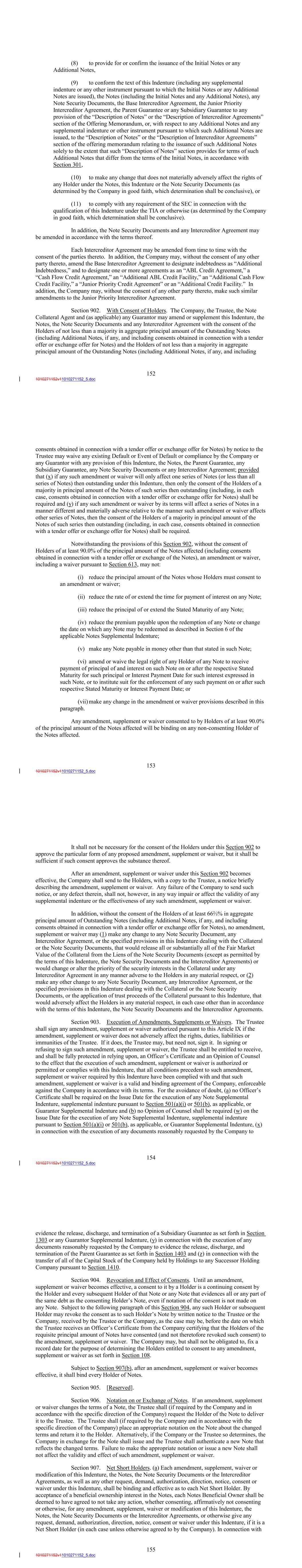 (8) to provide for or confirm the issuance of the Initial Notes or any Additional Notes, (9) to conform the text of this Indenture (including any supplemental indenture or any other instrument pursuant to which the Initial Notes or any Additional Notes are issued), the Notes (including the Initial Notes and any Additional Notes), any Note Security Documents, the Base Intercreditor Agreement, the Junior Priority Intercreditor Agreement, the Parent Guarantee or any Subsidiary Guarantee to any provision of the “Description of Notes” or the “Description of Intercreditor Agreements” section of the Offering Memorandum, or, with respect to any Additional Notes and any supplemental indenture or other instrument pursuant to which such Additional Notes are issued, to the “Description of Notes” or the “Description of Intercreditor Agreements” section of the offering memorandum relating to the issuance of such Additional Notes solely to the extent that such “Description of Notes” section provides for terms of such Additional Notes that differ from the terms of the Initial Notes, in accordance with Section 301, (10) to make any change that does not materially adversely affect the rights of any Holder under the Notes, this Indenture or the Note Security Documents (as determined by the Company in good faith, which determination shall be conclusive), or (11) to comply with any requirement of the SEC in connection with the qualification of this Indenture under the TIA or otherwise (as determined by the Company in good faith, which determination shall be conclusive). In addition, the Note Security Documents and any Intercreditor Agreement may be amended in accordance with the terms thereof. Each Intercreditor Agreement may be amended from time to time with the consent of the parties thereto. In addition, the Company may, without the consent of any other party thereto, amend the Base Intercreditor Agreement to designate indebtedness as “Additional Indebtedness,” and to designate one or more agreements as an “ABL Credit Agreement,” a “Cash Flow Credit Agreement,” an “Additional ABL Credit Facility,” an “Additional Cash Flow Credit Facility,” a “Junior Priority Credit Agreement” or an “Additional Credit Facility.” In addition, the Company may, without the consent of any other party thereto, make such similar amendments to the Junior Priority Intercreditor Agreement. Section 902. With Consent of Holders. The Company, the Trustee, the Note Collateral Agent and (as applicable) any Guarantor may amend or supplement this Indenture, the Notes, the Note Security Documents and any Intercreditor Agreement with the consent of the Holders of not less than a majority in aggregate principal amount of the Outstanding Notes (including Additional Notes, if any, and including consents obtained in connection with a tender offer or exchange offer for Notes) and the Holders of not less than a majority in aggregate principal amount of the Outstanding Notes (including Additional Notes, if any, and including 152 1010271152v11010271152_5.doc consents obtained in connection with a tender offer or exchange offer for Notes) by notice to the Trustee may waive any existing Default or Event of Default or compliance by the Company or any Guarantor with any provision of this Indenture, the Notes, the Parent Guarantee, any Subsidiary Guarantee, any Note Security Documents or any Intercreditor Agreement; provided that (x) if any such amendment or waiver will only affect one series of Notes (or less than all series of Notes) then outstanding under this Indenture, then only the consent of the Holders of a majority in principal amount of the Notes of such series then outstanding (including, in each case, consents obtained in connection with a tender offer or exchange offer for Notes) shall be required and (y) if any such amendment or waiver by its terms will affect a series of Notes in a manner different and materially adverse relative to the manner such amendment or waiver affects other series of Notes, then the consent of the Holders of a majority in principal amount of the Notes of such series then outstanding (including, in each case, consents obtained in connection with a tender offer or exchange offer for Notes) shall be required. Notwithstanding the provisions of this Section 902, without the consent of Holders of at least 90.0% of the principal amount of the Notes affected (including consents obtained in connection with a tender offer or exchange of the Notes), an amendment or waiver, including a waiver pursuant to Section 613, may not: (i) reduce the principal amount of the Notes whose Holders must consent to an amendment or waiver; (ii) reduce the rate of or extend the time for payment of interest on any Note; (iii) reduce the principal of or extend the Stated Maturity of any Note; (iv) reduce the premium payable upon the redemption of any Note or change the date on which any Note may be redeemed as described in Section 6 of the applicable Notes Supplemental Indenture; (v) make any Note payable in money other than that stated in such Note; (vi) amend or waive the legal right of any Holder of any Note to receive payment of principal of and interest on such Note on or after the respective Stated Maturity for such principal or Interest Payment Date for such interest expressed in such Note, or to institute suit for the enforcement of any such payment on or after such respective Stated Maturity or Interest Payment Date; or (vii) make any change in the amendment or waiver provisions described in this paragraph. Any amendment, supplement or waiver consented to by Holders of at least 90.0% of the principal amount of the Notes affected will be binding on any non-consenting Holder of the Notes affected. 153 1010271152v11010271152_5.doc It shall not be necessary for the consent of the Holders under this Section 902 to approve the particular form of any proposed amendment, supplement or waiver, but 
