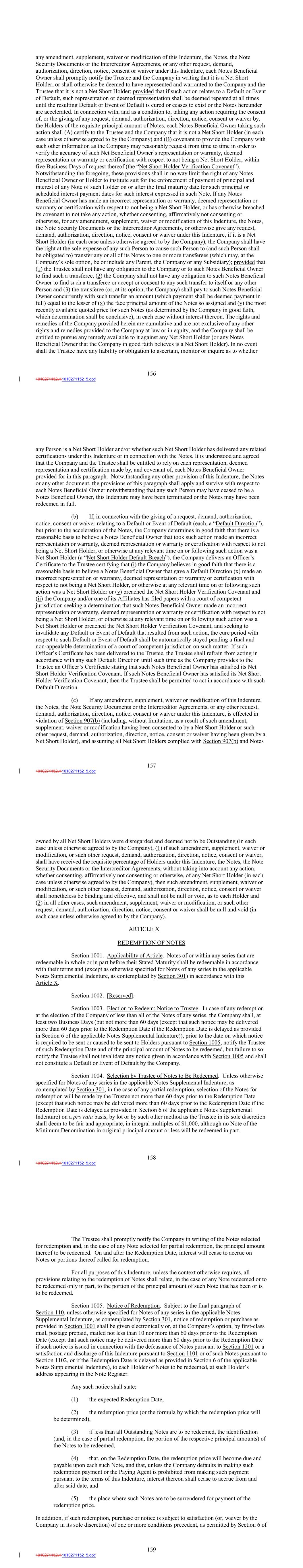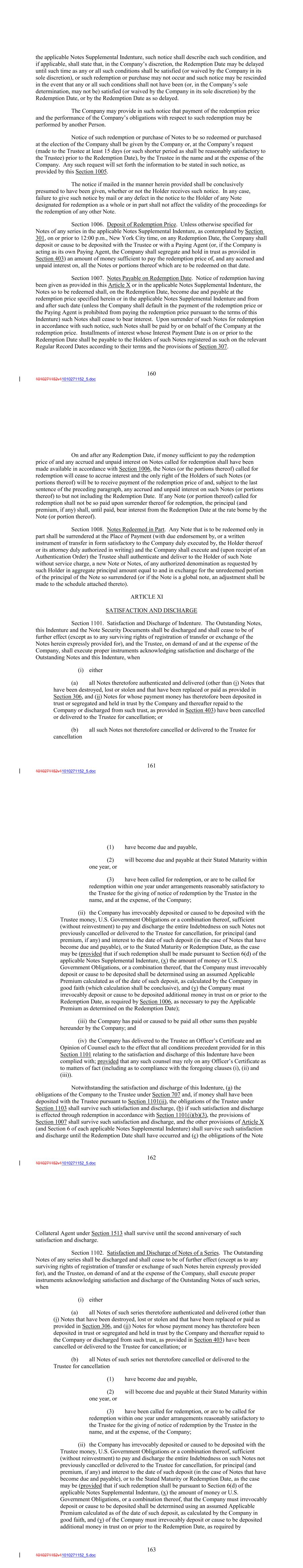 the applicable Notes Supplemental Indenture, such notice shall describe each such condition, and if applicable, shall state that, in the Company’s discretion, the Redemption Date may be delayed until such time as any or all such conditions shall be satisfied (or waived by the Company in its sole discretion), or such redemption or purchase may not occur and such notice may be rescinded in the event that any or all such conditions shall not have been (or, in the Company’s sole determination, may not be) satisfied (or waived by the Company in its sole discretion) by the Redemption Date, or by the Redemption Date as so delayed. The Company may provide in such notice that payment of the redemption price and the performance of the Company’s obligations with respect to such redemption may be performed by another Person. Notice of such redemption or purchase of Notes to be so redeemed or purchased at the election of the Company shall be given by the Company or, at the Company’s request (made to the Trustee at least 15 days (or such shorter period as shall be reasonably satisfactory to the Trustee) prior to the Redemption Date), by the Trustee in the name and at the expense of the Company. Any such request will set forth the information to be stated in such notice, as provided by this Section 1005. The notice if mailed in the manner herein provided shall be conclusively presumed to have been given, whether or not the Holder receives such notice. In any case, failure to give such notice by mail or any defect in the notice to the Holder of any Note designated for redemption as a whole or in part shall not affect the validity of the proceedings for the redemption of any other Note. Section 1006. Deposit of Redemption Price. Unless otherwise specified for Notes of any series in the applicable Notes Supplemental Indenture, as contemplated by Section 301, on or prior to 12:00 p.m., New York City time, on any Redemption Date, the Company shall deposit or cause to be deposited with the Trustee or with a Paying Agent (or, if the Company is acting as its own Paying Agent, the Company shall segregate and hold in trust as provided in Section 403) an amount of money sufficient to pay the redemption price of, and any accrued and unpaid interest on, all the Notes or portions thereof which are to be redeemed on that date. Section 1007. Notes Payable on Redemption Date. Notice of redemption having been given as provided in this Article X or in the applicable Notes Supplemental Indenture, the Notes so to be redeemed shall, on the Redemption Date, become due and payable at the redemption price specified herein or in the applicable Notes Supplemental Indenture and from and after such date (unless the Company shall default in the payment of the redemption price or the Paying Agent is prohibited from paying the redemption price pursuant to the terms of this Indenture) such Notes shall cease to bear interest. Upon surrender of such Notes for redemption in accordance with such notice, such Notes shall be paid by or on behalf of the Company at the redemption price. Installments of interest whose Interest Payment Date is on or prior to the Redemption Date shall be payable to the Holders of such Notes registered as such on the relevant Regular Record Dates according to their terms and the provisions of Section 307. 160 1010271152v11010271152_5.doc On and after any Redemption Date, if money sufficient to pay the redemption price of and any accrued and unpaid interest on Notes called for redemption shall have been made available in accordance with Section 1006, the Notes (or the portions thereof) called for redemption will cease to accrue interest and the only right of the Holders of such Notes (or portions thereof) will be to receive payment of the redemption price of and, subject to the last sentence of the preceding paragraph, any accrued and unpaid interest on such Notes (or portions thereof) to but not including the Redemption Date. If any Note (or portion thereof) called for redemption shall not be so paid upon surrender thereof for redemption, the principal (and premium, if any) shall, until paid, bear interest from the Redemption Date at the rate borne by the Note (or portion thereof). Section 1008. Notes Redeemed in Part. Any Note that is to be redeemed only in part shall be surrendered at the Place of Payment (with due endorsement by, or a written instrument of transfer in form satisfactory to the Company duly executed by, the Holder thereof or its attorney duly authorized in writing) and the Company shall execute and (upon receipt of an Authentication Order) the Trustee shall authenticate and deliver to the Holder of such Note without service charge, a new Note or Notes, of any authorized denomination as requested by such Holder in aggregate principal amount equal to and in exchange for the unredeemed portion of the principal of the Note so surrendered (or if the Note is a global note, an adjustment shall be made to the schedule attached thereto). ARTICLE XI SATISFACTION AND DISCHARGE Section 1101. Satisfaction and Discharge of Indenture. The Outstanding Notes, this Indenture and the Note Security Documents shall be discharged and shall cease to be of further effect (except as to any surviving rights of registration of transfer or exchange of the Notes herein expressly provided for), and the Trustee, on demand of and at the expense of the Company, shall execute proper instruments acknowledging satisfaction and discharge of the Outstanding Notes and this Indenture, when (i) either (a) all Notes theretofore authenticated and delivered (other than (i) Notes that have been destroyed, lost or stolen and that have been replaced or paid as provided in Section 306, and (ii) Notes for whose payment money has theretofore been deposited in trust or segregated and held in trust by the Company and thereafter repaid to the Company or discharged from such trust, as provided in Section 403) have been cancelled or delivere