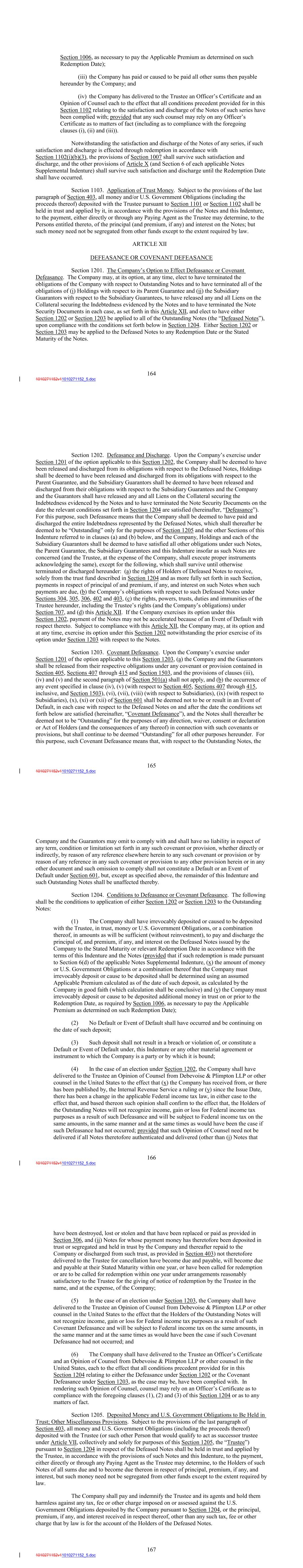 Section 1006, as necessary to pay the Applicable Premium as determined on such Redemption Date); (iii) the Company has paid or caused to be paid all other sums then payable hereunder by the Company; and (iv) the Company has delivered to the Trustee an Officer’s Certificate and an Opinion of Counsel each to the effect that all conditions precedent provided for in this Section 1102 relating to the satisfaction and discharge of the Notes of such series have been complied with; provided that any such counsel may rely on any Officer’s Certificate as to matters of fact (including as to compliance with the foregoing clauses (i), (ii) and (iii)). Notwithstanding the satisfaction and discharge of the Notes of any series, if such satisfaction and discharge is effected through redemption in accordance with Section 1102(i)(b)(3), the provisions of Section 1007 shall survive such satisfaction and discharge, and the other provisions of Article X (and Section 6 of each applicable Notes Supplemental Indenture) shall survive such satisfaction and discharge until the Redemption Date shall have occurred. Section 1103. Application of Trust Money. Subject to the provisions of the last paragraph of Section 403, all money and/or U.S. Government Obligations (including the proceeds thereof) deposited with the Trustee pursuant to Section 1101 or Section 1102 shall be held in trust and applied by it, in accordance with the provisions of the Notes and this Indenture, to the payment, either directly or through any Paying Agent as the Trustee may determine, to the Persons entitled thereto, of the principal (and premium, if any) and interest on the Notes; but such money need not be segregated from other funds except to the extent required by law. ARTICLE XII DEFEASANCE OR COVENANT DEFEASANCE Section 1201. The Company’s Option to Effect Defeasance or Covenant Defeasance. The Company may, at its option, at any time, elect to have terminated the obligations of the Company with respect to Outstanding Notes and to have terminated all of the obligations of (i) Holdings with respect to its Parent Guarantee and (ii) the Subsidiary Guarantors with respect to the Subsidiary Guarantees, to have released any and all Liens on the Collateral securing the Indebtedness evidenced by the Notes and to have terminated the Note Security Documents in each case, as set forth in this Article XII, and elect to have either Section 1202 or Section 1203 be applied to all of the Outstanding Notes (the “Defeased Notes”), upon compliance with the conditions set forth below in Section 1204. Either Section 1202 or Section 1203 may be applied to the Defeased Notes to any Redemption Date or the Stated Maturity of the Notes. 164 1010271152v11010271152_5.doc Section 1202. Defeasance and Discharge. Upon the Company’s exercise under Section 1201 of the option applicable to this Section 1202, the Company shall be deemed to have been released and discharged from its obligations with respect to the Defeased Notes, Holdings shall be deemed to have been released and discharged from its obligations with respect to the Parent Guarantee, and the Subsidiary Guarantors shall be deemed to have been released and discharged from their obligations with respect to the Subsidiary Guarantees and the Company and the Guarantors shall have released any and all Liens on the Collateral securing the Indebtedness evidenced by the Notes and to have terminated the Note Security Documents on the date the relevant conditions set forth in Section 1204 are satisfied (hereinafter, “Defeasance”). For this purpose, such Defeasance means that the Company shall be deemed to have paid and discharged the entire Indebtedness represented by the Defeased Notes, which shall thereafter be deemed to be “Outstanding” only for the purposes of Section 1205 and the other Sections of this Indenture referred to in clauses (a) and (b) below, and the Company, Holdings and each of the Subsidiary Guarantors shall be deemed to have satisfied all other obligations under such Notes, the Parent Guarantee, the Subsidiary Guarantees and this Indenture insofar as such Notes are concerned (and the Trustee, at the expense of the Company, shall execute proper instruments acknowledging the same), except for the following, which shall survive until otherwise terminated or discharged hereunder: (a) the rights of Holders of Defeased Notes to receive, solely from the trust fund described in Section 1204 and as more fully set forth in such Section, payments in respect of principal of and premium, if any, and interest on such Notes when such payments are due, (b) the Company’s obligations with respect to such Defeased Notes under Sections 304, 305, 306, 402 and 403, (c) the rights, powers, trusts, duties and immunities of the Trustee hereunder, including the Trustee’s rights (and the Company’s obligations) under Section 707, and (d) this Article XII. If the Company exercises its option under this Section 1202, payment of the Notes may not be accelerated because of an Event of Default with respect thereto. Subject to compliance with this Article XII, the Company may, at its option and at any time, exercise its option under this Section 1202 notwithstanding the prior exercise of its option under Section 1203 with respect to the Notes. Section 1203. Covenant Defeasance. Upon the Company’s exercise under Section 1201 of the option applicable to this Section 1203, (a) the Company and the Guarantors shall be released from their respective obligations under any covenant or provision contained in Section 405, Sections 407 through 415 and Section 1503, and the provisions of clauses (iii), (iv) and (v) and the second paragraph of Section 501(a) shall not apply, and (b) the occurrence of any event specified in clause (iv), (v) (with respect to Section 405, Sections 407 through 415, inclusive, and Section 1503), (vi), (vii), (viii) (with respect to Subsidiaries), (ix) (with respect to Subsidiaries), (x), (xi)