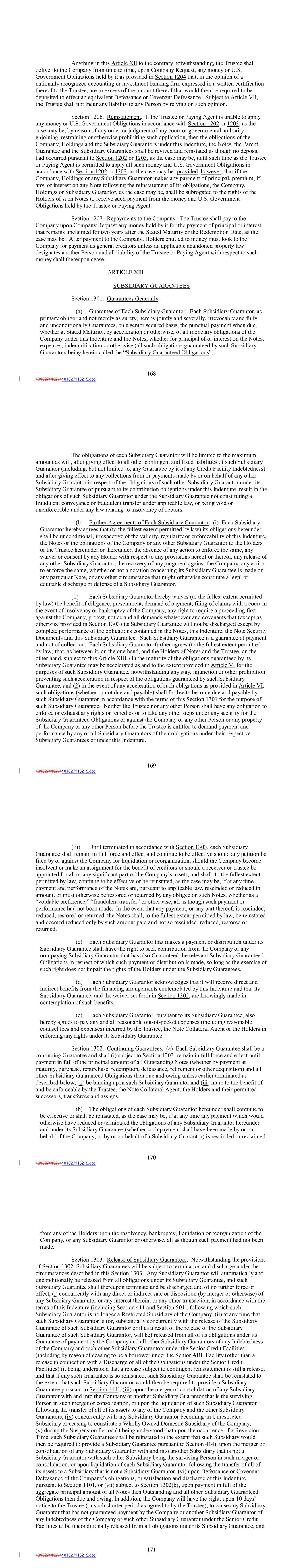 such Subsidiary Guarantee shall thereupon terminate and be discharged and of no further force or effect. Upon any such occurrence specified in this Section 1303, the Trustee shall upon receipt of an Officer’s Certificate, at the Company’s expense, execute any documents reasonably requested by the Company in order to evidence such release, discharge and termination in respect of the applicable Subsidiary Guarantee. The Company shall deliver notice to the Trustee and the Note Collateral Agent of any release or termination contemplated under this Section 1303, but failure to so notify the Trustee or the Note Collateral Agent shall not invalidate such release or termination or constitute a Default or Event of Default by the Company. Notwithstanding the foregoing, each Holder expressly and irrevocably agrees that it will not hinder, or direct the Trustee to take any action that will hinder, the automatic release of any Subsidiary Guarantee provided for by this Section 1303 to the extent the Company determines in good faith that the applicable transaction is permitted under this Indenture (including, without limitation, in connection with any disposition to Persons other than the Company or a Subsidiary Guarantor permitted under this Indenture), and each Holder expressly and irrevocably agrees that the Trustee shall be authorized to, and shall, take any necessary action to release any such Subsidiary Guarantee to the extent authorized to do so by this Section 1303 without any obligation or requirement to notify or obtain consent from any Holder (and the Trustee shall not condition any such actions on providing notice to, or obtaining consent from, the Holders). Section 1304. [Reserved]. Section 1305. Waiver of Subrogation. Each Subsidiary Guarantor hereby irrevocably waives any claim or other rights that it may now or hereafter acquire against the Company that arise from the existence, payment, performance or enforcement of the Company’s obligations under the Notes and this Indenture or such Subsidiary Guarantor’s obligations under its Subsidiary Guarantee and this Indenture, including any right of subrogation, reimbursement, exoneration, indemnification, and any right to participate in any claim or remedy of any Holder of Notes against the Company, whether or not such claim, remedy or right arises in equity, or under contract, statute or common law, until this Indenture is discharged and all of the Notes are discharged and paid in full. If any amount shall be paid to any Subsidiary Guarantor in violation of the preceding sentence and the Notes shall not have been paid in full, such amount shall be deemed to have been paid to such Subsidiary Guarantor for the benefit of, and held in trust for the benefit of, the Holders of the Notes, and shall forthwith be paid to the Trustee for the benefit of such Holders to be credited and applied upon the Notes, whether matured or unmatured, in accordance with the terms of this Indenture. Section 1306. Notation Not Required. Neither the Company nor any Subsidiary Guarantor shall be required to make a notation on the Notes to reflect any Subsidiary Guarantee or any release, termination or discharge thereof. 172 1010271152v11010271152_5.doc Section 1307. Successors and Assigns of Subsidiary Guarantors. All covenants and agreements in this Indenture by each Subsidiary Guarantor shall bind its respective successors and assigns, whether so expressed or not. Section 1308. Execution and Delivery of Subsidiary Guarantees. The Company shall cause each Restricted Subsidiary that is required to become a Subsidiary Guarantor pursuant to Section 414, and each Subsidiary of the Company that the Company causes to become a Subsidiary Guarantor pursuant to Section 414, to promptly execute and deliver to the Trustee a Guarantor Supplemental Indenture, or a supplemental indenture otherwise in form reasonably satisfactory to the Trustee, evidencing its Subsidiary Guarantee on substantially the terms set forth in this Article XIII. Section 1309. Notices. Notice to any Subsidiary Guarantor shall be sufficient if addressed to such Subsidiary Guarantor care of the Company at the address, place and manner provided in Section 109. ARTICLE XIV PARENT GUARANTEE Section 1401. Guarantees Generally. (a) Guarantee of Parent Guarantor. Subject to Section 1408, Holdings, as primary obligor and not merely as surety, hereby irrevocably and fully and unconditionally Guarantees (the “Parent Guarantee”), on a senior secured basis, the punctual payment when due, whether at Stated Maturity, by acceleration or otherwise, of all monetary obligations of the Company under this Indenture and the Notes, whether for principal of or interest on the Notes, expenses, indemnification or otherwise (all such obligations guaranteed by Holdings being herein called the “Parent Guaranteed Obligations”). The obligations of Holdings will be limited to the maximum amount as will, after giving effect to all other contingent and fixed liabilities of Holdings (including, but not limited to, any Guarantee by it of any Credit Facility Indebtedness), result in the obligations of Holdings under the Parent Guarantee not constituting a fraudulent conveyance or fraudulent transfer under applicable law, or being void or unenforceable under any law relating to insolvency of debtors. Notwithstanding anything in this Indenture or any Note Security Document to the contrary, including Section 1401(b)(iii) hereof, (i) the obligations of Holdings under this Indenture and the Note Security Documents, including in respect of the Parent Guaranteed Obligations, are expressly limited recourse obligations of Holdings, and such obligations shall be payable solely from, limited to, and shall in no event exceed, the Capital Stock of the Company pledged by Holdings under the Note Security Documents, and (ii) upon the collection, sale or disposition of, or other realization upon, the Capital Stock of the Company pledged by Holdi