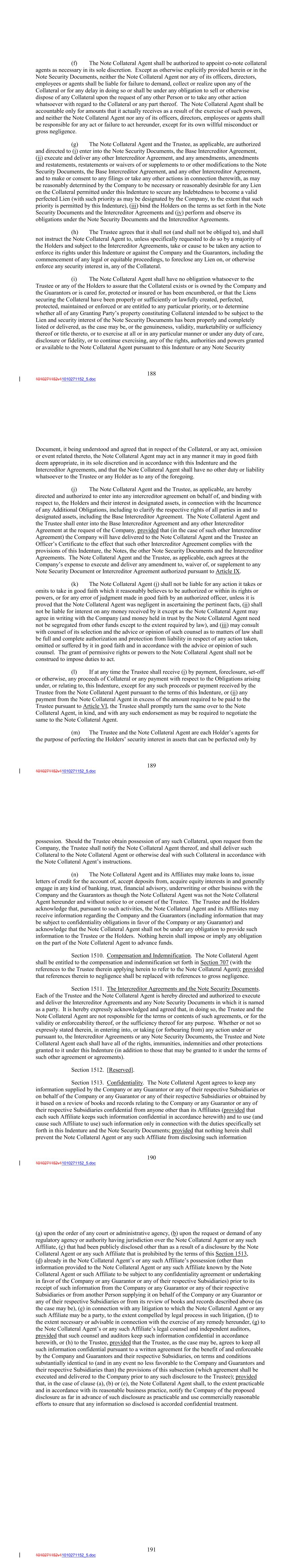 with respect to any security interest in fixtures affixed to or attached to any real property constituting Excluded Assets. Section 1504. Suits to Protect the Collateral. Upon the occurrence and during the continuation of an Event of Default and subject to the provisions of the Intercreditor Agreements, the Trustee in its sole discretion and without the consent of the Holders, on behalf of the Holders, may or may direct the Note Collateral Agent to take all actions it deems necessary or appropriate in order to: (a) enforce any of the terms of the Note Security Documents; and (b) collect and receive any and all amounts payable in respect of the obligations hereunder. Subject to the provisions of the Note Security Documents and the Intercreditor Agreements, the Trustee shall have the power to, or direct the Note Collateral Agent to, institute and to maintain such suits and proceedings as it may deem expedient to prevent any impairment of the Collateral by any acts that the Trustee reasonably believes are unlawful or in violation of any of the Note Security Documents or this Indenture, and such suits and proceedings as the Trustee, in its sole discretion, may reasonably deem expedient to preserve or protect the interests of the Note Collateral Agent and the Trustee and the interests of the Holders in the Collateral (including power to institute and maintain suits or proceedings to restrain the enforcement of or compliance with any legislative or other governmental enactment, rule or order that may be unconstitutional or otherwise invalid if the enforcement of, or compliance with, such enactment, rule or order would impair the Lien on the Collateral or be prejudicial to the interests of the Holders or the Trustee). Nothing in this Section 1504 shall be considered to impose any such duty or obligation to act on the part of the Trustee or the Note Collateral Agent. Section 1505. Authorization of Receipt of Funds by the Trustee Under the Note Security Documents. Subject to the provisions of the Intercreditor Agreements, the Trustee is authorized to receive any funds for the benefit of the Holders distributed by the Note Collateral Agent under the Note Security Documents, and to make further distributions of such funds to the Holders according to the provisions of this Indenture. Section 1506. Purchaser Protected. In no event shall any purchaser or other transferee in good faith of any property or assets purported to be released hereunder be bound to ascertain the authority of the Note Collateral Agent or the Trustee to execute the release or to inquire as to the satisfaction of any conditions required by the provisions hereof for the exercise of such authority or to see to the application of any consideration given by such purchaser or other transferee; nor shall any purchaser or other transferee of any property or assets be under any obligation to ascertain or inquire into the authority of the Company or the applicable Guarantor to make any such sale or other transfer. Section 1507. Powers Exercisable by Receiver or Trustee. In case the Collateral shall be in the possession of a receiver or trustee, lawfully appointed, the powers conferred in 184 1010271152v11010271152_5.doc this Article XV upon the Company or a Guarantor with respect to the release, sale or other disposition of such property or assets may be exercised by such receiver or trustee, and an instrument signed by such receiver or trustee shall be deemed the equivalent of any similar instrument of the Company or a Guarantor or of any officer or officers thereof required by the provisions of this Article XV; and if the Trustee shall be in the possession of the Collateral under any provision of this Indenture, then such powers may be exercised by the Trustee. Section 1508. Reports and Certificates Relating to Collateral. Any release of Collateral permitted by Section 1502 shall be deemed not to impair the Liens under this Indenture and the Collateral Agreement and the other Note Security Documents in contravention thereof. Each of the Company and the Guarantors may, subject to the other provisions of this Indenture, among other things, without any release or consent by the Trustee, the Note Collateral Agent, the Holders or any other Secured Party, conduct ordinary course activities with respect to the Collateral, including, (i) selling or otherwise disposing of, in any transaction or series of related transactions, any property or assets that is or has become worn out, defective, obsolete or not used or useful in the business of the Company and the Guarantors; (ii) abandoning, terminating, canceling, releasing or making alterations in or substitutions for any leases, contracts or other agreements or instruments; (iii) surrendering or modifying any franchise, license or permit that it may hold or own or under which it may be operating; (iv) altering, repairing, replacing, changing the location or position of or adding to its structures, machinery, systems, equipment, fixtures and appurtenances; (v) granting a license of any intellectual property; (vi) selling, transferring or otherwise disposing of inventory in the ordinary course of business; (vii) collecting accounts receivable in the ordinary course of business; (viii) making cash payments (including for the repayment of Indebtedness or payment of interest) from cash that is at any time part of the Collateral in the ordinary course of business; and (ix) abandoning any intellectual property that is no longer used or useful in the business of the Company and the Guarantors. Section 1509. Note Collateral Agent. (a) The Trustee and each of the Holders by acceptance of the Notes hereby designates and appoints the Note Collateral Agent as its collateral agent under this Indenture and the Note Security Documents and the Trustee and each of the Holders by acceptance of the Notes hereby irrevocably authorizes the Note Collateral Agent to take such action on its behalf under the provisions of