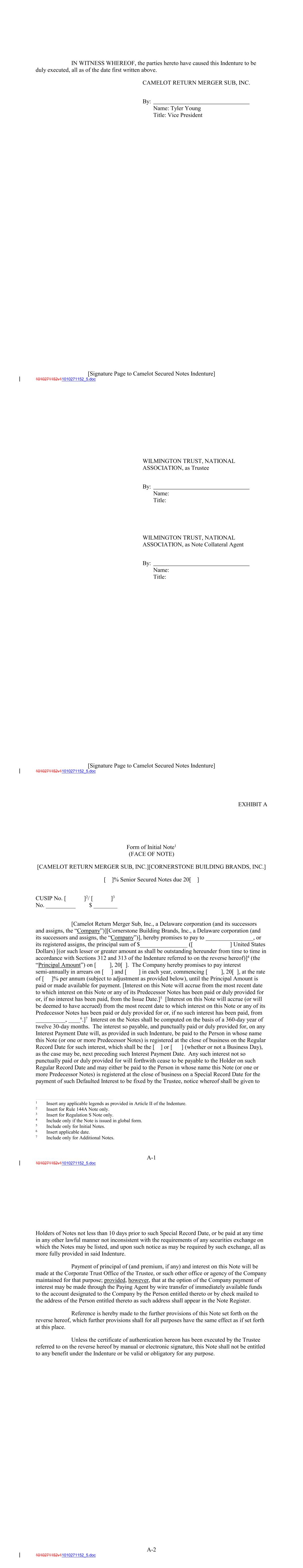 IN WITNESS WHEREOF, the parties hereto have caused this Indenture to be duly executed, all as of the date first written above. CAMELOT RETURN MERGER SUB, INC. By: Name: Tyler Young Title: Vice President [Signature Page to Camelot Secured Notes Indenture] 1010271152v11010271152_5.doc WILMINGTON TRUST, NATIONAL ASSOCIATION, as Trustee By: Name: Title: WILMINGTON TRUST, NATIONAL ASSOCIATION, as Note Collateral Agent By: Name: Title: [Signature Page to Camelot Secured Notes Indenture] 1010271152v11010271152_5.doc EXHIBIT A A-1 1010271152v11010271152_5.doc Form of Initial Note1 (FACE OF NOTE) [CAMELOT RETURN MERGER SUB, INC.][CORNERSTONE BUILDING BRANDS, INC.] [ ]% Senior Secured Notes due 20[ ] CUSIP No. [ ]2/ [ ]3 No. __________ $ ________ [Camelot Return Merger Sub, Inc., a Delaware corporation (and its successors and assigns, the “Company”)][Cornerstone Building Brands, Inc., a Delaware corporation (and its successors and assigns, the “Company”)], hereby promises to pay to ________________, or its registered assigns, the principal sum of $________________ ([ ] United States Dollars) [(or such lesser or greater amount as shall be outstanding hereunder from time to time in accordance with Sections 312 and 313 of the Indenture referred to on the reverse hereof)]4 (the “Principal Amount”) on [ ], 20[ ]. The Company hereby promises to pay interest semi-annually in arrears on [ ] and [ ] in each year, commencing [ ], 20[ ], at the rate of [ ]% per annum (subject to adjustment as provided below), until the Principal Amount is paid or made available for payment. [Interest on this Note will accrue from the most recent date to which interest on this Note or any of its Predecessor Notes has been paid or duly provided for or, if no interest has been paid, from the Issue Date.]5 [Interest on this Note will accrue (or will be deemed to have accrued) from the most recent date to which interest on this Note or any of its Predecessor Notes has been paid or duly provided for or, if no such interest has been paid, from __________, ____6.]7 Interest on the Notes shall be computed on the basis of a 360-day year of twelve 30-day months. The interest so payable, and punctually paid or duly provided for, on any Interest Payment Date will, as provided in such Indenture, be paid to the Person in whose name this Note (or one or more Predecessor Notes) is registered at the close of business on the Regular Record Date for such interest, which shall be the [ ] or [ ] (whether or not a Business Day), as the case may be, next preceding such Interest Payment Date. Any such interest not so punctually paid or duly provided for will forthwith cease to be payable to the Holder on such Regular Record Date and may either be paid to the Person in whose name this Note (or one or more Predecessor Notes) is registered at the close of business on a Special Record Date for the payment of such Defaulted Interest to be fixed by the Trustee, notice whereof shall be given to 1 Insert any applicable legends as provided in Article II of the Indenture. 2 Insert for Rule 144A Note only. 3 Insert for Regulation S Note only. 4 Include only if the Note is issued in global form. 5 Include only for Initial Notes. 6 Insert applicable date. 7 Include only for Additional Notes. Holders of Notes not less than 10 days prior to such Special Record Date, or be paid at any time in any other lawful manner not inconsistent with the requirements of any securities exchange on which the Notes may be listed, and upon such notice as may be required by such exchange, all as more fully provided in said Indenture. Payment of principal of (and premium, if any) and interest on this Note will be made at the Corporate Trust Office of the Trustee, or such other office or agency of the Company maintained for that purpose; provided, however, that at the option of the Company payment of interest may be made through the Paying Agent by wire transfer of immediately available funds to the account designated to the Company by the Person entitled thereto or by check mailed to the address of the Person entitled thereto as such address shall appear in the Note Register. Reference is hereby made to the further provisions of this Note set forth on the reverse hereof, which further provisions shall for all purposes have the same effect as if set forth at this place. Unless the certificate of authentication hereon has been executed by the Trustee referred to on the reverse hereof by manual or electronic signature, this Note shall not be entitled to any benefit under the Indenture or be valid or obligatory for any purpose. A-2 1010271152v11010271152_5.doc
