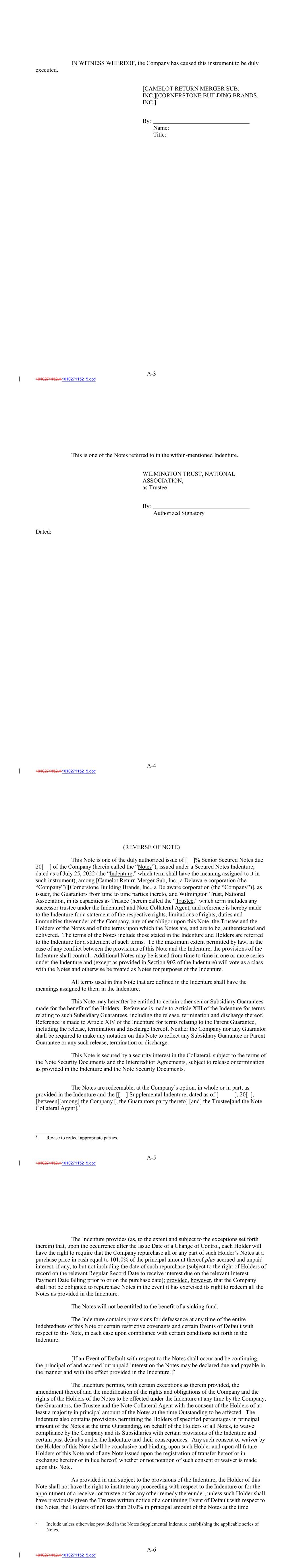 IN WITNESS WHEREOF, the Company has caused this instrument to be duly executed. [CAMELOT RETURN MERGER SUB, INC.][CORNERSTONE BUILDING BRANDS, INC.] By: Name: Title: A-3 1010271152v11010271152_5.doc This is one of the Notes referred to in the within-mentioned Indenture. WILMINGTON TRUST, NATIONAL ASSOCIATION, as Trustee By: Authorized Signatory Dated: A-4 1010271152v11010271152_5.doc A-5 1010271152v11010271152_5.doc (REVERSE OF NOTE) This Note is one of the duly authorized issue of [ ]% Senior Secured Notes due 20[ ] of the Company (herein called the “Notes”), issued under a Secured Notes Indenture, dated as of July 25, 2022 (the “Indenture,” which term shall have the meaning assigned to it in such instrument), among [Camelot Return Merger Sub, Inc., a Delaware corporation (the “Company”)][Cornerstone Building Brands, Inc., a Delaware corporation (the “Company”)], as issuer, the Guarantors from time to time parties thereto, and Wilmington Trust, National Association, in its capacities as Trustee (herein called the “Trustee,” which term includes any successor trustee under the Indenture) and Note Collateral Agent, and reference is hereby made to the Indenture for a statement of the respective rights, limitations of rights, duties and immunities thereunder of the Company, any other obligor upon this Note, the Trustee and the Holders of the Notes and of the terms upon which the Notes are, and are to be, authenticated and delivered. The terms of the Notes include those stated in the Indenture and Holders are referred to the Indenture for a statement of such terms. To the maximum extent permitted by law, in the case of any conflict between the provisions of this Note and the Indenture, the provisions of the Indenture shall control. Additional Notes may be issued from time to time in one or more series under the Indenture and (except as provided in Section 902 of the Indenture) will vote as a class with the Notes and otherwise be treated as Notes for purposes of the Indenture. All terms used in this Note that are defined in the Indenture shall have the meanings assigned to them in the Indenture. This Note may hereafter be entitled to certain other senior Subsidiary Guarantees made for the benefit of the Holders. Reference is made to Article XIII of the Indenture for terms relating to such Subsidiary Guarantees, including the release, termination and discharge thereof. Reference is made to Article XIV of the Indenture for terms relating to the Parent Guarantee, including the release, termination and discharge thereof. Neither the Company nor any Guarantor shall be required to make any notation on this Note to reflect any Subsidiary Guarantee or Parent Guarantee or any such release, termination or discharge. This Note is secured by a security interest in the Collateral, subject to the terms of the Note Security Documents and the Intercreditor Agreements, subject to release or termination as provided in the Indenture and the Note Security Documents. The Notes are redeemable, at the Company’s option, in whole or in part, as provided in the Indenture and the [[ ] Supplemental Indenture, dated as of [ ], 20[ ], [between][among] the Company [, the Guarantors party thereto] [and] the Trustee[and the Note Collateral Agent].8 8 Revise to reflect appropriate parties. A-6 1010271152v11010271152_5.doc The Indenture provides (as, to the extent and subject to the exceptions set forth therein) that, upon the occurrence after the Issue Date of a Change of Control, each Holder will have the right to require that the Company repurchase all or any part of such Holder’s Notes at a purchase price in cash equal to 101.0% of the principal amount thereof plus accrued and unpaid interest, if any, to but not including the date of such repurchase (subject to the right of Holders of record on the relevant Regular Record Date to receive interest due on the relevant Interest Payment Date falling prior to or on the purchase date); provided, however, that the Company shall not be obligated to repurchase Notes in the event it has exercised its right to redeem all the Notes as provided in the Indenture. The Notes will not be entitled to the benefit of a sinking fund. The Indenture contains provisions for defeasance at any time of the entire Indebtedness of this Note or certain restrictive covenants and certain Events of Default with respect to this Note, in each case upon compliance with certain conditions set forth in the Indenture. [If an Event of Default with respect to the Notes shall occur and be continuing, the principal of and accrued but unpaid interest on the Notes may be declared due and payable in the manner and with the effect provided in the Indenture.]9 The Indenture permits, with certain exceptions as therein provided, the amendment thereof and the modification of the rights and obligations of the Company and the rights of the Holders of the Notes to be effected under the Indenture at any time by the Company, the Guarantors, the Trustee and the Note Collateral Agent with the consent of the Holders of at least a majority in principal amount of the Notes at the time Outstanding to be affected. The Indenture also contains provisions permitting the Holders of specified percentages in principal amount of the Notes at the time Outstanding, on behalf of the Holders of all Notes, to waive compliance by the Company and its Subsidiaries with certain provisions of the Indenture and certain past defaults under the Indenture and their consequences. Any such consent or waiver by the Holder of this Note shall be conclusive and binding upon such Holder and upon all future Holders of this Note and of any Note issued upon the registration of transfer hereof or in exchange herefor or in lieu hereof, whether or not notation of such consent or waiver is made upon this Note. As provided in and subject to the provisions of the Indenture, the Holder of this Note shall not have the right to institute any proceedin