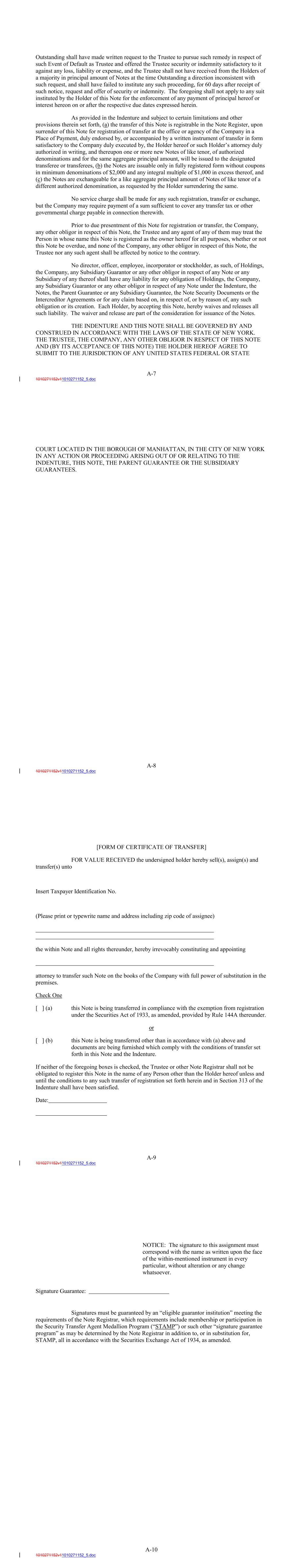 Outstanding shall have made written request to the Trustee to pursue such remedy in respect of such Event of Default as Trustee and offered the Trustee security or indemnity satisfactory to it against any loss, liability or expense, and the Trustee shall not have received from the Holders of a majority in principal amount of Notes at the time Outstanding a direction inconsistent with such request, and shall have failed to institute any such proceeding, for 60 days after receipt of such notice, request and offer of security or indemnity. The foregoing shall not apply to any suit instituted by the Holder of this Note for the enforcement of any payment of principal hereof or interest hereon on or after the respective due dates expressed herein. As provided in the Indenture and subject to certain limitations and other provisions therein set forth, (a) the transfer of this Note is registrable in the Note Register, upon surrender of this Note for registration of transfer at the office or agency of the Company in a Place of Payment, duly endorsed by, or accompanied by a written instrument of transfer in form satisfactory to the Company duly executed by, the Holder hereof or such Holder’s attorney duly authorized in writing, and thereupon one or more new Notes of like tenor, of authorized denominations and for the same aggregate principal amount, will be issued to the designated transferee or transferees, (b) the Notes are issuable only in fully registered form without coupons in minimum denominations of $2,000 and any integral multiple of $1,000 in excess thereof, and (c) the Notes are exchangeable for a like aggregate principal amount of Notes of like tenor of a different authorized denomination, as requested by the Holder surrendering the same. No service charge shall be made for any such registration, transfer or exchange, but the Company may require payment of a sum sufficient to cover any transfer tax or other governmental charge payable in connection therewith. Prior to due presentment of this Note for registration or transfer, the Company, any other obligor in respect of this Note, the Trustee and any agent of any of them may treat the Person in whose name this Note is registered as the owner hereof for all purposes, whether or not this Note be overdue, and none of the Company, any other obligor in respect of this Note, the Trustee nor any such agent shall be affected by notice to the contrary. No director, officer, employee, incorporator or stockholder, as such, of Holdings, the Company, any Subsidiary Guarantor or any other obligor in respect of any Note or any Subsidiary of any thereof shall have any liability for any obligation of Holdings, the Company, any Subsidiary Guarantor or any other obligor in respect of any Note under the Indenture, the Notes, the Parent Guarantee or any Subsidiary Guarantee, the Note Security Documents or the Intercreditor Agreements or for any claim based on, in respect of, or by reason of, any such obligation or its creation. Each Holder, by accepting this Note, hereby waives and releases all such liability. The waiver and release are part of the consideration for issuance of the Notes. THE INDENTURE AND THIS NOTE SHALL BE GOVERNED BY AND CONSTRUED IN ACCORDANCE WITH THE LAWS OF THE STATE OF NEW YORK. THE TRUSTEE, THE COMPANY, ANY OTHER OBLIGOR IN RESPECT OF THIS NOTE AND (BY ITS ACCEPTANCE OF THIS NOTE) THE HOLDER HEREOF AGREE TO SUBMIT TO THE JURISDICTION OF ANY UNITED STATES FEDERAL OR STATE A-7 1010271152v11010271152_5.doc COURT LOCATED IN THE BOROUGH OF MANHATTAN, IN THE CITY OF NEW YORK IN ANY ACTION OR PROCEEDING ARISING OUT OF OR RELATING TO THE INDENTURE, THIS NOTE, THE PARENT GUARANTEE OR THE SUBSIDIARY GUARANTEES. A-8 1010271152v11010271152_5.doc [FORM OF CERTIFICATE OF TRANSFER] FOR VALUE RECEIVED the undersigned holder hereby sell(s), assign(s) and transfer(s) unto Insert Taxpayer Identification No. (Please print or typewrite name and address including zip code of assignee) the within Note and all rights thereunder, hereby irrevocably constituting and appointing attorney to transfer such Note on the books of the Company with full power of substitution in the premises. Check One [ ] (a) this Note is being transferred in compliance with the exemption from registration under the Securities Act of 1933, as amended, provided by Rule 144A thereunder. or [ ] (b) this Note is being transferred other than in accordance with (a) above and documents are being furnished which comply with the conditions of transfer set forth in this Note and the Indenture. If neither of the foregoing boxes is checked, the Trustee or other Note Registrar shall not be obligated to register this Note in the name of any Person other than the Holder hereof unless and until the conditions to any such transfer of registration set forth herein and in Section 313 of the Indenture shall have been satisfied. Date: A-9 1010271152v11010271152_5.doc NOTICE: The signature to this assignment must correspond with the name as written upon the face of the within-mentioned instrument in every particular, without alteration or any change whatsoever. Signature Guarantee: Signatures must be guaranteed by an “eligible guarantor institution” meeting the requirements of the Note Registrar, which requirements include membership or participation in the Security Transfer Agent Medallion Program (“STAMP”) or such other “signature guarantee program” as may be determined by the Note Registrar in addition to, or in substitution for, STAMP, all in accordance with the Securities Exchange Act of 1934, as amended. A-10 1010271152v11010271152_5.doc