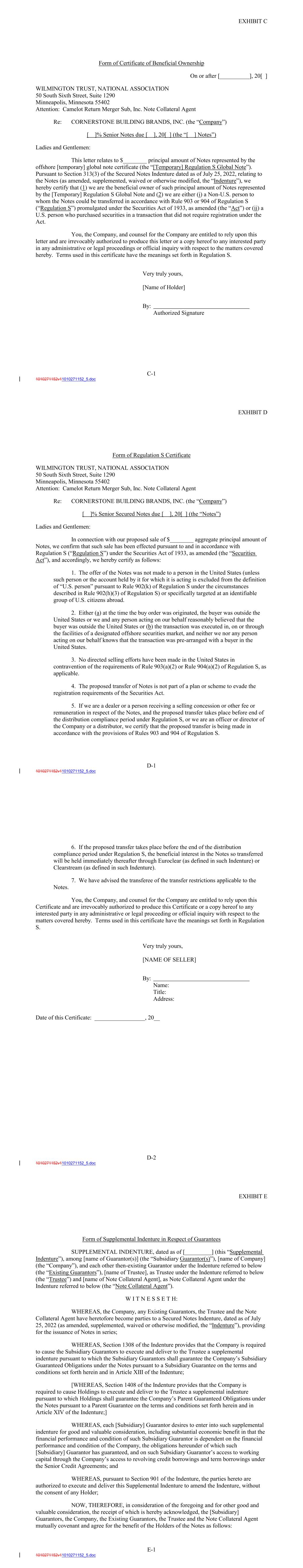 EXHIBIT C Form of Certificate of Beneficial Ownership On or after [__________], 20[ ] WILMINGTON TRUST, NATIONAL ASSOCIATION 50 South Sixth Street, Suite 1290 Minneapolis, Minnesota 55402 Attention: Camelot Return Merger Sub, Inc. Note Collateral Agent Re: CORNERSTONE BUILDING BRANDS, INC. (the “Company”) [ ]% Senior Notes due [ ], 20[ ] (the “[ ] Notes”) Ladies and Gentlemen: This letter relates to $________ principal amount of Notes represented by the offshore [temporary] global note certificate (the “[Temporary] Regulation S Global Note”). Pursuant to Section 313(3) of the Secured Notes Indenture dated as of July 25, 2022, relating to the Notes (as amended, supplemented, waived or otherwise modified, the “Indenture”), we hereby certify that (1) we are the beneficial owner of such principal amount of Notes represented by the [Temporary] Regulation S Global Note and (2) we are either (i) a Non-U.S. person to whom the Notes could be transferred in accordance with Rule 903 or 904 of Regulation S (“Regulation S”) promulgated under the Securities Act of 1933, as amended (the “Act”) or (ii) a U.S. person who purchased securities in a transaction that did not require registration under the Act. You, the Company, and counsel for the Company are entitled to rely upon this letter and are irrevocably authorized to produce this letter or a copy hereof to any interested party in any administrative or legal proceedings or official inquiry with respect to the matters covered hereby. Terms used in this certificate have the meanings set forth in Regulation S. Very truly yours, [Name of Holder] By: Authorized Signature C-1 1010271152v11010271152_5.doc EXHIBIT D Form of Regulation S Certificate WILMINGTON TRUST, NATIONAL ASSOCIATION 50 South Sixth Street, Suite 1290 Minneapolis, Minnesota 55402 Attention: Camelot Return Merger Sub, Inc. Note Collateral Agent Re: CORNERSTONE BUILDING BRANDS, INC. (the “Company”) [ ]% Senior Secured Notes due [ ], 20[ ] (the “Notes”) Ladies and Gentlemen: In connection with our proposed sale of $________ aggregate principal amount of Notes, we confirm that such sale has been effected pursuant to and in accordance with Regulation S (“Regulation S”) under the Securities Act of 1933, as amended (the “Securities Act”), and accordingly, we hereby certify as follows: 1. The offer of the Notes was not made to a person in the United States (unless such person or the account held by it for which it is acting is excluded from the definition of “U.S. person” pursuant to Rule 902(k) of Regulation S under the circumstances described in Rule 902(h)(3) of Regulation S) or specifically targeted at an identifiable group of U.S. citizens abroad. 2. Either (a) at the time the buy order was originated, the buyer was outside the United States or we and any person acting on our behalf reasonably believed that the buyer was outside the United States or (b) the transaction was executed in, on or through the facilities of a designated offshore securities market, and neither we nor any person acting on our behalf knows that the transaction was pre-arranged with a buyer in the United States. 3. No directed selling efforts have been made in the United States in contravention of the requirements of Rule 903(a)(2) or Rule 904(a)(2) of Regulation S, as applicable. 4. The proposed transfer of Notes is not part of a plan or scheme to evade the registration requirements of the Securities Act. 5. If we are a dealer or a person receiving a selling concession or other fee or remuneration in respect of the Notes, and the proposed transfer takes place before end of the distribution compliance period under Regulation S, or we are an officer or director of the Company or a distributor, we certify that the proposed transfer is being made in accordance with the provisions of Rules 903 and 904 of Regulation S. D-1 1010271152v11010271152_5.doc 6. If the proposed transfer takes place before the end of the distribution compliance period under Regulation S, the beneficial interest in the Notes so transferred will be held immediately thereafter through Euroclear (as defined in such Indenture) or Clearstream (as defined in such Indenture). 7. We have advised the transferee of the transfer restrictions applicable to the Notes. You, the Company, and counsel for the Company are entitled to rely upon this Certificate and are irrevocably authorized to produce this Certificate or a copy hereof to any interested party in any administrative or legal proceeding or official inquiry with respect to the matters covered hereby. Terms used in this certificate have the meanings set forth in Regulation S. Very truly yours, [NAME OF SELLER] By: Name: Title: Address: Date of this Certificate: _________________, 20__ D-2 1010271152v11010271152_5.doc EXHIBIT E Form of Supplemental Indenture in Respect of Guarantees SUPPLEMENTAL INDENTURE, dated as of [_________] (this “Supplemental Indenture”), among [name of Guarantor(s)] (the “Subsidiary Guarantor(s)”), [name of Company] (the “Company”), and each other then-existing Guarantor under the Indenture referred to below (the “Existing Guarantors”), [name of Trustee], as Trustee under the Indenture referred to below (the “Trustee”) and [name of Note Collateral Agent], as Note Collateral Agent under the Indenture referred to below (the “Note Collateral Agent”). W I T N E S S E T H: WHEREAS, the Company, any Existing Guarantors, the Trustee and the Note Collateral Agent have heretofore become parties to a Secured Notes Indenture, dated as of July 25, 2022 (as amended, supplemented, waived or otherwise modified, the “Indenture”), providing for the issuance of Notes in series; WHEREAS, Section 1308 of the Indenture provides that the Company is required to cause the Subsidiary Guarantors to execute and deliver to the Trustee a supplemental indenture pursuant to which the Subsidiary Guarantors shall guarantee the Company’s Subsidi