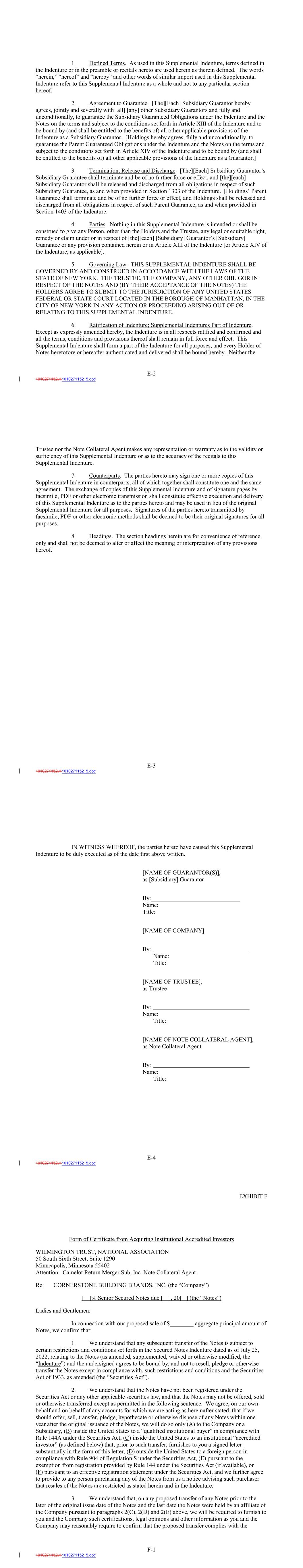 1. Defined Terms. As used in this Supplemental Indenture, terms defined in the Indenture or in the preamble or recitals hereto are used herein as therein defined. The words “herein,” “hereof” and “hereby” and other words of similar import used in this Supplemental Indenture refer to this Supplemental Indenture as a whole and not to any particular section hereof. 2. Agreement to Guarantee. [The][Each] Subsidiary Guarantor hereby agrees, jointly and severally with [all] [any] other Subsidiary Guarantors and fully and unconditionally, to guarantee the Subsidiary Guaranteed Obligations under the Indenture and the Notes on the terms and subject to the conditions set forth in Article XIII of the Indenture and to be bound by (and shall be entitled to the benefits of) all other applicable provisions of the Indenture as a Subsidiary Guarantor. [Holdings hereby agrees, fully and unconditionally, to guarantee the Parent Guaranteed Obligations under the Indenture and the Notes on the terms and subject to the conditions set forth in Article XIV of the Indenture and to be bound by (and shall be entitled to the benefits of) all other applicable provisions of the Indenture as a Guarantor.] 3. Termination, Release and Discharge. [The][Each] Subsidiary Guarantor’s Subsidiary Guarantee shall terminate and be of no further force or effect, and [the][each] Subsidiary Guarantor shall be released and discharged from all obligations in respect of such Subsidiary Guarantee, as and when provided in Section 1303 of the Indenture. [Holdings’ Parent Guarantee shall terminate and be of no further force or effect, and Holdings shall be released and discharged from all obligations in respect of such Parent Guarantee, as and when provided in Section 1403 of the Indenture. 4. Parties. Nothing in this Supplemental Indenture is intended or shall be construed to give any Person, other than the Holders and the Trustee, any legal or equitable right, remedy or claim under or in respect of [the][each] [Subsidiary] Guarantor’s [Subsidiary] Guarantee or any provision contained herein or in Article XIII of the Indenture [or Article XIV of the Indenture, as applicable]. 5. Governing Law. THIS SUPPLEMENTAL INDENTURE SHALL BE GOVERNED BY AND CONSTRUED IN ACCORDANCE WITH THE LAWS OF THE STATE OF NEW YORK. THE TRUSTEE, THE COMPANY, ANY OTHER OBLIGOR IN RESPECT OF THE NOTES AND (BY THEIR ACCEPTANCE OF THE NOTES) THE HOLDERS AGREE TO SUBMIT TO THE JURISDICTION OF ANY UNITED STATES FEDERAL OR STATE COURT LOCATED IN THE BOROUGH OF MANHATTAN, IN THE CITY OF NEW YORK IN ANY ACTION OR PROCEEDING ARISING OUT OF OR RELATING TO THIS SUPPLEMENTAL INDENTURE. 6. Ratification of Indenture; Supplemental Indentures Part of Indenture. Except as expressly amended hereby, the Indenture is in all respects ratified and confirmed and all the terms, conditions and provisions thereof shall remain in full force and effect. This Supplemental Indenture shall form a part of the Indenture for all purposes, and every Holder of Notes heretofore or hereafter authenticated and delivered shall be bound hereby. Neither the E-2 1010271152v11010271152_5.doc Trustee nor the Note Collateral Agent makes any representation or warranty as to the validity or sufficiency of this Supplemental Indenture or as to the accuracy of the recitals to this Supplemental Indenture. 7. Counterparts. The parties hereto may sign one or more copies of this Supplemental Indenture in counterparts, all of which together shall constitute one and the same agreement. The exchange of copies of this Supplemental Indenture and of signature pages by facsimile, PDF or other electronic transmission shall constitute effective execution and delivery of this Supplemental Indenture as to the parties hereto and may be used in lieu of the original Supplemental Indenture for all purposes. Signatures of the parties hereto transmitted by facsimile, PDF or other electronic methods shall be deemed to be their original signatures for all purposes. 8. Headings. The section headings herein are for convenience of reference only and shall not be deemed to alter or affect the meaning or interpretation of any provisions hereof. E-3 1010271152v11010271152_5.doc IN WITNESS WHEREOF, the parties hereto have caused this Supplemental Indenture to be duly executed as of the date first above written. [NAME OF GUARANTOR(S)], as [Subsidiary] Guarantor By:______________________________ Name: Title: [NAME OF COMPANY] By: Name: Title: [NAME OF TRUSTEE], as Trustee By: Name: Title: [NAME OF NOTE COLLATERAL AGENT], as Note Collateral Agent By: Name: Title: E-4 1010271152v11010271152_5.doc EXHIBIT F Form of Certificate from Acquiring Institutional Accredited Investors WILMINGTON TRUST, NATIONAL ASSOCIATION 50 South Sixth Street, Suite 1290 Minneapolis, Minnesota 55402 Attention: Camelot Return Merger Sub, Inc. Note Collateral Agent Re: CORNERSTONE BUILDING BRANDS, INC. (the “Company”) [ ]% Senior Secured Notes due [ ], 20[ ] (the “Notes”) Ladies and Gentlemen: In connection with our proposed sale of $________ aggregate principal amount of Notes, we confirm that: 1. We understand that any subsequent transfer of the Notes is subject to certain restrictions and conditions set forth in the Secured Notes Indenture dated as of July 25, 2022, relating to the Notes (as amended, supplemented, waived or otherwise modified, the “Indenture”) and the undersigned agrees to be bound by, and not to resell, pledge or otherwise transfer the Notes except in compliance with, such restrictions and conditions and the Securities Act of 1933, as amended (the “Securities Act”). 2. We understand that the Notes have not been registered under the Securities Act or any other applicable securities law, and that the Notes may not be offered, sold or otherwise transferred except as permitted in the following sentence. We agree, on our own behalf and on behalf of any accounts for which we are acting as hereinafter stated, that if we shoul