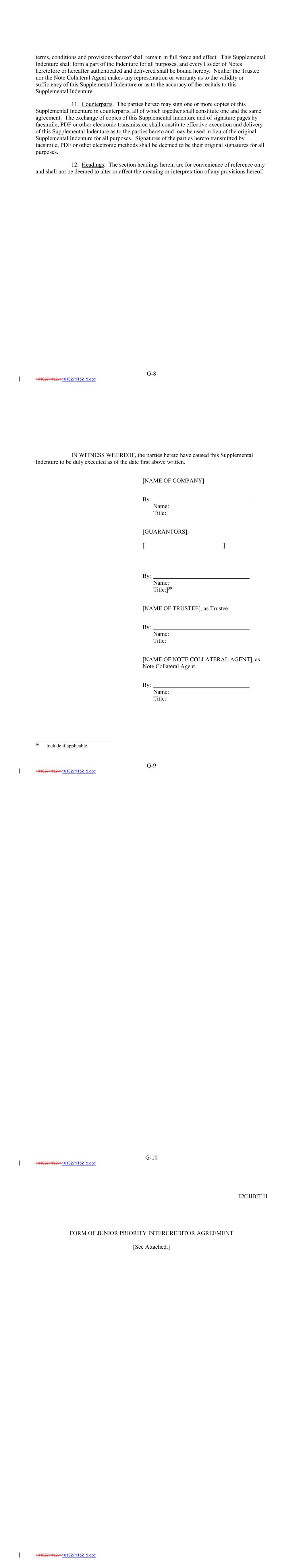 terms, conditions and provisions thereof shall remain in full force and effect. This Supplemental Indenture shall form a part of the Indenture for all purposes, and every Holder of Notes heretofore or hereafter authenticated and delivered shall be bound hereby. Neither the Trustee nor the Note Collateral Agent makes any representation or warranty as to the validity or sufficiency of this Supplemental Indenture or as to the accuracy of the recitals to this Supplemental Indenture. 11. Counterparts. The parties hereto may sign one or more copies of this Supplemental Indenture in counterparts, all of which together shall constitute one and the same agreement. The exchange of copies of this Supplemental Indenture and of signature pages by facsimile, PDF or other electronic transmission shall constitute effective execution and delivery of this Supplemental Indenture as to the parties hereto and may be used in lieu of the original Supplemental Indenture for all purposes. Signatures of the parties hereto transmitted by facsimile, PDF or other electronic methods shall be deemed to be their original signatures for all purposes. 12. Headings. The section headings herein are for convenience of reference only and shall not be deemed to alter or affect the meaning or interpretation of any provisions hereof. G-8 1010271152v11010271152_5.doc G-9 1010271152v11010271152_5.doc IN WITNESS WHEREOF, the parties hereto have caused this Supplemental Indenture to be duly executed as of the date first above written. [NAME OF COMPANY] By: Name: Title: [GUARANTORS]: [ ] By: Name: Title:]39 [NAME OF TRUSTEE], as Trustee By: Name: Title: [NAME OF NOTE COLLATERAL AGENT], as Note Collateral Agent By: Name: Title: 39 Include if applicable. G-10 1010271152v11010271152_5.doc EXHIBIT H FORM OF JUNIOR PRIORITY INTERCREDITOR AGREEMENT [See Attached.] 1010271152v11010271152_5.doc