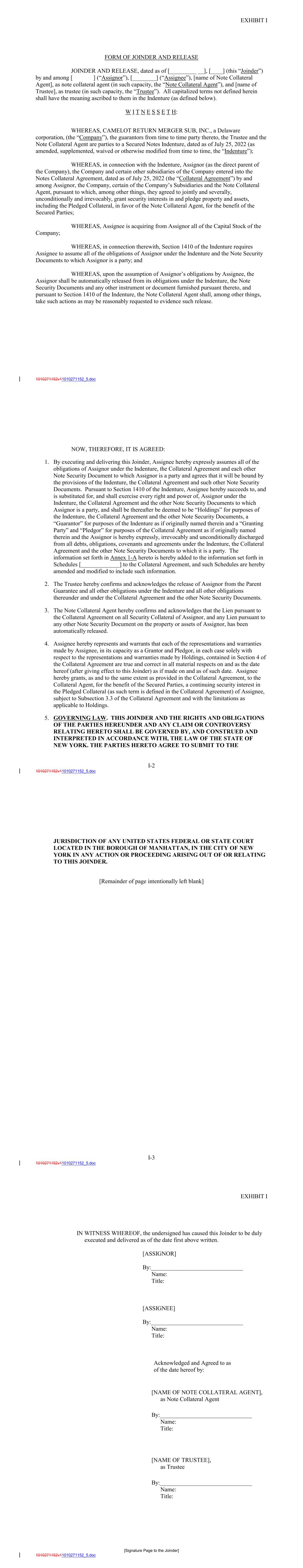 EXHIBIT I FORM OF JOINDER AND RELEASE JOINDER AND RELEASE, dated as of [_________ __], [____] (this “Joinder”) by and among [ ] (“Assignor”), [________] (“Assignee”), [name of Note Collateral Agent], as note collateral agent (in such capacity, the “Note Collateral Agent”), and [name of Trustee], as trustee (in such capacity, the “Trustee”). All capitalized terms not defined herein shall have the meaning ascribed to them in the Indenture (as defined below). W I T N E S S E T H: WHEREAS, CAMELOT RETURN MERGER SUB, INC., a Delaware corporation, (the “Company”), the guarantors from time to time party thereto, the Trustee and the Note Collateral Agent are parties to a Secured Notes Indenture, dated as of July 25, 2022 (as amended, supplemented, waived or otherwise modified from time to time, the “Indenture”); WHEREAS, in connection with the Indenture, Assignor (as the direct parent of the Company), the Company and certain other subsidiaries of the Company entered into the Notes Collateral Agreement, dated as of July 25, 2022 (the “Collateral Agreement”) by and among Assignor, the Company, certain of the Company’s Subsidiaries and the Note Collateral Agent, pursuant to which, among other things, they agreed to jointly and severally, unconditionally and irrevocably, grant security interests in and pledge property and assets, including the Pledged Collateral, in favor of the Note Collateral Agent, for the benefit of the Secured Parties; WHEREAS, Assignee is acquiring from Assignor all of the Capital Stock of the Company; WHEREAS, in connection therewith, Section 1410 of the Indenture requires Assignee to assume all of the obligations of Assignor under the Indenture and the Note Security Documents to which Assignor is a party; and WHEREAS, upon the assumption of Assignor’s obligations by Assignee, the Assignor shall be automatically released from its obligations under the Indenture, the Note Security Documents and any other instrument or document furnished pursuant thereto, and pursuant to Section 1410 of the Indenture, the Note Collateral Agent shall, among other things, take such actions as may be reasonably requested to evidence such release. 1010271152v11010271152_5.doc NOW, THEREFORE, IT IS AGREED: 1. By executing and delivering this Joinder, Assignee hereby expressly assumes all of the obligations of Assignor under the Indenture, the Collateral Agreement and each other Note Security Document to which Assignor is a party and agrees that it will be bound by the provisions of the Indenture, the Collateral Agreement and such other Note Security Documents. Pursuant to Section 1410 of the Indenture, Assignee hereby succeeds to, and is substituted for, and shall exercise every right and power of, Assignor under the Indenture, the Collateral Agreement and the other Note Security Documents to which Assignor is a party, and shall be thereafter be deemed to be “Holdings” for purposes of the Indenture, the Collateral Agreement and the other Note Security Documents, a “Guarantor” for purposes of the Indenture as if originally named therein and a “Granting Party” and “Pledgor” for purposes of the Collateral Agreement as if originally named therein and the Assignor is hereby expressly, irrevocably and unconditionally discharged from all debts, obligations, covenants and agreements under the Indenture, the Collateral Agreement and the other Note Security Documents to which it is a party. The information set forth in Annex 1-A hereto is hereby added to the information set forth in Schedules [_____________] to the Collateral Agreement, and such Schedules are hereby amended and modified to include such information. 2. The Trustee hereby confirms and acknowledges the release of Assignor from the Parent Guarantee and all other obligations under the Indenture and all other obligations thereunder and under the Collateral Agreement and the other Note Security Documents. 3. The Note Collateral Agent hereby confirms and acknowledges that the Lien pursuant to the Collateral Agreement on all Security Collateral of Assignor, and any Lien pursuant to any other Note Security Document on the property or assets of Assignor, has been automatically released. 4. Assignee hereby represents and warrants that each of the representations and warranties made by Assignee, in its capacity as a Grantor and Pledgor, in each case solely with respect to the representations and warranties made by Holdings, contained in Section 4 of the Collateral Agreement are true and correct in all material respects on and as the date hereof (after giving effect to this Joinder) as if made on and as of such date. Assignee hereby grants, as and to the same extent as provided in the Collateral Agreement, to the Collateral Agent, for the benefit of the Secured Parties, a continuing security interest in the Pledged Collateral (as such term is defined in the Collateral Agreement) of Assignee, subject to Subsection 3.3 of the Collateral Agreement and with the limitations as applicable to Holdings. 5. GOVERNING LAW. THIS JOINDER AND THE RIGHTS AND OBLIGATIONS OF THE PARTIES HEREUNDER AND ANY CLAIM OR CONTROVERSY RELATING HERETO SHALL BE GOVERNED BY, AND CONSTRUED AND INTERPRETED IN ACCORDANCE WITH, THE LAW OF THE STATE OF NEW YORK. THE PARTIES HERETO AGREE TO SUBMIT TO THE I-2 1010271152v11010271152_5.doc JURISDICTION OF ANY UNITED STATES FEDERAL OR STATE COURT LOCATED IN THE BOROUGH OF MANHATTAN, IN THE CITY OF NEW YORK IN ANY ACTION OR PROCEEDING ARISING OUT OF OR RELATING TO THIS JOINDER. [Remainder of page intentionally left blank] I-3 1010271152v11010271152_5.doc EXHIBIT I IN WITNESS WHEREOF, the undersigned has caused this Joinder to be duly executed and delivered as of the date first above written. [ASSIGNOR] By:_______________________________ Name: Title: [ASSIGNEE] By:_______________________________ Name: Title: Acknowledged and Agreed to as of the date hereof by: [NAME OF NOTE COLLATERAL AGENT], as