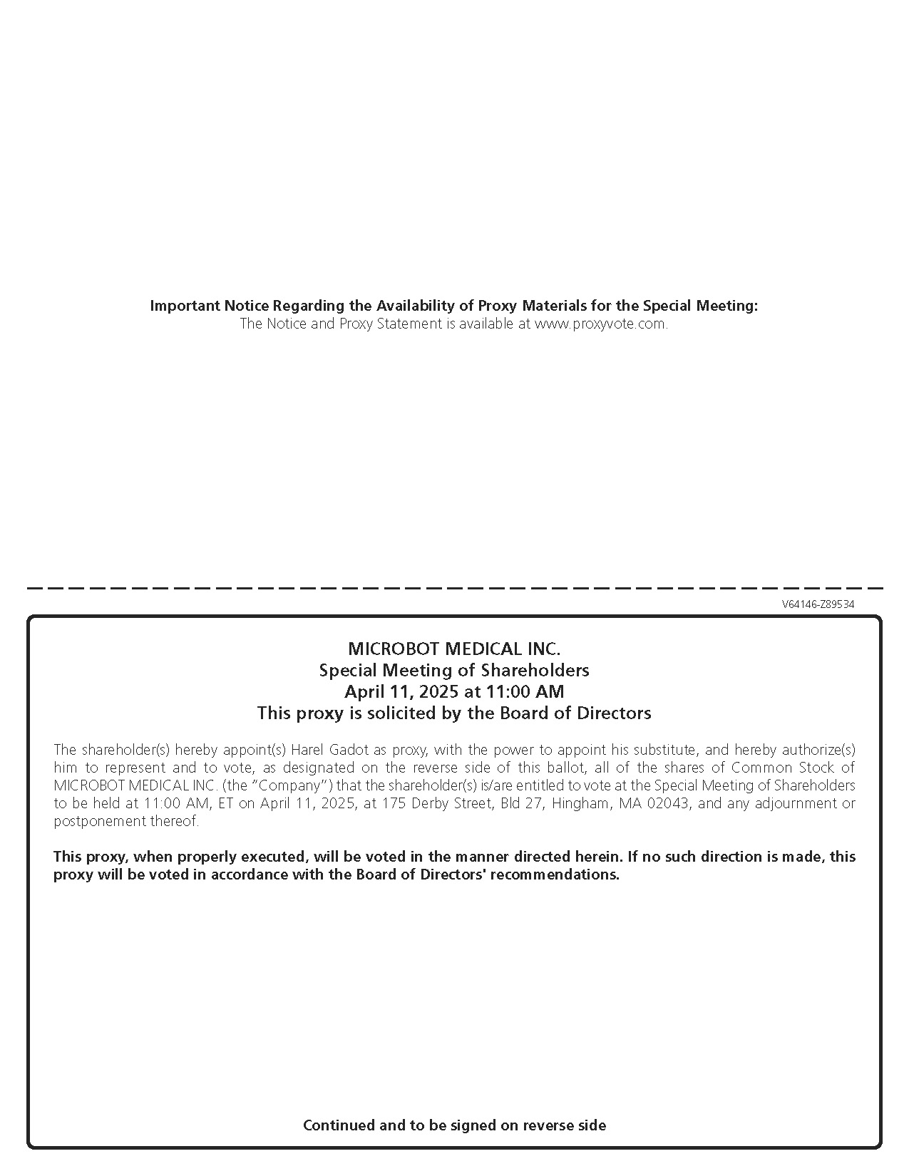 As permitted by the “Notice and Access” rules of the Securities and Exchange Commission (the “SEC”), the Notice of Special Stockholder Meeting, our Proxy Statement and a form of the proxy card are available online at www.microbotmedical.com.