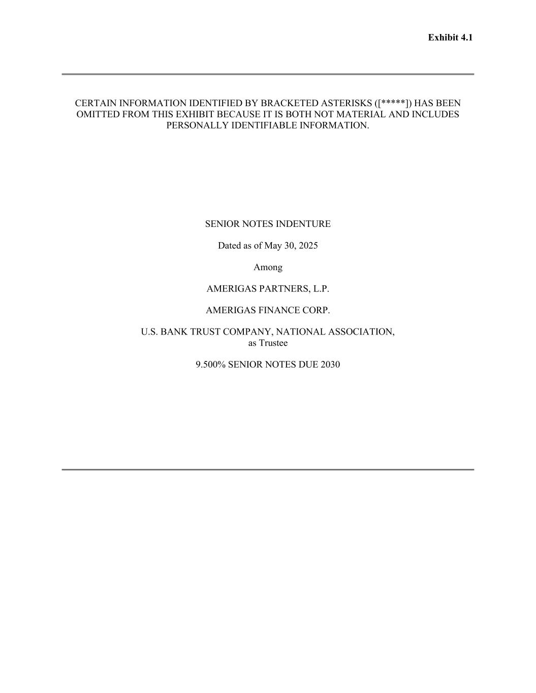 Exhibit 4.1 CERTAIN INFORMATION IDENTIFIED BY BRACKETED ASTERISKS ([*****]) HAS BEEN OMITTED FROM THIS EXHIBIT BECAUSE IT IS BOTH NOT MATERIAL AND INCLUDES PERSONALLY IDENTIFIABLE INFORMATION. SENIOR NOTES INDENTURE Dated as of May 30, 2025 Among AMERIGAS PARTNERS, L.P. AMERIGAS FINANCE CORP. U.S. BANK TRUST COMPANY, NATIONAL ASSOCIATION, as Trustee 9.500% SENIOR NOTES DUE 2030