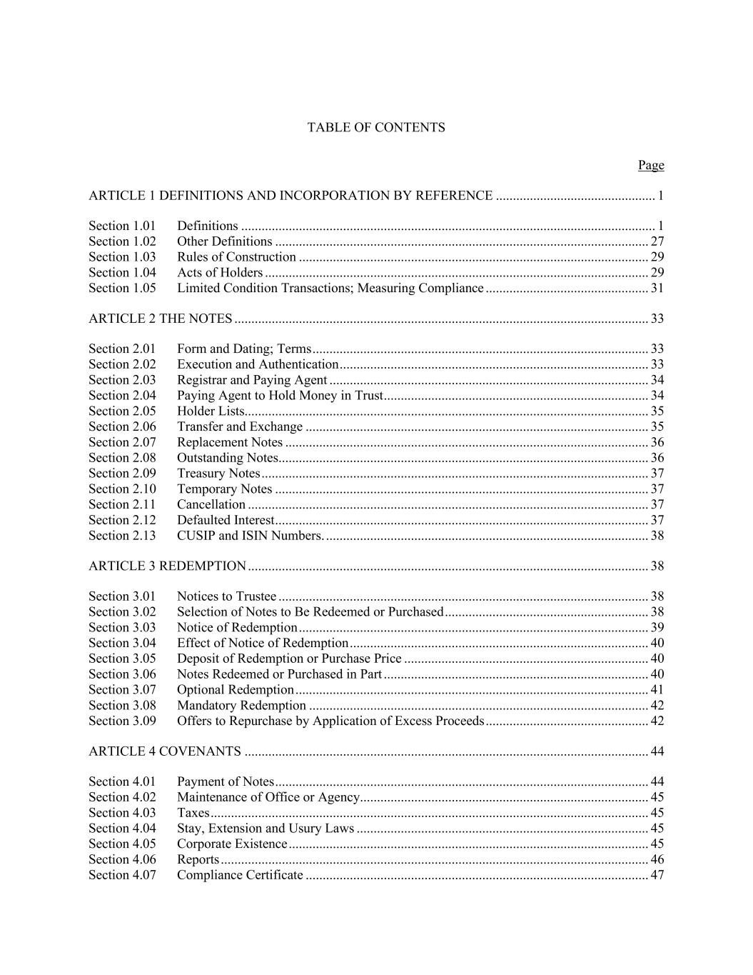 TABLE OF CONTENTS Page ARTICLE 1 DEFINITIONS AND INCORPORATION BY REFERENCE ............................................... 1 Section 1.01 Definitions .......................................................................................................................... 1 Section 1.02 Other Definitions .............................................................................................................. 27 Section 1.03 Rules of Construction ....................................................................................................... 29 Section 1.04 Acts of Holders ................................................................................................................. 29 Section 1.05 Limited Condition Transactions; Measuring Compliance ................................................ 31 ARTICLE 2 THE NOTES .......................................................................................................................... 33 Section 2.01 Form and Dating; Terms ................................................................................................... 33 Section 2.02 Execution and Authentication ........................................................................................... 33 Section 2.03 Registrar and Paying Agent .............................................................................................. 34 Section 2.04 Paying Agent to Hold Money in Trust .............................................................................. 34 Section 2.05 Holder Lists....................................................................................................................... 35 Section 2.06 Transfer and Exchange ..................................................................................................... 35 Section 2.07 Replacement Notes ........................................................................................................... 36 Section 2.08 Outstanding Notes ............................................................................................................. 36 Section 2.09 Treasury Notes .................................................................................................................. 37 Section 2.10 Temporary Notes .............................................................................................................. 37 Section 2.11 Cancellation ...................................................................................................................... 37 Section 2.12 Defaulted Interest .............................................................................................................. 37 Section 2.13 CUSIP and ISIN Numbers. ............................................................................................... 38 ARTICLE 3 REDEMPTION ...................................................................................................................... 38 Section 3.01 Notices to Trustee ............................................................................................................. 38 Section 3.02 Selection of Notes to Be Redeemed or Purchased ............................................................ 38 Section 3.03 Notice of Redemption ....................................................................................................... 39 Section 3.04 Effect of Notice of Redemption ........................................................................................ 40 Section 3.05 Deposit of Redemption or Purchase Price ........................................................................ 40 Section 3.06 Notes Redeemed or Purchased in Part .............................................................................. 40 Section 3.07 Optional Redemption ........................................................................................................ 41 Section 3.08 Mandatory Redemption .................................................................................................... 42 Section 3.09 Offers to Repurchase by Application of Excess Proceeds ................................................ 42 ARTICLE 4 COVENANTS ....................................................................................................................... 44 Section 4.01 Payment of Notes .............................................................................................................. 44 Section 4.02 Maintenance of Office or Agency ..................................................................................... 45 Section 4.03 Taxes ................................................................................................................................. 45 Section 4.04 Stay, Extension and Usury Laws ...................................................................................... 45 Section 4.05 Corporate Existence .......................................................................................................... 45 Section 4.06 Reports .............................................................................................................................. 46 Section 4.07 Compliance Certificate ..................................................................................................... 47