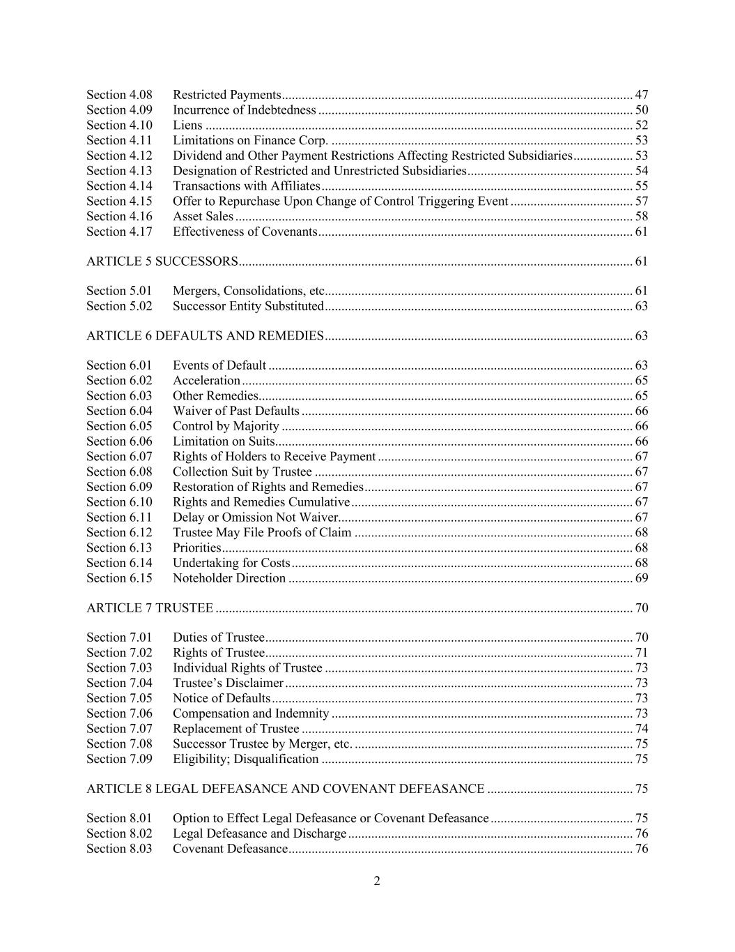 2 Section 4.08 Restricted Payments .......................................................................................................... 47 Section 4.09 Incurrence of Indebtedness ............................................................................................... 50 Section 4.10 Liens ................................................................................................................................. 52 Section 4.11 Limitations on Finance Corp. ........................................................................................... 53 Section 4.12 Dividend and Other Payment Restrictions Affecting Restricted Subsidiaries .................. 53 Section 4.13 Designation of Restricted and Unrestricted Subsidiaries .................................................. 54 Section 4.14 Transactions with Affiliates .............................................................................................. 55 Section 4.15 Offer to Repurchase Upon Change of Control Triggering Event ..................................... 57 Section 4.16 Asset Sales ........................................................................................................................ 58 Section 4.17 Effectiveness of Covenants ............................................................................................... 61 ARTICLE 5 SUCCESSORS ....................................................................................................................... 61 Section 5.01 Mergers, Consolidations, etc............................................................................................. 61 Section 5.02 Successor Entity Substituted ............................................................................................. 63 ARTICLE 6 DEFAULTS AND REMEDIES ............................................................................................. 63 Section 6.01 Events of Default .............................................................................................................. 63 Section 6.02 Acceleration ...................................................................................................................... 65 Section 6.03 Other Remedies ................................................................................................................. 65 Section 6.04 Waiver of Past Defaults .................................................................................................... 66 Section 6.05 Control by Majority .......................................................................................................... 66 Section 6.06 Limitation on Suits ............................................................................................................ 66 Section 6.07 Rights of Holders to Receive Payment ............................................................................. 67 Section 6.08 Collection Suit by Trustee ................................................................................................ 67 Section 6.09 Restoration of Rights and Remedies ................................................................................. 67 Section 6.10 Rights and Remedies Cumulative ..................................................................................... 67 Section 6.11 Delay or Omission Not Waiver......................................................................................... 67 Section 6.12 Trustee May File Proofs of Claim .................................................................................... 68 Section 6.13 Priorities ............................................................................................................................ 68 Section 6.14 Undertaking for Costs ....................................................................................................... 68 Section 6.15 Noteholder Direction ........................................................................................................ 69 ARTICLE 7 TRUSTEE .............................................................................................................................. 70 Section 7.01 Duties of Trustee ............................................................................................................... 70 Section 7.02 Rights of Trustee ............................................................................................................... 71 Section 7.03 Individual Rights of Trustee ............................................................................................. 73 Section 7.04 Trustee’s Disclaimer ......................................................................................................... 73 Section 7.05 Notice of Defaults ............................................................................................................. 73 Section 7.06 Compensation and Indemnity ........................................................................................... 73 Section 7.07 Replacement of Trustee .................................................................................................... 74 Section 7.08 Successor Trustee by Merger, etc. .................................................................................... 75 Section 7.09 Eligibility; Disqualification .............................................................................................. 75 ARTICLE 8 LEGAL DEFEASANCE AND COVENANT DEFEASANCE ............................................ 75 Section 8.01 Option to Effect Legal Defeasance or Covenant Defeasance ........................................... 75 Section 8.02 Legal Defeasance and Discharge ...................................................................................... 76 Section 8.03 Covenant Defeasance ........................................................................................................ 76