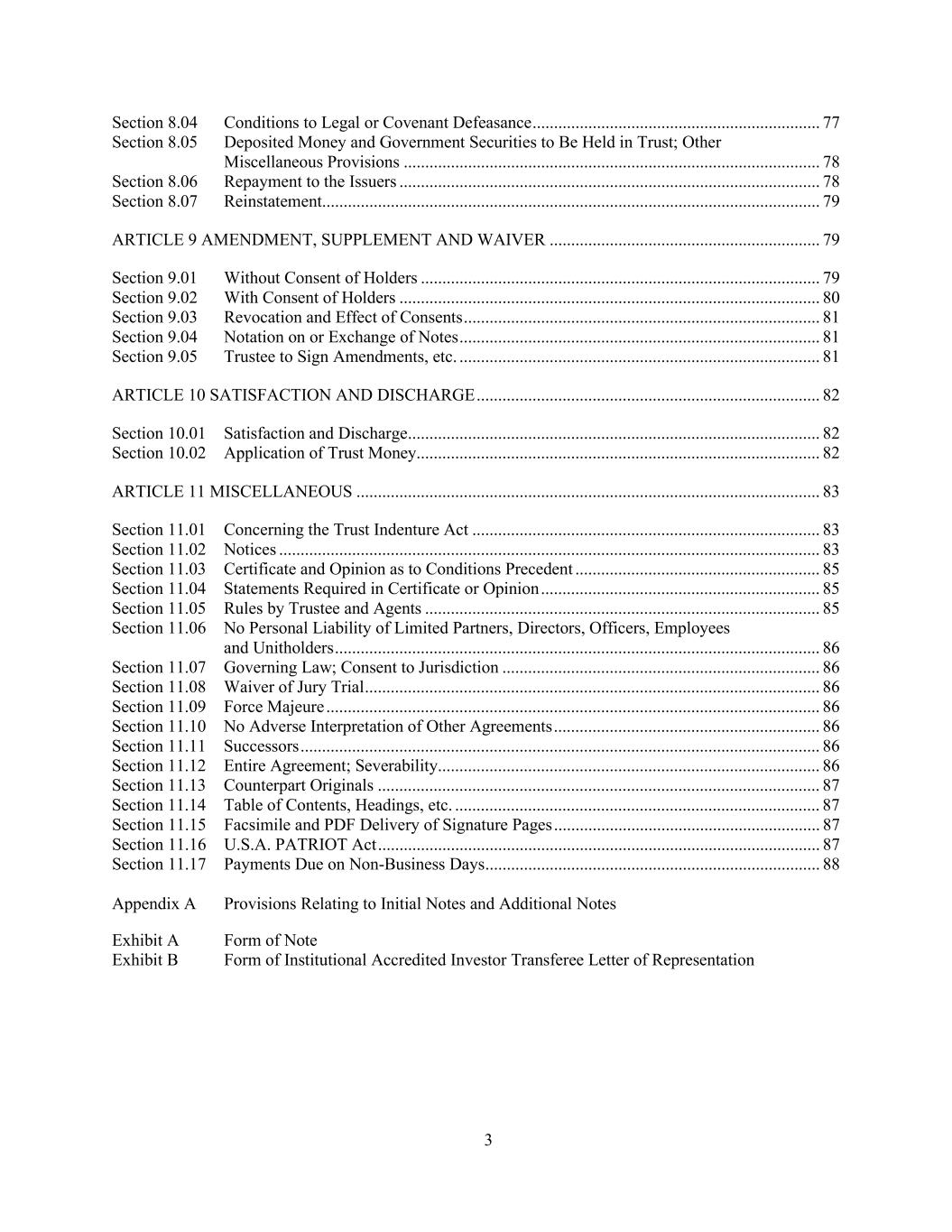3 Section 8.04 Conditions to Legal or Covenant Defeasance ................................................................... 77 Section 8.05 Deposited Money and Government Securities to Be Held in Trust; Other Miscellaneous Provisions ................................................................................................. 78 Section 8.06 Repayment to the Issuers .................................................................................................. 78 Section 8.07 Reinstatement .................................................................................................................... 79 ARTICLE 9 AMENDMENT, SUPPLEMENT AND WAIVER ............................................................... 79 Section 9.01 Without Consent of Holders ............................................................................................. 79 Section 9.02 With Consent of Holders .................................................................................................. 80 Section 9.03 Revocation and Effect of Consents ................................................................................... 81 Section 9.04 Notation on or Exchange of Notes .................................................................................... 81 Section 9.05 Trustee to Sign Amendments, etc. .................................................................................... 81 ARTICLE 10 SATISFACTION AND DISCHARGE ................................................................................ 82 Section 10.01 Satisfaction and Discharge ................................................................................................ 82 Section 10.02 Application of Trust Money.............................................................................................. 82 ARTICLE 11 MISCELLANEOUS ............................................................................................................ 83 Section 11.01 Concerning the Trust Indenture Act ................................................................................. 83 Section 11.02 Notices .............................................................................................................................. 83 Section 11.03 Certificate and Opinion as to Conditions Precedent ......................................................... 85 Section 11.04 Statements Required in Certificate or Opinion ................................................................. 85 Section 11.05 Rules by Trustee and Agents ............................................................................................ 85 Section 11.06 No Personal Liability of Limited Partners, Directors, Officers, Employees and Unitholders ................................................................................................................. 86 Section 11.07 Governing Law; Consent to Jurisdiction .......................................................................... 86 Section 11.08 Waiver of Jury Trial .......................................................................................................... 86 Section 11.09 Force Majeure ................................................................................................................... 86 Section 11.10 No Adverse Interpretation of Other Agreements .............................................................. 86 Section 11.11 Successors ......................................................................................................................... 86 Section 11.12 Entire Agreement; Severability ......................................................................................... 86 Section 11.13 Counterpart Originals ....................................................................................................... 87 Section 11.14 Table of Contents, Headings, etc. ..................................................................................... 87 Section 11.15 Facsimile and PDF Delivery of Signature Pages .............................................................. 87 Section 11.16 U.S.A. PATRIOT Act ....................................................................................................... 87 Section 11.17 Payments Due on Non-Business Days .............................................................................. 88 Appendix A Provisions Relating to Initial Notes and Additional Notes Exhibit A Form of Note Exhibit B Form of Institutional Accredited Investor Transferee Letter of Representation