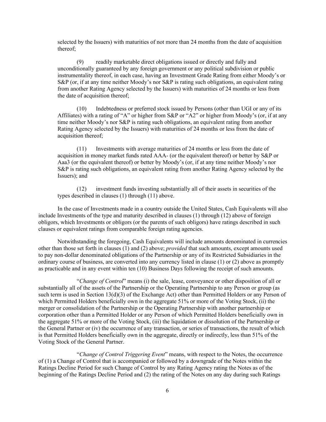 6 selected by the Issuers) with maturities of not more than 24 months from the date of acquisition thereof; (9) readily marketable direct obligations issued or directly and fully and unconditionally guaranteed by any foreign government or any political subdivision or public instrumentality thereof, in each case, having an Investment Grade Rating from either Moody’s or S&P (or, if at any time neither Moody’s nor S&P is rating such obligations, an equivalent rating from another Rating Agency selected by the Issuers) with maturities of 24 months or less from the date of acquisition thereof; (10) Indebtedness or preferred stock issued by Persons (other than UGI or any of its Affiliates) with a rating of “A” or higher from S&P or “A2” or higher from Moody’s (or, if at any time neither Moody’s nor S&P is rating such obligations, an equivalent rating from another Rating Agency selected by the Issuers) with maturities of 24 months or less from the date of acquisition thereof; (11) Investments with average maturities of 24 months or less from the date of acquisition in money market funds rated AAA- (or the equivalent thereof) or better by S&P or Aaa3 (or the equivalent thereof) or better by Moody’s (or, if at any time neither Moody’s nor S&P is rating such obligations, an equivalent rating from another Rating Agency selected by the Issuers); and (12) investment funds investing substantially all of their assets in securities of the types described in clauses (1) through (11) above. In the case of Investments made in a country outside the United States, Cash Equivalents will also include Investments of the type and maturity described in clauses (1) through (12) above of foreign obligors, which Investments or obligors (or the parents of such obligors) have ratings described in such clauses or equivalent ratings from comparable foreign rating agencies. Notwithstanding the foregoing, Cash Equivalents will include amounts denominated in currencies other than those set forth in clauses (1) and (2) above; provided that such amounts, except amounts used to pay non-dollar denominated obligations of the Partnership or any of its Restricted Subsidiaries in the ordinary course of business, are converted into any currency listed in clause (1) or (2) above as promptly as practicable and in any event within ten (10) Business Days following the receipt of such amounts. “Change of Control” means (i) the sale, lease, conveyance or other disposition of all or substantially all of the assets of the Partnership or the Operating Partnership to any Person or group (as such term is used in Section 13(d)(3) of the Exchange Act) other than Permitted Holders or any Person of which Permitted Holders beneficially own in the aggregate 51% or more of the Voting Stock, (ii) the merger or consolidation of the Partnership or the Operating Partnership with another partnership or corporation other than a Permitted Holder or any Person of which Permitted Holders beneficially own in the aggregate 51% or more of the Voting Stock, (iii) the liquidation or dissolution of the Partnership or the General Partner or (iv) the occurrence of any transaction, or series of transactions, the result of which is that Permitted Holders beneficially own in the aggregate, directly or indirectly, less than 51% of the Voting Stock of the General Partner. “Change of Control Triggering Event” means, with respect to the Notes, the occurrence of (1) a Change of Control that is accompanied or followed by a downgrade of the Notes within the Ratings Decline Period for such Change of Control by any Rating Agency rating the Notes as of the beginning of the Ratings Decline Period and (2) the rating of the Notes on any day during such Ratings