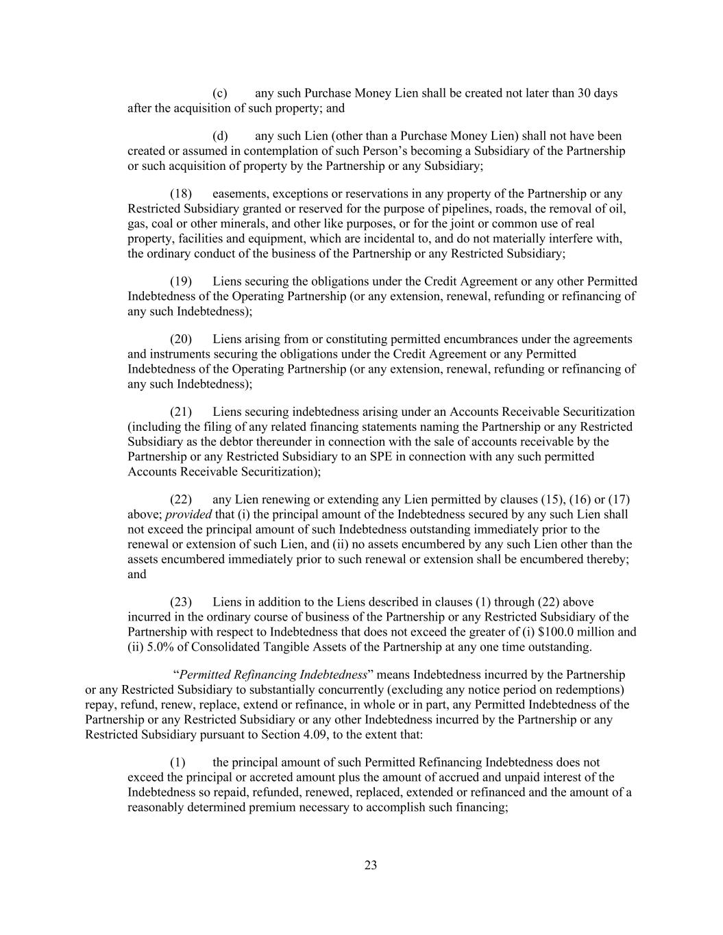 23 (c) any such Purchase Money Lien shall be created not later than 30 days after the acquisition of such property; and (d) any such Lien (other than a Purchase Money Lien) shall not have been created or assumed in contemplation of such Person’s becoming a Subsidiary of the Partnership or such acquisition of property by the Partnership or any Subsidiary; (18) easements, exceptions or reservations in any property of the Partnership or any Restricted Subsidiary granted or reserved for the purpose of pipelines, roads, the removal of oil, gas, coal or other minerals, and other like purposes, or for the joint or common use of real property, facilities and equipment, which are incidental to, and do not materially interfere with, the ordinary conduct of the business of the Partnership or any Restricted Subsidiary; (19) Liens securing the obligations under the Credit Agreement or any other Permitted Indebtedness of the Operating Partnership (or any extension, renewal, refunding or refinancing of any such Indebtedness); (20) Liens arising from or constituting permitted encumbrances under the agreements and instruments securing the obligations under the Credit Agreement or any Permitted Indebtedness of the Operating Partnership (or any extension, renewal, refunding or refinancing of any such Indebtedness); (21) Liens securing indebtedness arising under an Accounts Receivable Securitization (including the filing of any related financing statements naming the Partnership or any Restricted Subsidiary as the debtor thereunder in connection with the sale of accounts receivable by the Partnership or any Restricted Subsidiary to an SPE in connection with any such permitted Accounts Receivable Securitization); (22) any Lien renewing or extending any Lien permitted by clauses (15), (16) or (17) above; provided that (i) the principal amount of the Indebtedness secured by any such Lien shall not exceed the principal amount of such Indebtedness outstanding immediately prior to the renewal or extension of such Lien, and (ii) no assets encumbered by any such Lien other than the assets encumbered immediately prior to such renewal or extension shall be encumbered thereby; and (23) Liens in addition to the Liens described in clauses (1) through (22) above incurred in the ordinary course of business of the Partnership or any Restricted Subsidiary of the Partnership with respect to Indebtedness that does not exceed the greater of (i) $100.0 million and (ii) 5.0% of Consolidated Tangible Assets of the Partnership at any one time outstanding. “Permitted Refinancing Indebtedness” means Indebtedness incurred by the Partnership or any Restricted Subsidiary to substantially concurrently (excluding any notice period on redemptions) repay, refund, renew, replace, extend or refinance, in whole or in part, any Permitted Indebtedness of the Partnership or any Restricted Subsidiary or any other Indebtedness incurred by the Partnership or any Restricted Subsidiary pursuant to Section 4.09, to the extent that: (1) the principal amount of such Permitted Refinancing Indebtedness does not exceed the principal or accreted amount plus the amount of accrued and unpaid interest of the Indebtedness so repaid, refunded, renewed, replaced, extended or refinanced and the amount of a reasonably determined premium necessary to accomplish such financing;