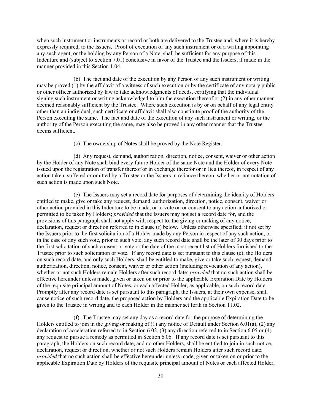 30 when such instrument or instruments or record or both are delivered to the Trustee and, where it is hereby expressly required, to the Issuers. Proof of execution of any such instrument or of a writing appointing any such agent, or the holding by any Person of a Note, shall be sufficient for any purpose of this Indenture and (subject to Section 7.01) conclusive in favor of the Trustee and the Issuers, if made in the manner provided in this Section 1.04. (b) The fact and date of the execution by any Person of any such instrument or writing may be proved (1) by the affidavit of a witness of such execution or by the certificate of any notary public or other officer authorized by law to take acknowledgments of deeds, certifying that the individual signing such instrument or writing acknowledged to him the execution thereof or (2) in any other manner deemed reasonably sufficient by the Trustee. Where such execution is by or on behalf of any legal entity other than an individual, such certificate or affidavit shall also constitute proof of the authority of the Person executing the same. The fact and date of the execution of any such instrument or writing, or the authority of the Person executing the same, may also be proved in any other manner that the Trustee deems sufficient. (c) The ownership of Notes shall be proved by the Note Register. (d) Any request, demand, authorization, direction, notice, consent, waiver or other action by the Holder of any Note shall bind every future Holder of the same Note and the Holder of every Note issued upon the registration of transfer thereof or in exchange therefor or in lieu thereof, in respect of any action taken, suffered or omitted by a Trustee or the Issuers in reliance thereon, whether or not notation of such action is made upon such Note. (e) The Issuers may set a record date for purposes of determining the identity of Holders entitled to make, give or take any request, demand, authorization, direction, notice, consent, waiver or other action provided in this Indenture to be made, or to vote on or consent to any action authorized or permitted to be taken by Holders; provided that the Issuers may not set a record date for, and the provisions of this paragraph shall not apply with respect to, the giving or making of any notice, declaration, request or direction referred to in clause (f) below. Unless otherwise specified, if not set by the Issuers prior to the first solicitation of a Holder made by any Person in respect of any such action, or in the case of any such vote, prior to such vote, any such record date shall be the later of 30 days prior to the first solicitation of such consent or vote or the date of the most recent list of Holders furnished to the Trustee prior to such solicitation or vote. If any record date is set pursuant to this clause (e), the Holders on such record date, and only such Holders, shall be entitled to make, give or take such request, demand, authorization, direction, notice, consent, waiver or other action (including revocation of any action), whether or not such Holders remain Holders after such record date; provided that no such action shall be effective hereunder unless made, given or taken on or prior to the applicable Expiration Date by Holders of the requisite principal amount of Notes, or each affected Holder, as applicable, on such record date. Promptly after any record date is set pursuant to this paragraph, the Issuers, at their own expense, shall cause notice of such record date, the proposed action by Holders and the applicable Expiration Date to be given to the Trustee in writing and to each Holder in the manner set forth in Section 11.02. (f) The Trustee may set any day as a record date for the purpose of determining the Holders entitled to join in the giving or making of (1) any notice of Default under Section 6.01(a), (2) any declaration of acceleration referred to in Section 6.02, (3) any direction referred to in Section 6.05 or (4) any request to pursue a remedy as permitted in Section 6.06. If any record date is set pursuant to this paragraph, the Holders on such record date, and no other Holders, shall be entitled to join in such notice, declaration, request or direction, whether or not such Holders remain Holders after such record date; provided that no such action shall be effective hereunder unless made, given or taken on or prior to the applicable Expiration Date by Holders of the requisite principal amount of Notes or each affected Holder,