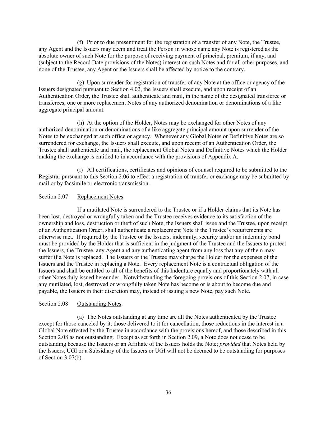 36 (f) Prior to due presentment for the registration of a transfer of any Note, the Trustee, any Agent and the Issuers may deem and treat the Person in whose name any Note is registered as the absolute owner of such Note for the purpose of receiving payment of principal, premium, if any, and (subject to the Record Date provisions of the Notes) interest on such Notes and for all other purposes, and none of the Trustee, any Agent or the Issuers shall be affected by notice to the contrary. (g) Upon surrender for registration of transfer of any Note at the office or agency of the Issuers designated pursuant to Section 4.02, the Issuers shall execute, and upon receipt of an Authentication Order, the Trustee shall authenticate and mail, in the name of the designated transferee or transferees, one or more replacement Notes of any authorized denomination or denominations of a like aggregate principal amount. (h) At the option of the Holder, Notes may be exchanged for other Notes of any authorized denomination or denominations of a like aggregate principal amount upon surrender of the Notes to be exchanged at such office or agency. Whenever any Global Notes or Definitive Notes are so surrendered for exchange, the Issuers shall execute, and upon receipt of an Authentication Order, the Trustee shall authenticate and mail, the replacement Global Notes and Definitive Notes which the Holder making the exchange is entitled to in accordance with the provisions of Appendix A. (i) All certifications, certificates and opinions of counsel required to be submitted to the Registrar pursuant to this Section 2.06 to effect a registration of transfer or exchange may be submitted by mail or by facsimile or electronic transmission. Section 2.07 Replacement Notes. If a mutilated Note is surrendered to the Trustee or if a Holder claims that its Note has been lost, destroyed or wrongfully taken and the Trustee receives evidence to its satisfaction of the ownership and loss, destruction or theft of such Note, the Issuers shall issue and the Trustee, upon receipt of an Authentication Order, shall authenticate a replacement Note if the Trustee’s requirements are otherwise met. If required by the Trustee or the Issuers, indemnity, security and/or an indemnity bond must be provided by the Holder that is sufficient in the judgment of the Trustee and the Issuers to protect the Issuers, the Trustee, any Agent and any authenticating agent from any loss that any of them may suffer if a Note is replaced. The Issuers or the Trustee may charge the Holder for the expenses of the Issuers and the Trustee in replacing a Note. Every replacement Note is a contractual obligation of the Issuers and shall be entitled to all of the benefits of this Indenture equally and proportionately with all other Notes duly issued hereunder. Notwithstanding the foregoing provisions of this Section 2.07, in case any mutilated, lost, destroyed or wrongfully taken Note has become or is about to become due and payable, the Issuers in their discretion may, instead of issuing a new Note, pay such Note. Section 2.08 Outstanding Notes. (a) The Notes outstanding at any time are all the Notes authenticated by the Trustee except for those canceled by it, those delivered to it for cancellation, those reductions in the interest in a Global Note effected by the Trustee in accordance with the provisions hereof, and those described in this Section 2.08 as not outstanding. Except as set forth in Section 2.09, a Note does not cease to be outstanding because the Issuers or an Affiliate of the Issuers holds the Note; provided that Notes held by the Issuers, UGI or a Subsidiary of the Issuers or UGI will not be deemed to be outstanding for purposes of Section 3.07(b).