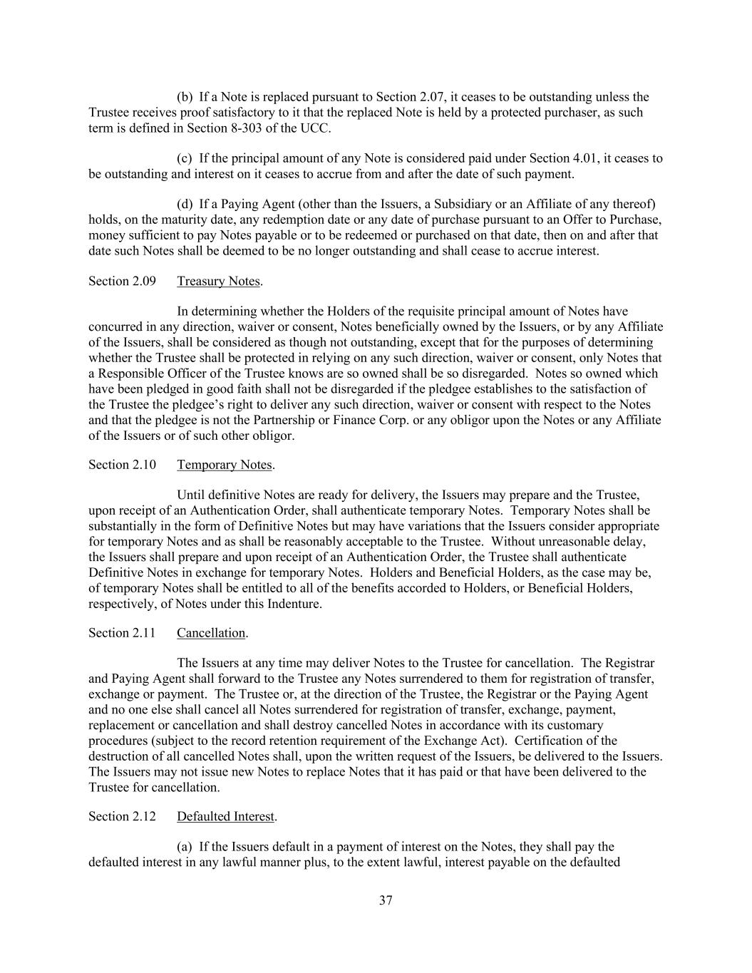 37 (b) If a Note is replaced pursuant to Section 2.07, it ceases to be outstanding unless the Trustee receives proof satisfactory to it that the replaced Note is held by a protected purchaser, as such term is defined in Section 8-303 of the UCC. (c) If the principal amount of any Note is considered paid under Section 4.01, it ceases to be outstanding and interest on it ceases to accrue from and after the date of such payment. (d) If a Paying Agent (other than the Issuers, a Subsidiary or an Affiliate of any thereof) holds, on the maturity date, any redemption date or any date of purchase pursuant to an Offer to Purchase, money sufficient to pay Notes payable or to be redeemed or purchased on that date, then on and after that date such Notes shall be deemed to be no longer outstanding and shall cease to accrue interest. Section 2.09 Treasury Notes. In determining whether the Holders of the requisite principal amount of Notes have concurred in any direction, waiver or consent, Notes beneficially owned by the Issuers, or by any Affiliate of the Issuers, shall be considered as though not outstanding, except that for the purposes of determining whether the Trustee shall be protected in relying on any such direction, waiver or consent, only Notes that a Responsible Officer of the Trustee knows are so owned shall be so disregarded. Notes so owned which have been pledged in good faith shall not be disregarded if the pledgee establishes to the satisfaction of the Trustee the pledgee’s right to deliver any such direction, waiver or consent with respect to the Notes and that the pledgee is not the Partnership or Finance Corp. or any obligor upon the Notes or any Affiliate of the Issuers or of such other obligor. Section 2.10 Temporary Notes. Until definitive Notes are ready for delivery, the Issuers may prepare and the Trustee, upon receipt of an Authentication Order, shall authenticate temporary Notes. Temporary Notes shall be substantially in the form of Definitive Notes but may have variations that the Issuers consider appropriate for temporary Notes and as shall be reasonably acceptable to the Trustee. Without unreasonable delay, the Issuers shall prepare and upon receipt of an Authentication Order, the Trustee shall authenticate Definitive Notes in exchange for temporary Notes. Holders and Beneficial Holders, as the case may be, of temporary Notes shall be entitled to all of the benefits accorded to Holders, or Beneficial Holders, respectively, of Notes under this Indenture. Section 2.11 Cancellation. The Issuers at any time may deliver Notes to the Trustee for cancellation. The Registrar and Paying Agent shall forward to the Trustee any Notes surrendered to them for registration of transfer, exchange or payment. The Trustee or, at the direction of the Trustee, the Registrar or the Paying Agent and no one else shall cancel all Notes surrendered for registration of transfer, exchange, payment, replacement or cancellation and shall destroy cancelled Notes in accordance with its customary procedures (subject to the record retention requirement of the Exchange Act). Certification of the destruction of all cancelled Notes shall, upon the written request of the Issuers, be delivered to the Issuers. The Issuers may not issue new Notes to replace Notes that it has paid or that have been delivered to the Trustee for cancellation. Section 2.12 Defaulted Interest. (a) If the Issuers default in a payment of interest on the Notes, they shall pay the defaulted interest in any lawful manner plus, to the extent lawful, interest payable on the defaulted