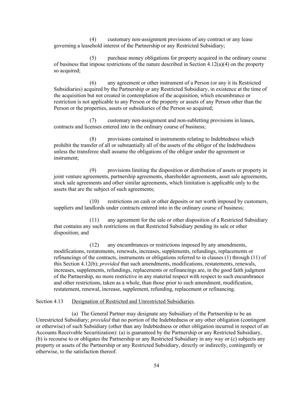 54 (4) customary non-assignment provisions of any contract or any lease governing a leasehold interest of the Partnership or any Restricted Subsidiary; (5) purchase money obligations for property acquired in the ordinary course of business that impose restrictions of the nature described in Section 4.12(a)(4) on the property so acquired; (6) any agreement or other instrument of a Person (or any it its Restricted Subsidiaries) acquired by the Partnership or any Restricted Subsidiary, in existence at the time of the acquisition but not created in contemplation of the acquisition, which encumbrance or restriction is not applicable to any Person or the property or assets of any Person other than the Person or the properties, assets or subsidiaries of the Person so acquired; (7) customary non-assignment and non-subletting provisions in leases, contracts and licenses entered into in the ordinary course of business; (8) provisions contained in instruments relating to Indebtedness which prohibit the transfer of all or substantially all of the assets of the obligor of the Indebtedness unless the transferee shall assume the obligations of the obligor under the agreement or instrument; (9) provisions limiting the disposition or distribution of assets or property in joint venture agreements, partnership agreements, shareholder agreements, asset sale agreements, stock sale agreements and other similar agreements, which limitation is applicable only to the assets that are the subject of such agreements; (10) restrictions on cash or other deposits or net worth imposed by customers, suppliers and landlords under contracts entered into in the ordinary course of business; (11) any agreement for the sale or other disposition of a Restricted Subsidiary that contains any such restrictions on that Restricted Subsidiary pending its sale or other disposition; and (12) any encumbrances or restrictions imposed by any amendments, modifications, restatements, renewals, increases, supplements, refundings, replacements or refinancings of the contracts, instruments or obligations referred to in clauses (1) through (11) of this Section 4.12(b); provided that such amendments, modifications, restatements, renewals, increases, supplements, refundings, replacements or refinancings are, in the good faith judgment of the Partnership, no more restrictive in any material respect with respect to such encumbrance and other restrictions, taken as a whole, than those prior to such amendment, modification, restatement, renewal, increase, supplement, refunding, replacement or refinancing. Section 4.13 Designation of Restricted and Unrestricted Subsidiaries. (a) The General Partner may designate any Subsidiary of the Partnership to be an Unrestricted Subsidiary; provided that no portion of the Indebtedness or any other obligation (contingent or otherwise) of such Subsidiary (other than any Indebtedness or other obligation incurred in respect of an Accounts Receivable Securitization): (a) is guaranteed by the Partnership or any Restricted Subsidiary, (b) is recourse to or obligates the Partnership or any Restricted Subsidiary in any way or (c) subjects any property or assets of the Partnership or any Restricted Subsidiary, directly or indirectly, contingently or otherwise, to the satisfaction thereof.