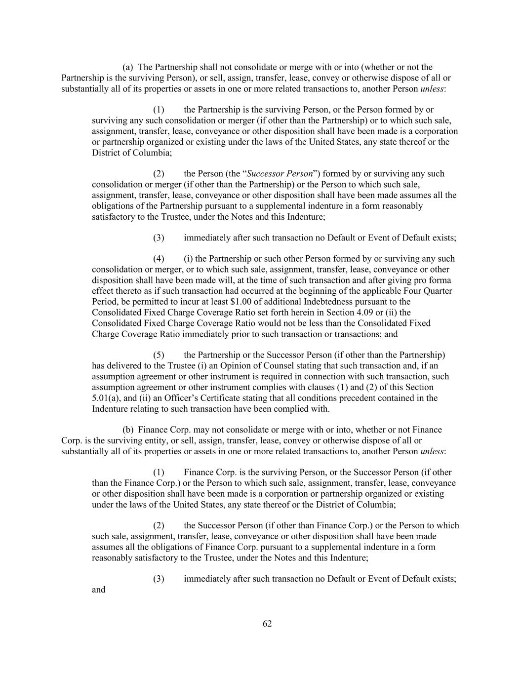 62 (a) The Partnership shall not consolidate or merge with or into (whether or not the Partnership is the surviving Person), or sell, assign, transfer, lease, convey or otherwise dispose of all or substantially all of its properties or assets in one or more related transactions to, another Person unless: (1) the Partnership is the surviving Person, or the Person formed by or surviving any such consolidation or merger (if other than the Partnership) or to which such sale, assignment, transfer, lease, conveyance or other disposition shall have been made is a corporation or partnership organized or existing under the laws of the United States, any state thereof or the District of Columbia; (2) the Person (the “Successor Person”) formed by or surviving any such consolidation or merger (if other than the Partnership) or the Person to which such sale, assignment, transfer, lease, conveyance or other disposition shall have been made assumes all the obligations of the Partnership pursuant to a supplemental indenture in a form reasonably satisfactory to the Trustee, under the Notes and this Indenture; (3) immediately after such transaction no Default or Event of Default exists; (4) (i) the Partnership or such other Person formed by or surviving any such consolidation or merger, or to which such sale, assignment, transfer, lease, conveyance or other disposition shall have been made will, at the time of such transaction and after giving pro forma effect thereto as if such transaction had occurred at the beginning of the applicable Four Quarter Period, be permitted to incur at least $1.00 of additional Indebtedness pursuant to the Consolidated Fixed Charge Coverage Ratio set forth herein in Section 4.09 or (ii) the Consolidated Fixed Charge Coverage Ratio would not be less than the Consolidated Fixed Charge Coverage Ratio immediately prior to such transaction or transactions; and (5) the Partnership or the Successor Person (if other than the Partnership) has delivered to the Trustee (i) an Opinion of Counsel stating that such transaction and, if an assumption agreement or other instrument is required in connection with such transaction, such assumption agreement or other instrument complies with clauses (1) and (2) of this Section 5.01(a), and (ii) an Officer’s Certificate stating that all conditions precedent contained in the Indenture relating to such transaction have been complied with. (b) Finance Corp. may not consolidate or merge with or into, whether or not Finance Corp. is the surviving entity, or sell, assign, transfer, lease, convey or otherwise dispose of all or substantially all of its properties or assets in one or more related transactions to, another Person unless: (1) Finance Corp. is the surviving Person, or the Successor Person (if other than the Finance Corp.) or the Person to which such sale, assignment, transfer, lease, conveyance or other disposition shall have been made is a corporation or partnership organized or existing under the laws of the United States, any state thereof or the District of Columbia; (2) the Successor Person (if other than Finance Corp.) or the Person to which such sale, assignment, transfer, lease, conveyance or other disposition shall have been made assumes all the obligations of Finance Corp. pursuant to a supplemental indenture in a form reasonably satisfactory to the Trustee, under the Notes and this Indenture; (3) immediately after such transaction no Default or Event of Default exists; and