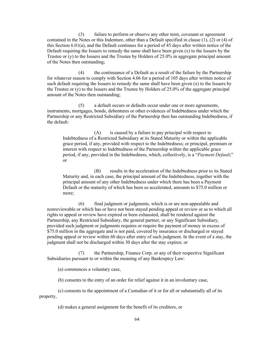 64 (3) failure to perform or observe any other term, covenant or agreement contained in the Notes or this Indenture, other than a Default specified in clause (1), (2) or (4) of this Section 6.01(a), and the Default continues for a period of 45 days after written notice of the Default requiring the Issuers to remedy the same shall have been given (x) to the Issuers by the Trustee or (y) to the Issuers and the Trustee by Holders of 25.0% in aggregate principal amount of the Notes then outstanding; (4) the continuance of a Default as a result of the failure by the Partnership for whatever reason to comply with Section 4.06 for a period of 105 days after written notice of such default requiring the Issuers to remedy the same shall have been given (x) to the Issuers by the Trustee or (y) to the Issuers and the Trustee by Holders of 25.0% of the aggregate principal amount of the Notes then outstanding; (5) a default occurs or defaults occur under one or more agreements, instruments, mortgages, bonds, debentures or other evidences of Indebtedness under which the Partnership or any Restricted Subsidiary of the Partnership then has outstanding Indebtedness, if the default: (A) is caused by a failure to pay principal with respect to Indebtedness of a Restricted Subsidiary at its Stated Maturity or within the applicable grace period, if any, provided with respect to the Indebtedness; or principal, premium or interest with respect to Indebtedness of the Partnership within the applicable grace period, if any, provided in the Indebtedness, which, collectively, is a “Payment Default;” or (B) results in the acceleration of the Indebtedness prior to its Stated Maturity and, in each case, the principal amount of the Indebtedness, together with the principal amount of any other Indebtedness under which there has been a Payment Default or the maturity of which has been so accelerated, amounts to $75.0 million or more; (6) final judgment or judgments, which is or are non-appealable and nonreviewable or which has or have not been stayed pending appeal or review or as to which all rights to appeal or review have expired or been exhausted, shall be rendered against the Partnership, any Restricted Subsidiary, the general partner, or any Significant Subsidiary, provided such judgment or judgments requires or require the payment of money in excess of $75.0 million in the aggregate and is not paid, covered by insurance or discharged or stayed pending appeal or review within 60 days after entry of such judgment. In the event of a stay, the judgment shall not be discharged within 30 days after the stay expires; or (7) the Partnership, Finance Corp. or any of their respective Significant Subsidiaries pursuant to or within the meaning of any Bankruptcy Law: (a) commences a voluntary case, (b) consents to the entry of an order for relief against it in an involuntary case, (c) consents to the appointment of a Custodian of it or for all or substantially all of its property, (d) makes a general assignment for the benefit of its creditors, or