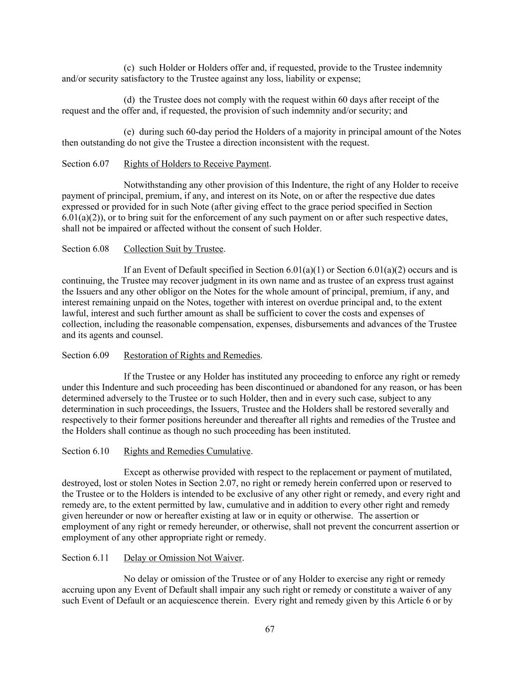 67 (c) such Holder or Holders offer and, if requested, provide to the Trustee indemnity and/or security satisfactory to the Trustee against any loss, liability or expense; (d) the Trustee does not comply with the request within 60 days after receipt of the request and the offer and, if requested, the provision of such indemnity and/or security; and (e) during such 60-day period the Holders of a majority in principal amount of the Notes then outstanding do not give the Trustee a direction inconsistent with the request. Section 6.07 Rights of Holders to Receive Payment. Notwithstanding any other provision of this Indenture, the right of any Holder to receive payment of principal, premium, if any, and interest on its Note, on or after the respective due dates expressed or provided for in such Note (after giving effect to the grace period specified in Section 6.01(a)(2)), or to bring suit for the enforcement of any such payment on or after such respective dates, shall not be impaired or affected without the consent of such Holder. Section 6.08 Collection Suit by Trustee. If an Event of Default specified in Section 6.01(a)(1) or Section 6.01(a)(2) occurs and is continuing, the Trustee may recover judgment in its own name and as trustee of an express trust against the Issuers and any other obligor on the Notes for the whole amount of principal, premium, if any, and interest remaining unpaid on the Notes, together with interest on overdue principal and, to the extent lawful, interest and such further amount as shall be sufficient to cover the costs and expenses of collection, including the reasonable compensation, expenses, disbursements and advances of the Trustee and its agents and counsel. Section 6.09 Restoration of Rights and Remedies. If the Trustee or any Holder has instituted any proceeding to enforce any right or remedy under this Indenture and such proceeding has been discontinued or abandoned for any reason, or has been determined adversely to the Trustee or to such Holder, then and in every such case, subject to any determination in such proceedings, the Issuers, Trustee and the Holders shall be restored severally and respectively to their former positions hereunder and thereafter all rights and remedies of the Trustee and the Holders shall continue as though no such proceeding has been instituted. Section 6.10 Rights and Remedies Cumulative. Except as otherwise provided with respect to the replacement or payment of mutilated, destroyed, lost or stolen Notes in Section 2.07, no right or remedy herein conferred upon or reserved to the Trustee or to the Holders is intended to be exclusive of any other right or remedy, and every right and remedy are, to the extent permitted by law, cumulative and in addition to every other right and remedy given hereunder or now or hereafter existing at law or in equity or otherwise. The assertion or employment of any right or remedy hereunder, or otherwise, shall not prevent the concurrent assertion or employment of any other appropriate right or remedy. Section 6.11 Delay or Omission Not Waiver. No delay or omission of the Trustee or of any Holder to exercise any right or remedy accruing upon any Event of Default shall impair any such right or remedy or constitute a waiver of any such Event of Default or an acquiescence therein. Every right and remedy given by this Article 6 or by