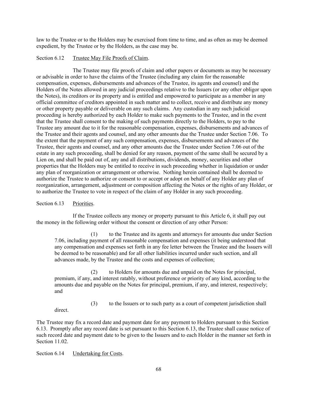 68 law to the Trustee or to the Holders may be exercised from time to time, and as often as may be deemed expedient, by the Trustee or by the Holders, as the case may be. Section 6.12 Trustee May File Proofs of Claim. The Trustee may file proofs of claim and other papers or documents as may be necessary or advisable in order to have the claims of the Trustee (including any claim for the reasonable compensation, expenses, disbursements and advances of the Trustee, its agents and counsel) and the Holders of the Notes allowed in any judicial proceedings relative to the Issuers (or any other obligor upon the Notes), its creditors or its property and is entitled and empowered to participate as a member in any official committee of creditors appointed in such matter and to collect, receive and distribute any money or other property payable or deliverable on any such claims. Any custodian in any such judicial proceeding is hereby authorized by each Holder to make such payments to the Trustee, and in the event that the Trustee shall consent to the making of such payments directly to the Holders, to pay to the Trustee any amount due to it for the reasonable compensation, expenses, disbursements and advances of the Trustee and their agents and counsel, and any other amounts due the Trustee under Section 7.06. To the extent that the payment of any such compensation, expenses, disbursements and advances of the Trustee, their agents and counsel, and any other amounts due the Trustee under Section 7.06 out of the estate in any such proceeding, shall be denied for any reason, payment of the same shall be secured by a Lien on, and shall be paid out of, any and all distributions, dividends, money, securities and other properties that the Holders may be entitled to receive in such proceeding whether in liquidation or under any plan of reorganization or arrangement or otherwise. Nothing herein contained shall be deemed to authorize the Trustee to authorize or consent to or accept or adopt on behalf of any Holder any plan of reorganization, arrangement, adjustment or composition affecting the Notes or the rights of any Holder, or to authorize the Trustee to vote in respect of the claim of any Holder in any such proceeding. Section 6.13 Priorities. If the Trustee collects any money or property pursuant to this Article 6, it shall pay out the money in the following order without the consent or direction of any other Person: (1) to the Trustee and its agents and attorneys for amounts due under Section 7.06, including payment of all reasonable compensation and expenses (it being understood that any compensation and expenses set forth in any fee letter between the Trustee and the Issuers will be deemed to be reasonable) and for all other liabilities incurred under such section, and all advances made, by the Trustee and the costs and expenses of collection; (2) to Holders for amounts due and unpaid on the Notes for principal, premium, if any, and interest ratably, without preference or priority of any kind, according to the amounts due and payable on the Notes for principal, premium, if any, and interest, respectively; and (3) to the Issuers or to such party as a court of competent jurisdiction shall direct. The Trustee may fix a record date and payment date for any payment to Holders pursuant to this Section 6.13. Promptly after any record date is set pursuant to this Section 6.13, the Trustee shall cause notice of such record date and payment date to be given to the Issuers and to each Holder in the manner set forth in Section 11.02. Section 6.14 Undertaking for Costs.