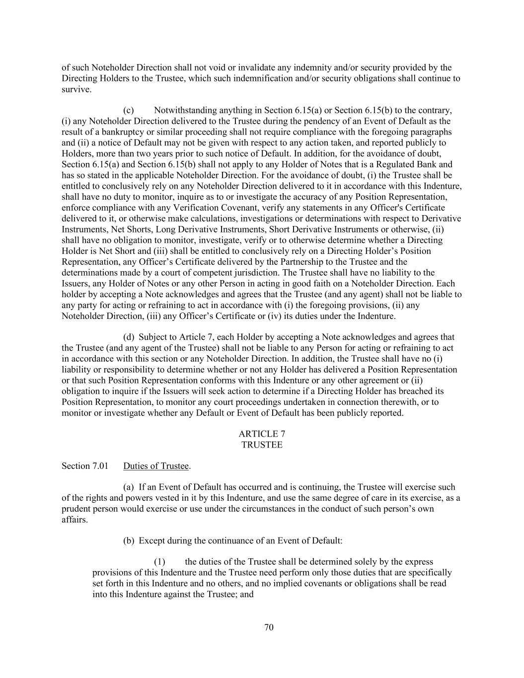 70 of such Noteholder Direction shall not void or invalidate any indemnity and/or security provided by the Directing Holders to the Trustee, which such indemnification and/or security obligations shall continue to survive. (c) Notwithstanding anything in Section 6.15(a) or Section 6.15(b) to the contrary, (i) any Noteholder Direction delivered to the Trustee during the pendency of an Event of Default as the result of a bankruptcy or similar proceeding shall not require compliance with the foregoing paragraphs and (ii) a notice of Default may not be given with respect to any action taken, and reported publicly to Holders, more than two years prior to such notice of Default. In addition, for the avoidance of doubt, Section 6.15(a) and Section 6.15(b) shall not apply to any Holder of Notes that is a Regulated Bank and has so stated in the applicable Noteholder Direction. For the avoidance of doubt, (i) the Trustee shall be entitled to conclusively rely on any Noteholder Direction delivered to it in accordance with this Indenture, shall have no duty to monitor, inquire as to or investigate the accuracy of any Position Representation, enforce compliance with any Verification Covenant, verify any statements in any Officer's Certificate delivered to it, or otherwise make calculations, investigations or determinations with respect to Derivative Instruments, Net Shorts, Long Derivative Instruments, Short Derivative Instruments or otherwise, (ii) shall have no obligation to monitor, investigate, verify or to otherwise determine whether a Directing Holder is Net Short and (iii) shall be entitled to conclusively rely on a Directing Holder’s Position Representation, any Officer’s Certificate delivered by the Partnership to the Trustee and the determinations made by a court of competent jurisdiction. The Trustee shall have no liability to the Issuers, any Holder of Notes or any other Person in acting in good faith on a Noteholder Direction. Each holder by accepting a Note acknowledges and agrees that the Trustee (and any agent) shall not be liable to any party for acting or refraining to act in accordance with (i) the foregoing provisions, (ii) any Noteholder Direction, (iii) any Officer’s Certificate or (iv) its duties under the Indenture. (d) Subject to Article 7, each Holder by accepting a Note acknowledges and agrees that the Trustee (and any agent of the Trustee) shall not be liable to any Person for acting or refraining to act in accordance with this section or any Noteholder Direction. In addition, the Trustee shall have no (i) liability or responsibility to determine whether or not any Holder has delivered a Position Representation or that such Position Representation conforms with this Indenture or any other agreement or (ii) obligation to inquire if the Issuers will seek action to determine if a Directing Holder has breached its Position Representation, to monitor any court proceedings undertaken in connection therewith, or to monitor or investigate whether any Default or Event of Default has been publicly reported. ARTICLE 7 TRUSTEE Section 7.01 Duties of Trustee. (a) If an Event of Default has occurred and is continuing, the Trustee will exercise such of the rights and powers vested in it by this Indenture, and use the same degree of care in its exercise, as a prudent person would exercise or use under the circumstances in the conduct of such person’s own affairs. (b) Except during the continuance of an Event of Default: (1) the duties of the Trustee shall be determined solely by the express provisions of this Indenture and the Trustee need perform only those duties that are specifically set forth in this Indenture and no others, and no implied covenants or obligations shall be read into this Indenture against the Trustee; and
