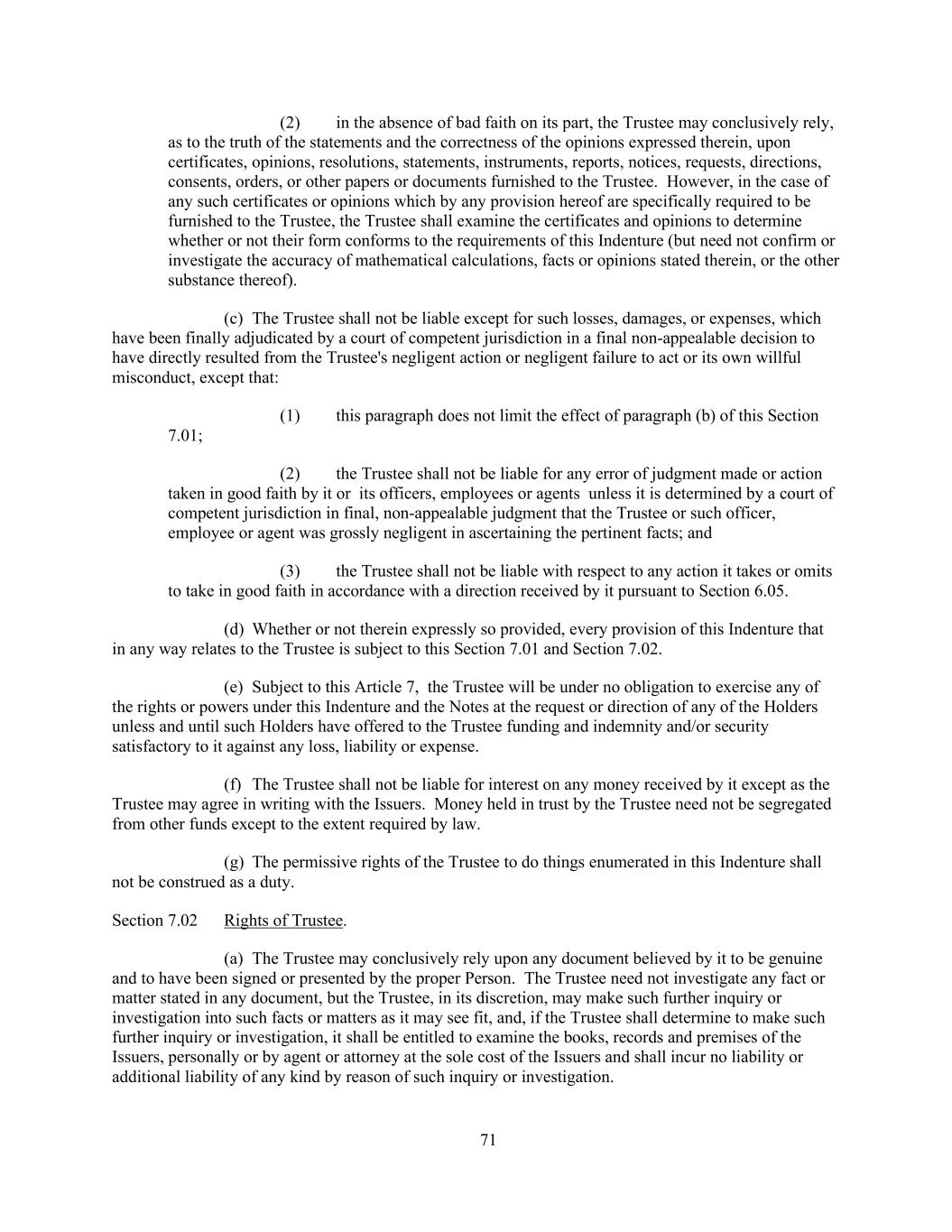 71 (2) in the absence of bad faith on its part, the Trustee may conclusively rely, as to the truth of the statements and the correctness of the opinions expressed therein, upon certificates, opinions, resolutions, statements, instruments, reports, notices, requests, directions, consents, orders, or other papers or documents furnished to the Trustee. However, in the case of any such certificates or opinions which by any provision hereof are specifically required to be furnished to the Trustee, the Trustee shall examine the certificates and opinions to determine whether or not their form conforms to the requirements of this Indenture (but need not confirm or investigate the accuracy of mathematical calculations, facts or opinions stated therein, or the other substance thereof). (c) The Trustee shall not be liable except for such losses, damages, or expenses, which have been finally adjudicated by a court of competent jurisdiction in a final non-appealable decision to have directly resulted from the Trustee's negligent action or negligent failure to act or its own willful misconduct, except that: (1) this paragraph does not limit the effect of paragraph (b) of this Section 7.01; (2) the Trustee shall not be liable for any error of judgment made or action taken in good faith by it or its officers, employees or agents unless it is determined by a court of competent jurisdiction in final, non-appealable judgment that the Trustee or such officer, employee or agent was grossly negligent in ascertaining the pertinent facts; and (3) the Trustee shall not be liable with respect to any action it takes or omits to take in good faith in accordance with a direction received by it pursuant to Section 6.05. (d) Whether or not therein expressly so provided, every provision of this Indenture that in any way relates to the Trustee is subject to this Section 7.01 and Section 7.02. (e) Subject to this Article 7, the Trustee will be under no obligation to exercise any of the rights or powers under this Indenture and the Notes at the request or direction of any of the Holders unless and until such Holders have offered to the Trustee funding and indemnity and/or security satisfactory to it against any loss, liability or expense. (f) The Trustee shall not be liable for interest on any money received by it except as the Trustee may agree in writing with the Issuers. Money held in trust by the Trustee need not be segregated from other funds except to the extent required by law. (g) The permissive rights of the Trustee to do things enumerated in this Indenture shall not be construed as a duty. Section 7.02 Rights of Trustee. (a) The Trustee may conclusively rely upon any document believed by it to be genuine and to have been signed or presented by the proper Person. The Trustee need not investigate any fact or matter stated in any document, but the Trustee, in its discretion, may make such further inquiry or investigation into such facts or matters as it may see fit, and, if the Trustee shall determine to make such further inquiry or investigation, it shall be entitled to examine the books, records and premises of the Issuers, personally or by agent or attorney at the sole cost of the Issuers and shall incur no liability or additional liability of any kind by reason of such inquiry or investigation.