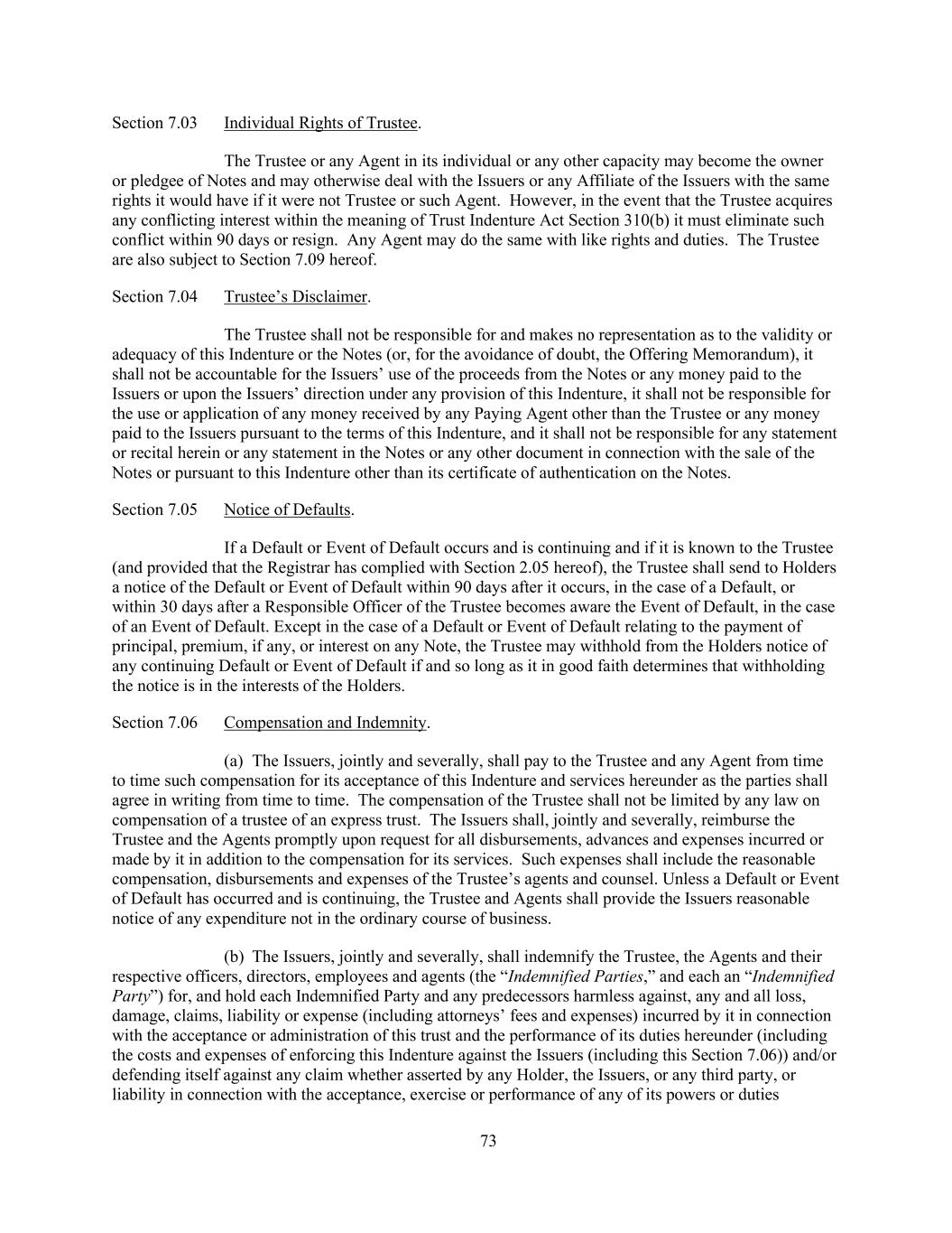 73 Section 7.03 Individual Rights of Trustee. The Trustee or any Agent in its individual or any other capacity may become the owner or pledgee of Notes and may otherwise deal with the Issuers or any Affiliate of the Issuers with the same rights it would have if it were not Trustee or such Agent. However, in the event that the Trustee acquires any conflicting interest within the meaning of Trust Indenture Act Section 310(b) it must eliminate such conflict within 90 days or resign. Any Agent may do the same with like rights and duties. The Trustee are also subject to Section 7.09 hereof. Section 7.04 Trustee’s Disclaimer. The Trustee shall not be responsible for and makes no representation as to the validity or adequacy of this Indenture or the Notes (or, for the avoidance of doubt, the Offering Memorandum), it shall not be accountable for the Issuers’ use of the proceeds from the Notes or any money paid to the Issuers or upon the Issuers’ direction under any provision of this Indenture, it shall not be responsible for the use or application of any money received by any Paying Agent other than the Trustee or any money paid to the Issuers pursuant to the terms of this Indenture, and it shall not be responsible for any statement or recital herein or any statement in the Notes or any other document in connection with the sale of the Notes or pursuant to this Indenture other than its certificate of authentication on the Notes. Section 7.05 Notice of Defaults. If a Default or Event of Default occurs and is continuing and if it is known to the Trustee (and provided that the Registrar has complied with Section 2.05 hereof), the Trustee shall send to Holders a notice of the Default or Event of Default within 90 days after it occurs, in the case of a Default, or within 30 days after a Responsible Officer of the Trustee becomes aware the Event of Default, in the case of an Event of Default. Except in the case of a Default or Event of Default relating to the payment of principal, premium, if any, or interest on any Note, the Trustee may withhold from the Holders notice of any continuing Default or Event of Default if and so long as it in good faith determines that withholding the notice is in the interests of the Holders. Section 7.06 Compensation and Indemnity. (a) The Issuers, jointly and severally, shall pay to the Trustee and any Agent from time to time such compensation for its acceptance of this Indenture and services hereunder as the parties shall agree in writing from time to time. The compensation of the Trustee shall not be limited by any law on compensation of a trustee of an express trust. The Issuers shall, jointly and severally, reimburse the Trustee and the Agents promptly upon request for all disbursements, advances and expenses incurred or made by it in addition to the compensation for its services. Such expenses shall include the reasonable compensation, disbursements and expenses of the Trustee’s agents and counsel. Unless a Default or Event of Default has occurred and is continuing, the Trustee and Agents shall provide the Issuers reasonable notice of any expenditure not in the ordinary course of business. (b) The Issuers, jointly and severally, shall indemnify the Trustee, the Agents and their respective officers, directors, employees and agents (the “Indemnified Parties,” and each an “Indemnified Party”) for, and hold each Indemnified Party and any predecessors harmless against, any and all loss, damage, claims, liability or expense (including attorneys’ fees and expenses) incurred by it in connection with the acceptance or administration of this trust and the performance of its duties hereunder (including the costs and expenses of enforcing this Indenture against the Issuers (including this Section 7.06)) and/or defending itself against any claim whether asserted by any Holder, the Issuers, or any third party, or liability in connection with the acceptance, exercise or performance of any of its powers or duties