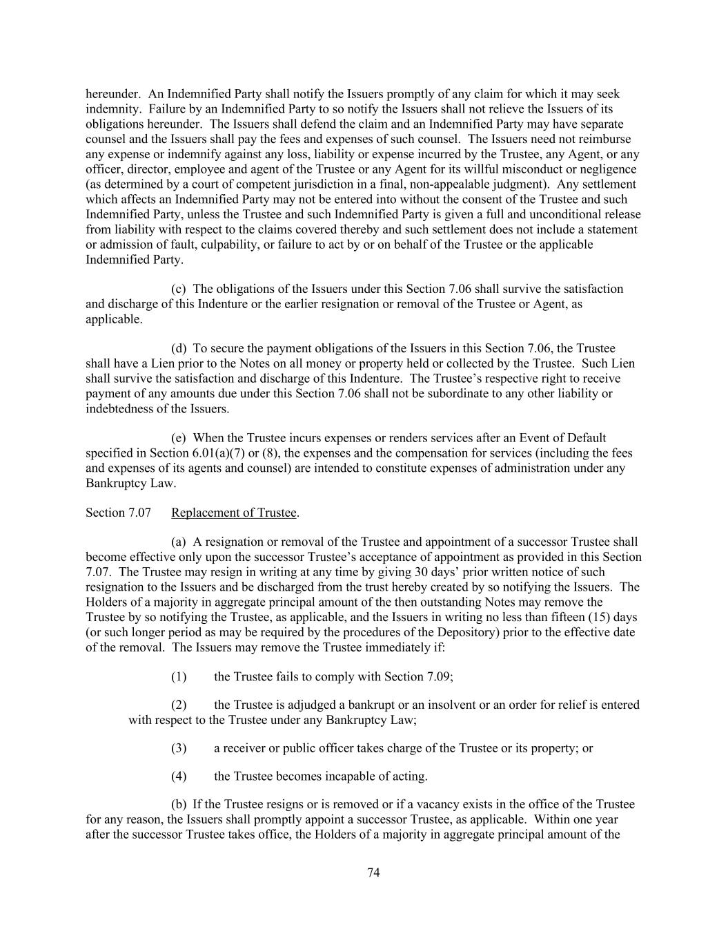 74 hereunder. An Indemnified Party shall notify the Issuers promptly of any claim for which it may seek indemnity. Failure by an Indemnified Party to so notify the Issuers shall not relieve the Issuers of its obligations hereunder. The Issuers shall defend the claim and an Indemnified Party may have separate counsel and the Issuers shall pay the fees and expenses of such counsel. The Issuers need not reimburse any expense or indemnify against any loss, liability or expense incurred by the Trustee, any Agent, or any officer, director, employee and agent of the Trustee or any Agent for its willful misconduct or negligence (as determined by a court of competent jurisdiction in a final, non-appealable judgment). Any settlement which affects an Indemnified Party may not be entered into without the consent of the Trustee and such Indemnified Party, unless the Trustee and such Indemnified Party is given a full and unconditional release from liability with respect to the claims covered thereby and such settlement does not include a statement or admission of fault, culpability, or failure to act by or on behalf of the Trustee or the applicable Indemnified Party. (c) The obligations of the Issuers under this Section 7.06 shall survive the satisfaction and discharge of this Indenture or the earlier resignation or removal of the Trustee or Agent, as applicable. (d) To secure the payment obligations of the Issuers in this Section 7.06, the Trustee shall have a Lien prior to the Notes on all money or property held or collected by the Trustee. Such Lien shall survive the satisfaction and discharge of this Indenture. The Trustee’s respective right to receive payment of any amounts due under this Section 7.06 shall not be subordinate to any other liability or indebtedness of the Issuers. (e) When the Trustee incurs expenses or renders services after an Event of Default specified in Section 6.01(a)(7) or (8), the expenses and the compensation for services (including the fees and expenses of its agents and counsel) are intended to constitute expenses of administration under any Bankruptcy Law. Section 7.07 Replacement of Trustee. (a) A resignation or removal of the Trustee and appointment of a successor Trustee shall become effective only upon the successor Trustee’s acceptance of appointment as provided in this Section 7.07. The Trustee may resign in writing at any time by giving 30 days’ prior written notice of such resignation to the Issuers and be discharged from the trust hereby created by so notifying the Issuers. The Holders of a majority in aggregate principal amount of the then outstanding Notes may remove the Trustee by so notifying the Trustee, as applicable, and the Issuers in writing no less than fifteen (15) days (or such longer period as may be required by the procedures of the Depository) prior to the effective date of the removal. The Issuers may remove the Trustee immediately if: (1) the Trustee fails to comply with Section 7.09; (2) the Trustee is adjudged a bankrupt or an insolvent or an order for relief is entered with respect to the Trustee under any Bankruptcy Law; (3) a receiver or public officer takes charge of the Trustee or its property; or (4) the Trustee becomes incapable of acting. (b) If the Trustee resigns or is removed or if a vacancy exists in the office of the Trustee for any reason, the Issuers shall promptly appoint a successor Trustee, as applicable. Within one year after the successor Trustee takes office, the Holders of a majority in aggregate principal amount of the