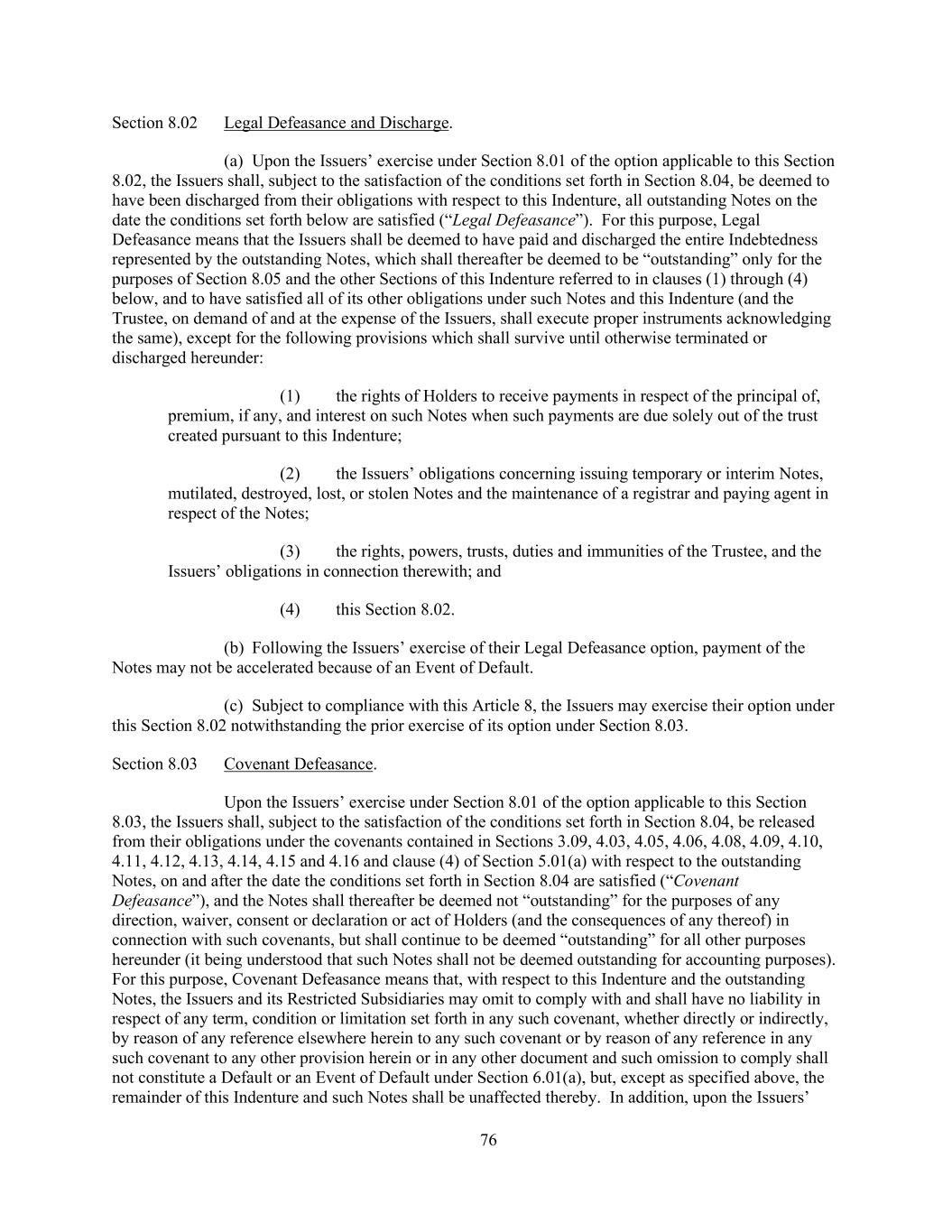 76 Section 8.02 Legal Defeasance and Discharge. (a) Upon the Issuers’ exercise under Section 8.01 of the option applicable to this Section 8.02, the Issuers shall, subject to the satisfaction of the conditions set forth in Section 8.04, be deemed to have been discharged from their obligations with respect to this Indenture, all outstanding Notes on the date the conditions set forth below are satisfied (“Legal Defeasance”). For this purpose, Legal Defeasance means that the Issuers shall be deemed to have paid and discharged the entire Indebtedness represented by the outstanding Notes, which shall thereafter be deemed to be “outstanding” only for the purposes of Section 8.05 and the other Sections of this Indenture referred to in clauses (1) through (4) below, and to have satisfied all of its other obligations under such Notes and this Indenture (and the Trustee, on demand of and at the expense of the Issuers, shall execute proper instruments acknowledging the same), except for the following provisions which shall survive until otherwise terminated or discharged hereunder: (1) the rights of Holders to receive payments in respect of the principal of, premium, if any, and interest on such Notes when such payments are due solely out of the trust created pursuant to this Indenture; (2) the Issuers’ obligations concerning issuing temporary or interim Notes, mutilated, destroyed, lost, or stolen Notes and the maintenance of a registrar and paying agent in respect of the Notes; (3) the rights, powers, trusts, duties and immunities of the Trustee, and the Issuers’ obligations in connection therewith; and (4) this Section 8.02. (b) Following the Issuers’ exercise of their Legal Defeasance option, payment of the Notes may not be accelerated because of an Event of Default. (c) Subject to compliance with this Article 8, the Issuers may exercise their option under this Section 8.02 notwithstanding the prior exercise of its option under Section 8.03. Section 8.03 Covenant Defeasance. Upon the Issuers’ exercise under Section 8.01 of the option applicable to this Section 8.03, the Issuers shall, subject to the satisfaction of the conditions set forth in Section 8.04, be released from their obligations under the covenants contained in Sections 3.09, 4.03, 4.05, 4.06, 4.08, 4.09, 4.10, 4.11, 4.12, 4.13, 4.14, 4.15 and 4.16 and clause (4) of Section 5.01(a) with respect to the outstanding Notes, on and after the date the conditions set forth in Section 8.04 are satisfied (“Covenant Defeasance”), and the Notes shall thereafter be deemed not “outstanding” for the purposes of any direction, waiver, consent or declaration or act of Holders (and the consequences of any thereof) in connection with such covenants, but shall continue to be deemed “outstanding” for all other purposes hereunder (it being understood that such Notes shall not be deemed outstanding for accounting purposes). For this purpose, Covenant Defeasance means that, with respect to this Indenture and the outstanding Notes, the Issuers and its Restricted Subsidiaries may omit to comply with and shall have no liability in respect of any term, condition or limitation set forth in any such covenant, whether directly or indirectly, by reason of any reference elsewhere herein to any such covenant or by reason of any reference in any such covenant to any other provision herein or in any other document and such omission to comply shall not constitute a Default or an Event of Default under Section 6.01(a), but, except as specified above, the remainder of this Indenture and such Notes shall be unaffected thereby. In addition, upon the Issuers’