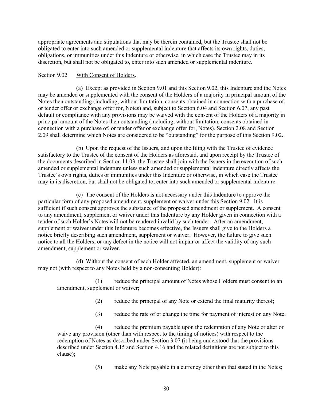 80 appropriate agreements and stipulations that may be therein contained, but the Trustee shall not be obligated to enter into such amended or supplemental indenture that affects its own rights, duties, obligations, or immunities under this Indenture or otherwise, in which case the Trustee may in its discretion, but shall not be obligated to, enter into such amended or supplemental indenture. Section 9.02 With Consent of Holders. (a) Except as provided in Section 9.01 and this Section 9.02, this Indenture and the Notes may be amended or supplemented with the consent of the Holders of a majority in principal amount of the Notes then outstanding (including, without limitation, consents obtained in connection with a purchase of, or tender offer or exchange offer for, Notes) and, subject to Section 6.04 and Section 6.07, any past default or compliance with any provisions may be waived with the consent of the Holders of a majority in principal amount of the Notes then outstanding (including, without limitation, consents obtained in connection with a purchase of, or tender offer or exchange offer for, Notes). Section 2.08 and Section 2.09 shall determine which Notes are considered to be “outstanding” for the purpose of this Section 9.02. (b) Upon the request of the Issuers, and upon the filing with the Trustee of evidence satisfactory to the Trustee of the consent of the Holders as aforesaid, and upon receipt by the Trustee of the documents described in Section 11.03, the Trustee shall join with the Issuers in the execution of such amended or supplemental indenture unless such amended or supplemental indenture directly affects the Trustee’s own rights, duties or immunities under this Indenture or otherwise, in which case the Trustee may in its discretion, but shall not be obligated to, enter into such amended or supplemental indenture. (c) The consent of the Holders is not necessary under this Indenture to approve the particular form of any proposed amendment, supplement or waiver under this Section 9.02. It is sufficient if such consent approves the substance of the proposed amendment or supplement. A consent to any amendment, supplement or waiver under this Indenture by any Holder given in connection with a tender of such Holder’s Notes will not be rendered invalid by such tender. After an amendment, supplement or waiver under this Indenture becomes effective, the Issuers shall give to the Holders a notice briefly describing such amendment, supplement or waiver. However, the failure to give such notice to all the Holders, or any defect in the notice will not impair or affect the validity of any such amendment, supplement or waiver. (d) Without the consent of each Holder affected, an amendment, supplement or waiver may not (with respect to any Notes held by a non-consenting Holder): (1) reduce the principal amount of Notes whose Holders must consent to an amendment, supplement or waiver; (2) reduce the principal of any Note or extend the final maturity thereof; (3) reduce the rate of or change the time for payment of interest on any Note; (4) reduce the premium payable upon the redemption of any Note or alter or waive any provision (other than with respect to the timing of notices) with respect to the redemption of Notes as described under Section 3.07 (it being understood that the provisions described under Section 4.15 and Section 4.16 and the related definitions are not subject to this clause); (5) make any Note payable in a currency other than that stated in the Notes;