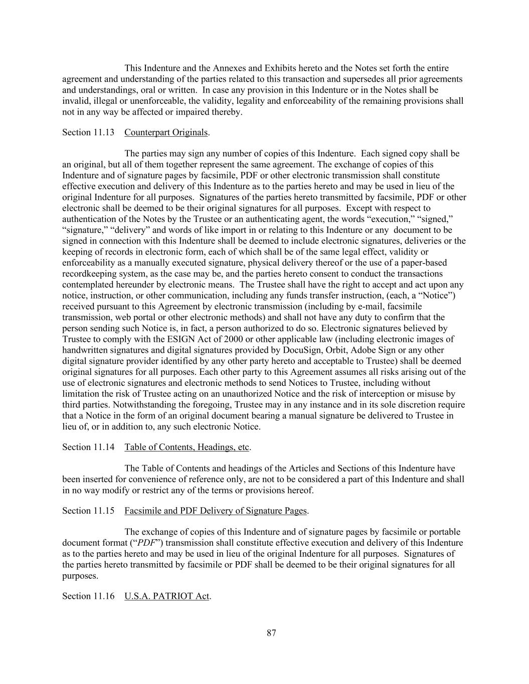 87 This Indenture and the Annexes and Exhibits hereto and the Notes set forth the entire agreement and understanding of the parties related to this transaction and supersedes all prior agreements and understandings, oral or written. In case any provision in this Indenture or in the Notes shall be invalid, illegal or unenforceable, the validity, legality and enforceability of the remaining provisions shall not in any way be affected or impaired thereby. Section 11.13 Counterpart Originals. The parties may sign any number of copies of this Indenture. Each signed copy shall be an original, but all of them together represent the same agreement. The exchange of copies of this Indenture and of signature pages by facsimile, PDF or other electronic transmission shall constitute effective execution and delivery of this Indenture as to the parties hereto and may be used in lieu of the original Indenture for all purposes. Signatures of the parties hereto transmitted by facsimile, PDF or other electronic shall be deemed to be their original signatures for all purposes. Except with respect to authentication of the Notes by the Trustee or an authenticating agent, the words “execution,” “signed,” “signature,” “delivery” and words of like import in or relating to this Indenture or any document to be signed in connection with this Indenture shall be deemed to include electronic signatures, deliveries or the keeping of records in electronic form, each of which shall be of the same legal effect, validity or enforceability as a manually executed signature, physical delivery thereof or the use of a paper-based recordkeeping system, as the case may be, and the parties hereto consent to conduct the transactions contemplated hereunder by electronic means. The Trustee shall have the right to accept and act upon any notice, instruction, or other communication, including any funds transfer instruction, (each, a “Notice”) received pursuant to this Agreement by electronic transmission (including by e-mail, facsimile transmission, web portal or other electronic methods) and shall not have any duty to confirm that the person sending such Notice is, in fact, a person authorized to do so. Electronic signatures believed by Trustee to comply with the ESIGN Act of 2000 or other applicable law (including electronic images of handwritten signatures and digital signatures provided by DocuSign, Orbit, Adobe Sign or any other digital signature provider identified by any other party hereto and acceptable to Trustee) shall be deemed original signatures for all purposes. Each other party to this Agreement assumes all risks arising out of the use of electronic signatures and electronic methods to send Notices to Trustee, including without limitation the risk of Trustee acting on an unauthorized Notice and the risk of interception or misuse by third parties. Notwithstanding the foregoing, Trustee may in any instance and in its sole discretion require that a Notice in the form of an original document bearing a manual signature be delivered to Trustee in lieu of, or in addition to, any such electronic Notice. Section 11.14 Table of Contents, Headings, etc. The Table of Contents and headings of the Articles and Sections of this Indenture have been inserted for convenience of reference only, are not to be considered a part of this Indenture and shall in no way modify or restrict any of the terms or provisions hereof. Section 11.15 Facsimile and PDF Delivery of Signature Pages. The exchange of copies of this Indenture and of signature pages by facsimile or portable document format (“PDF”) transmission shall constitute effective execution and delivery of this Indenture as to the parties hereto and may be used in lieu of the original Indenture for all purposes. Signatures of the parties hereto transmitted by facsimile or PDF shall be deemed to be their original signatures for all purposes. Section 11.16 U.S.A. PATRIOT Act.
