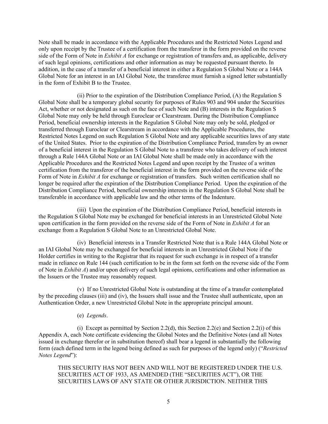 5 Note shall be made in accordance with the Applicable Procedures and the Restricted Notes Legend and only upon receipt by the Trustee of a certification from the transferor in the form provided on the reverse side of the Form of Note in Exhibit A for exchange or registration of transfers and, as applicable, delivery of such legal opinions, certifications and other information as may be requested pursuant thereto. In addition, in the case of a transfer of a beneficial interest in either a Regulation S Global Note or a 144A Global Note for an interest in an IAI Global Note, the transferee must furnish a signed letter substantially in the form of Exhibit B to the Trustee. (ii) Prior to the expiration of the Distribution Compliance Period, (A) the Regulation S Global Note shall be a temporary global security for purposes of Rules 903 and 904 under the Securities Act, whether or not designated as such on the face of such Note and (B) interests in the Regulation S Global Note may only be held through Euroclear or Clearstream. During the Distribution Compliance Period, beneficial ownership interests in the Regulation S Global Note may only be sold, pledged or transferred through Euroclear or Clearstream in accordance with the Applicable Procedures, the Restricted Notes Legend on such Regulation S Global Note and any applicable securities laws of any state of the United States. Prior to the expiration of the Distribution Compliance Period, transfers by an owner of a beneficial interest in the Regulation S Global Note to a transferee who takes delivery of such interest through a Rule 144A Global Note or an IAI Global Note shall be made only in accordance with the Applicable Procedures and the Restricted Notes Legend and upon receipt by the Trustee of a written certification from the transferor of the beneficial interest in the form provided on the reverse side of the Form of Note in Exhibit A for exchange or registration of transfers. Such written certification shall no longer be required after the expiration of the Distribution Compliance Period. Upon the expiration of the Distribution Compliance Period, beneficial ownership interests in the Regulation S Global Note shall be transferable in accordance with applicable law and the other terms of the Indenture. (iii) Upon the expiration of the Distribution Compliance Period, beneficial interests in the Regulation S Global Note may be exchanged for beneficial interests in an Unrestricted Global Note upon certification in the form provided on the reverse side of the Form of Note in Exhibit A for an exchange from a Regulation S Global Note to an Unrestricted Global Note. (iv) Beneficial interests in a Transfer Restricted Note that is a Rule 144A Global Note or an IAI Global Note may be exchanged for beneficial interests in an Unrestricted Global Note if the Holder certifies in writing to the Registrar that its request for such exchange is in respect of a transfer made in reliance on Rule 144 (such certification to be in the form set forth on the reverse side of the Form of Note in Exhibit A) and/or upon delivery of such legal opinions, certifications and other information as the Issuers or the Trustee may reasonably request. (v) If no Unrestricted Global Note is outstanding at the time of a transfer contemplated by the preceding clauses (iii) and (iv), the Issuers shall issue and the Trustee shall authenticate, upon an Authentication Order, a new Unrestricted Global Note in the appropriate principal amount. (e) Legends. (i) Except as permitted by Section 2.2(d), this Section 2.2(e) and Section 2.2(i) of this Appendix A, each Note certificate evidencing the Global Notes and the Definitive Notes (and all Notes issued in exchange therefor or in substitution thereof) shall bear a legend in substantially the following form (each defined term in the legend being defined as such for purposes of the legend only) (“Restricted Notes Legend”): THIS SECURITY HAS NOT BEEN AND WILL NOT BE REGISTERED UNDER THE U.S. SECURITIES ACT OF 1933, AS AMENDED (THE “SECURITIES ACT”), OR THE SECURITIES LAWS OF ANY STATE OR OTHER JURISDICTION. NEITHER THIS