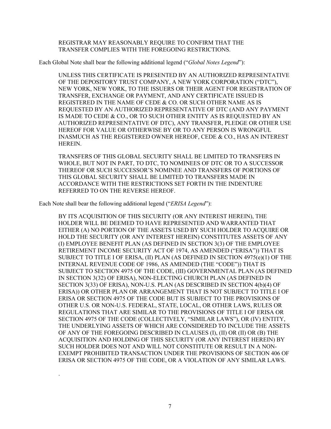 7 REGISTRAR MAY REASONABLY REQUIRE TO CONFIRM THAT THE TRANSFER COMPLIES WITH THE FOREGOING RESTRICTIONS. Each Global Note shall bear the following additional legend (“Global Notes Legend”): UNLESS THIS CERTIFICATE IS PRESENTED BY AN AUTHORIZED REPRESENTATIVE OF THE DEPOSITORY TRUST COMPANY, A NEW YORK CORPORATION (“DTC”), NEW YORK, NEW YORK, TO THE ISSUERS OR THEIR AGENT FOR REGISTRATION OF TRANSFER, EXCHANGE OR PAYMENT, AND ANY CERTIFICATE ISSUED IS REGISTERED IN THE NAME OF CEDE & CO. OR SUCH OTHER NAME AS IS REQUESTED BY AN AUTHORIZED REPRESENTATIVE OF DTC (AND ANY PAYMENT IS MADE TO CEDE & CO., OR TO SUCH OTHER ENTITY AS IS REQUESTED BY AN AUTHORIZED REPRESENTATIVE OF DTC), ANY TRANSFER, PLEDGE OR OTHER USE HEREOF FOR VALUE OR OTHERWISE BY OR TO ANY PERSON IS WRONGFUL INASMUCH AS THE REGISTERED OWNER HEREOF, CEDE & CO., HAS AN INTEREST HEREIN. TRANSFERS OF THIS GLOBAL SECURITY SHALL BE LIMITED TO TRANSFERS IN WHOLE, BUT NOT IN PART, TO DTC, TO NOMINEES OF DTC OR TO A SUCCESSOR THEREOF OR SUCH SUCCESSOR’S NOMINEE AND TRANSFERS OF PORTIONS OF THIS GLOBAL SECURITY SHALL BE LIMITED TO TRANSFERS MADE IN ACCORDANCE WITH THE RESTRICTIONS SET FORTH IN THE INDENTURE REFERRED TO ON THE REVERSE HEREOF. Each Note shall bear the following additional legend (“ERISA Legend”): BY ITS ACQUISITION OF THIS SECURITY (OR ANY INTEREST HEREIN), THE HOLDER WILL BE DEEMED TO HAVE REPRESENTED AND WARRANTED THAT EITHER (A) NO PORTION OF THE ASSETS USED BY SUCH HOLDER TO ACQUIRE OR HOLD THE SECURITY (OR ANY INTEREST HEREIN) CONSTITUTES ASSETS OF ANY (I) EMPLOYEE BENEFIT PLAN (AS DEFINED IN SECTION 3(3) OF THE EMPLOYEE RETIREMENT INCOME SECURITY ACT OF 1974, AS AMENDED (“ERISA”)) THAT IS SUBJECT TO TITLE I OF ERISA, (II) PLAN (AS DEFINED IN SECTION 4975(e)(1) OF THE INTERNAL REVENUE CODE OF 1986, AS AMENDED (THE “CODE”)) THAT IS SUBJECT TO SECTION 4975 OF THE CODE, (III) GOVERNMENTAL PLAN (AS DEFINED IN SECTION 3(32) OF ERISA), NON-ELECTING CHURCH PLAN (AS DEFINED IN SECTION 3(33) OF ERISA), NON-U.S. PLAN (AS DESCRIBED IN SECTION 4(b)(4) OF ERISA)) OR OTHER PLAN OR ARRANGEMENT THAT IS NOT SUBJECT TO TITLE I OF ERISA OR SECTION 4975 OF THE CODE BUT IS SUBJECT TO THE PROVISIONS OF OTHER U.S. OR NON-U.S. FEDERAL, STATE, LOCAL, OR OTHER LAWS, RULES OR REGULATIONS THAT ARE SIMILAR TO THE PROVISIONS OF TITLE I OF ERISA OR SECTION 4975 OF THE CODE (COLLECTIVELY, “SIMILAR LAWS”), OR (IV) ENTITY, THE UNDERLYING ASSETS OF WHICH ARE CONSIDERED TO INCLUDE THE ASSETS OF ANY OF THE FOREGOING DESCRIBED IN CLAUSES (I), (II) OR (II) OR (B) THE ACQUISITION AND HOLDING OF THIS SECURITY (OR ANY INTEREST HEREIN) BY SUCH HOLDER DOES NOT AND WILL NOT CONSTITUTE OR RESULT IN A NON- EXEMPT PROHIBITED TRANSACTION UNDER THE PROVISIONS OF SECTION 406 OF ERISA OR SECTION 4975 OF THE CODE, OR A VIOLATION OF ANY SIMILAR LAWS. .