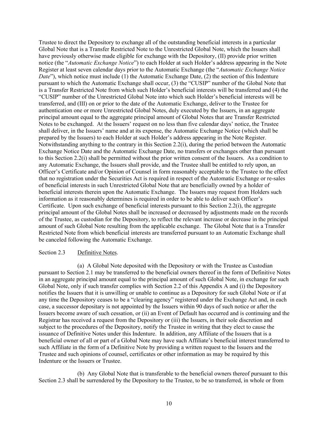 10 Trustee to direct the Depository to exchange all of the outstanding beneficial interests in a particular Global Note that is a Transfer Restricted Note to the Unrestricted Global Note, which the Issuers shall have previously otherwise made eligible for exchange with the Depository, (II) provide prior written notice (the “Automatic Exchange Notice”) to each Holder at such Holder’s address appearing in the Note Register at least seven calendar days prior to the Automatic Exchange (the “Automatic Exchange Notice Date”), which notice must include (1) the Automatic Exchange Date, (2) the section of this Indenture pursuant to which the Automatic Exchange shall occur, (3) the “CUSIP” number of the Global Note that is a Transfer Restricted Note from which such Holder’s beneficial interests will be transferred and (4) the “CUSIP” number of the Unrestricted Global Note into which such Holder’s beneficial interests will be transferred, and (III) on or prior to the date of the Automatic Exchange, deliver to the Trustee for authentication one or more Unrestricted Global Notes, duly executed by the Issuers, in an aggregate principal amount equal to the aggregate principal amount of Global Notes that are Transfer Restricted Notes to be exchanged. At the Issuers’ request on no less than five calendar days’ notice, the Trustee shall deliver, in the Issuers’ name and at its expense, the Automatic Exchange Notice (which shall be prepared by the Issuers) to each Holder at such Holder’s address appearing in the Note Register. Notwithstanding anything to the contrary in this Section 2.2(i), during the period between the Automatic Exchange Notice Date and the Automatic Exchange Date, no transfers or exchanges other than pursuant to this Section 2.2(i) shall be permitted without the prior written consent of the Issuers. As a condition to any Automatic Exchange, the Issuers shall provide, and the Trustee shall be entitled to rely upon, an Officer’s Certificate and/or Opinion of Counsel in form reasonably acceptable to the Trustee to the effect that no registration under the Securities Act is required in respect of the Automatic Exchange or re-sales of beneficial interests in such Unrestricted Global Note that are beneficially owned by a holder of beneficial interests therein upon the Automatic Exchange. The Issuers may request from Holders such information as it reasonably determines is required in order to be able to deliver such Officer’s Certificate. Upon such exchange of beneficial interests pursuant to this Section 2.2(i), the aggregate principal amount of the Global Notes shall be increased or decreased by adjustments made on the records of the Trustee, as custodian for the Depository, to reflect the relevant increase or decrease in the principal amount of such Global Note resulting from the applicable exchange. The Global Note that is a Transfer Restricted Note from which beneficial interests are transferred pursuant to an Automatic Exchange shall be canceled following the Automatic Exchange. Section 2.3 Definitive Notes. (a) A Global Note deposited with the Depository or with the Trustee as Custodian pursuant to Section 2.1 may be transferred to the beneficial owners thereof in the form of Definitive Notes in an aggregate principal amount equal to the principal amount of such Global Note, in exchange for such Global Note, only if such transfer complies with Section 2.2 of this Appendix A and (i) the Depository notifies the Issuers that it is unwilling or unable to continue as a Depository for such Global Note or if at any time the Depository ceases to be a “clearing agency” registered under the Exchange Act and, in each case, a successor depositary is not appointed by the Issuers within 90 days of such notice or after the Issuers become aware of such cessation, or (ii) an Event of Default has occurred and is continuing and the Registrar has received a request from the Depository or (iii) the Issuers, in their sole discretion and subject to the procedures of the Depository, notify the Trustee in writing that they elect to cause the issuance of Definitive Notes under this Indenture. In addition, any Affiliate of the Issuers that is a beneficial owner of all or part of a Global Note may have such Affiliate’s beneficial interest transferred to such Affiliate in the form of a Definitive Note by providing a written request to the Issuers and the Trustee and such opinions of counsel, certificates or other information as may be required by this Indenture or the Issuers or Trustee. (b) Any Global Note that is transferable to the beneficial owners thereof pursuant to this Section 2.3 shall be surrendered by the Depository to the Trustee, to be so transferred, in whole or from
