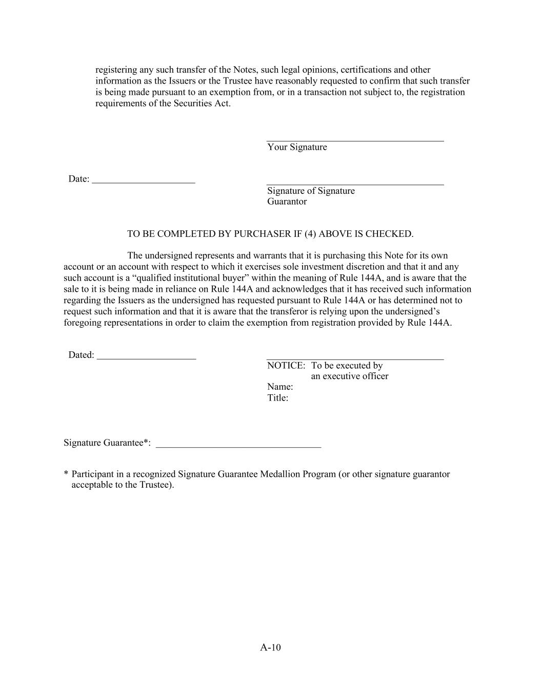 A-10 registering any such transfer of the Notes, such legal opinions, certifications and other information as the Issuers or the Trustee have reasonably requested to confirm that such transfer is being made pursuant to an exemption from, or in a transaction not subject to, the registration requirements of the Securities Act. Your Signature Date: Signature of Signature Guarantor TO BE COMPLETED BY PURCHASER IF (4) ABOVE IS CHECKED. The undersigned represents and warrants that it is purchasing this Note for its own account or an account with respect to which it exercises sole investment discretion and that it and any such account is a “qualified institutional buyer” within the meaning of Rule 144A, and is aware that the sale to it is being made in reliance on Rule 144A and acknowledges that it has received such information regarding the Issuers as the undersigned has requested pursuant to Rule 144A or has determined not to request such information and that it is aware that the transferor is relying upon the undersigned’s foregoing representations in order to claim the exemption from registration provided by Rule 144A. Dated: NOTICE: To be executed by an executive officer Name: Title: Signature Guarantee*: __________________________________ * Participant in a recognized Signature Guarantee Medallion Program (or other signature guarantor acceptable to the Trustee).