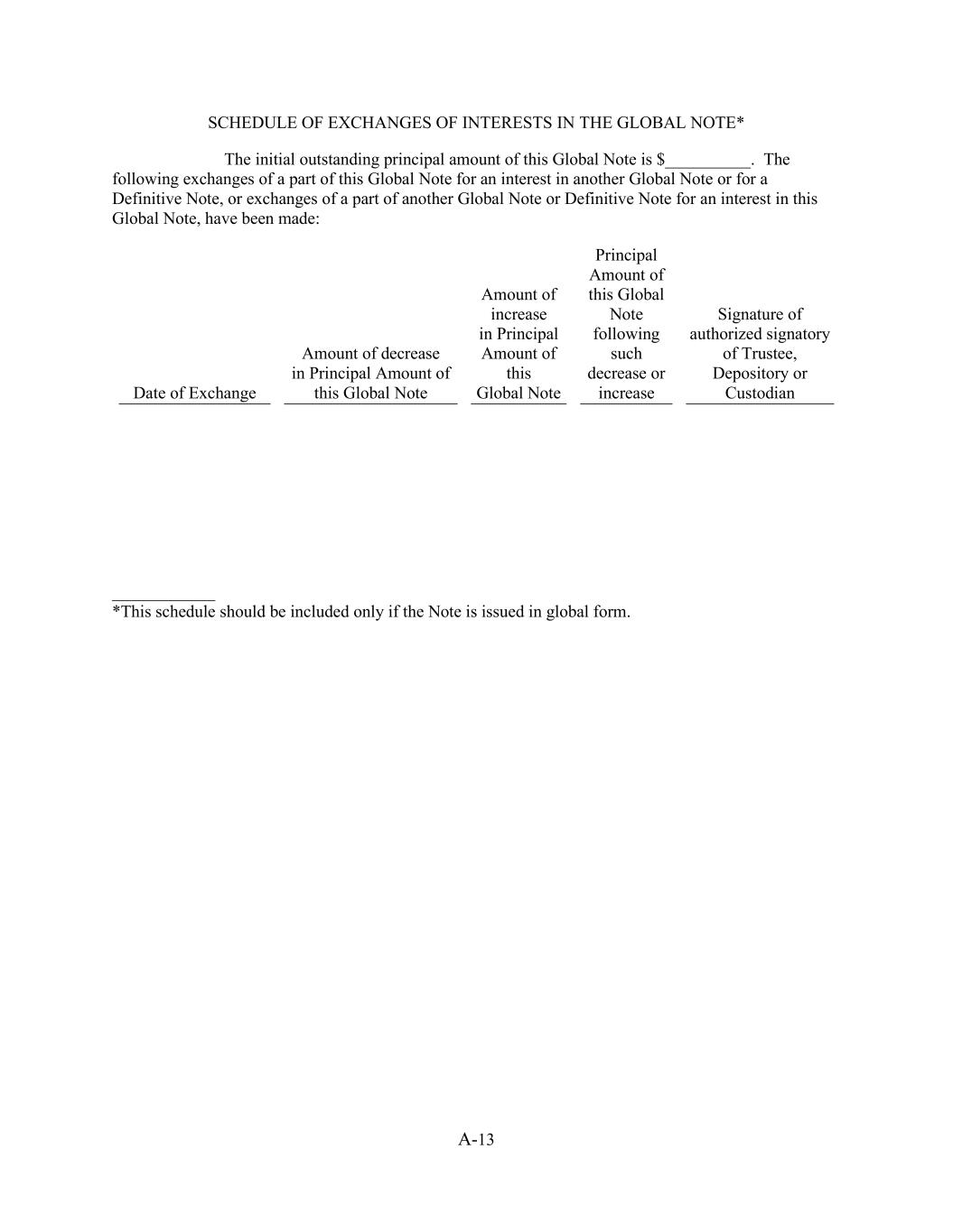 A-13 SCHEDULE OF EXCHANGES OF INTERESTS IN THE GLOBAL NOTE* The initial outstanding principal amount of this Global Note is $__________. The following exchanges of a part of this Global Note for an interest in another Global Note or for a Definitive Note, or exchanges of a part of another Global Note or Definitive Note for an interest in this Global Note, have been made: Date of Exchange Amount of decrease in Principal Amount of this Global Note Amount of increase in Principal Amount of this Global Note Principal Amount of this Global Note following such decrease or increase Signature of authorized signatory of Trustee, Depository or Custodian ____________ *This schedule should be included only if the Note is issued in global form.