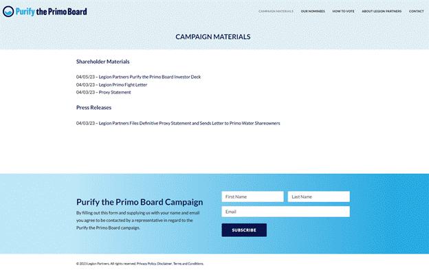 | · | Attacks on Shareowner Rights – Primo’s Board has weaponized its bylaws in an attempt to invalidate Legion Partners’ nomination of Mr. Jelert and Ms. Marcus, by implementing new, restrictive provisions that have deprived investors the right to vote for these highly-qualified director candidates. It has also forced Legion Partners to seek legal remedies in the Ontario Superior Court of Justice (the “Court”). The matter is slated to be heard by the Court on May 1, 2023 – just two days prior to Primo’s scheduled Annual and Special Meeting of Shareowners on May 3, 2023. Primo has rejected a request from Legion Partners to delay the meeting until the matter can be resolved. |